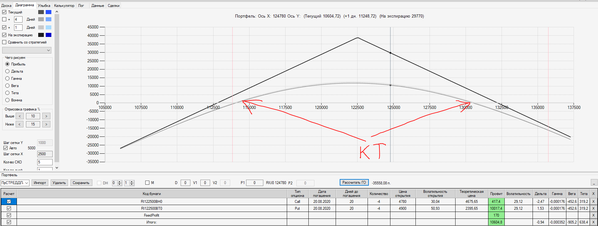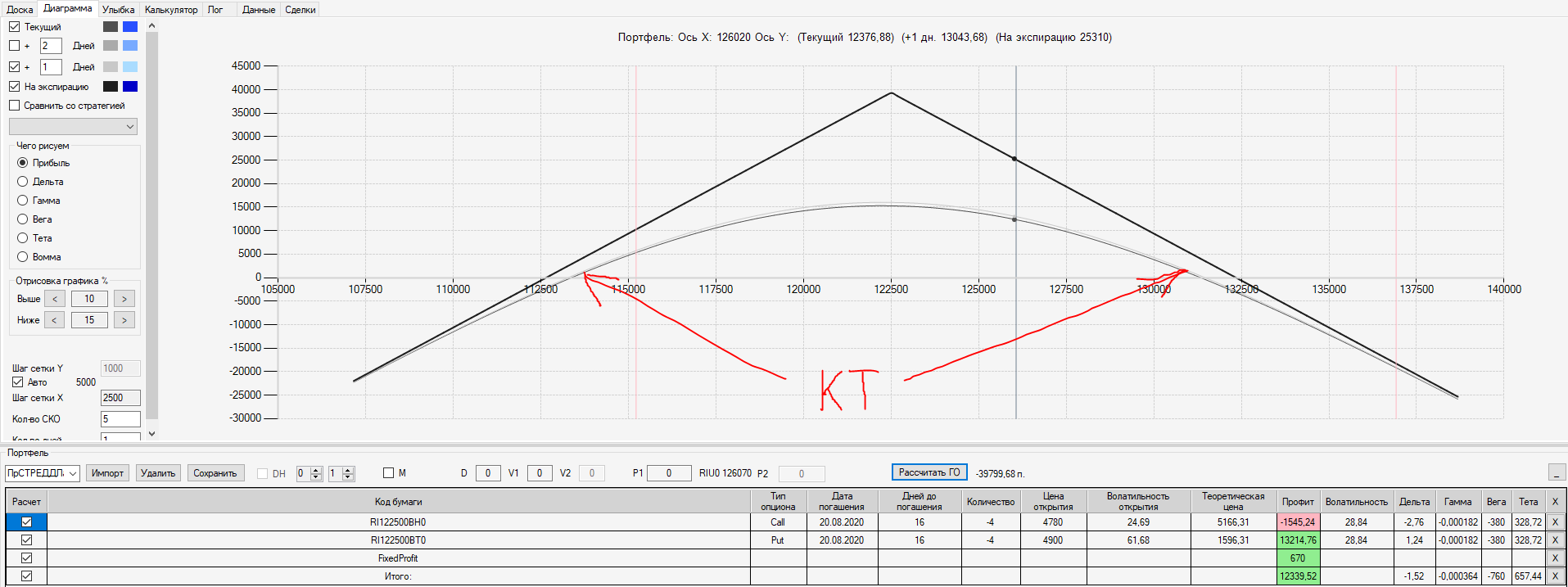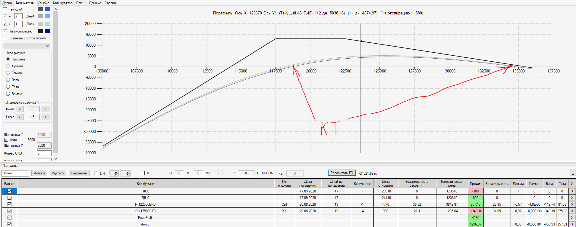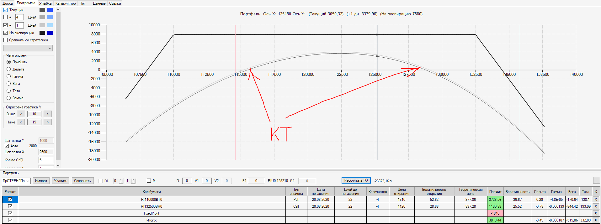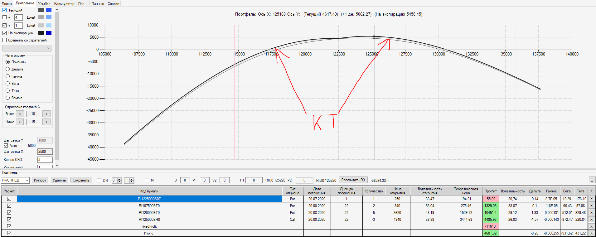 Например, мы ввели страховку недельными опционами и профиль получается нормальный. Но если мы оставляем эту страховку до экспирации (цена за это время будет находится в диапазоне 127500 - 132500), то может получиться, что страховку мы закрываем с прибылью, а профиль оставшейся позиции может оказаться в "-" (((. Предположим, что Текущая Цена БА на экспирацию будет 131410 пунктов. По профилю на экспирацию (+4 дня) Аналитик показывает прибыль. А после экспирации опциона уже показывает убыток (без учёта прибыли опциона). Опцион стоимостью 320 пунктов, допустим, не компенсирует своей прибылью убыток. Значит надо начинать управлять ОК уже тогда, когда профиль позиции (без учёта страховки недельными опционами)  приближается к "0"? И надеяться только на такую страховку (недельными опционами, в случае оставления их до экспирации) нельзя, необходимо добавлять месячные опционы?