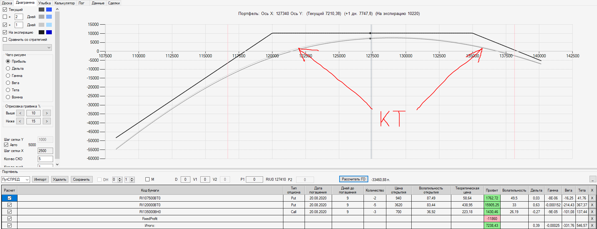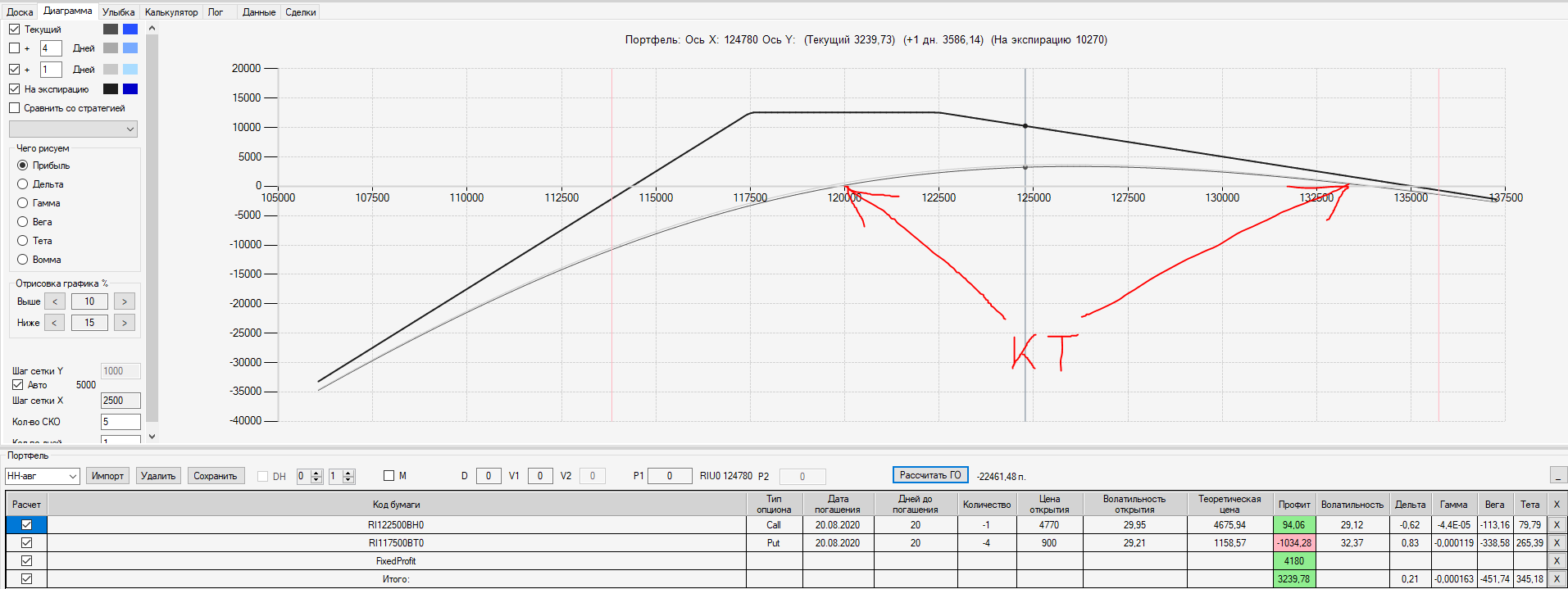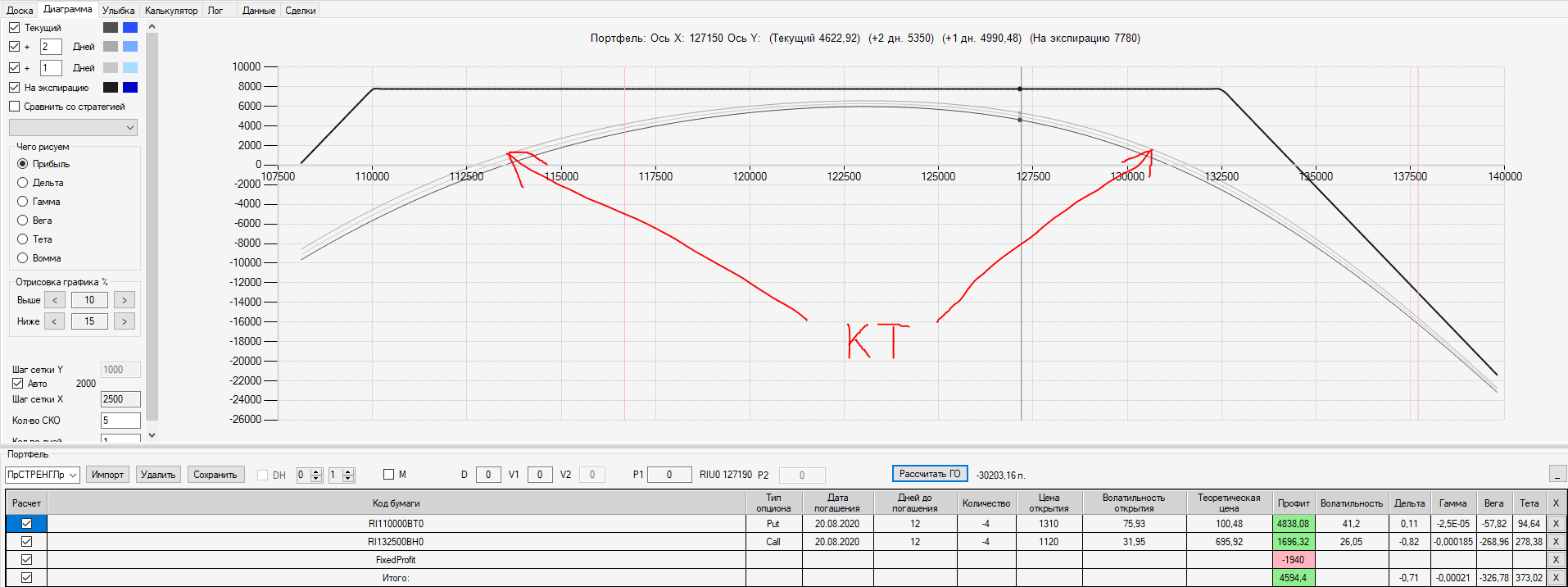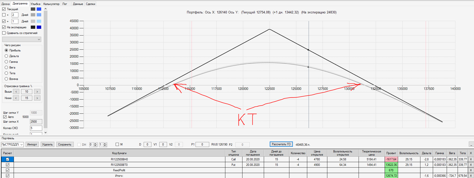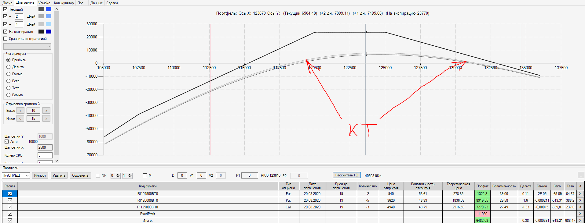 Например, мы ввели страховку недельными опционами и профиль получается нормальный. Но если мы оставляем эту страховку до экспирации (цена за это время будет находится в диапазоне 127500 - 132500), то может получиться, что страховку мы закрываем с прибылью, а профиль оставшейся позиции может оказаться в "-" (((. Предположим, что Текущая Цена БА на экспирацию будет 131410 пунктов. По профилю на экспирацию (+4 дня) Аналитик показывает прибыль. А после экспирации опциона уже показывает убыток (без учёта прибыли опциона). Опцион стоимостью 320 пунктов, допустим, не компенсирует своей прибылью убыток. Значит надо начинать управлять ОК уже тогда, когда профиль позиции (без учёта страховки недельными опционами)  приближается к "0"? И надеяться только на такую страховку (недельными опционами, в случае оставления их до экспирации) нельзя, необходимо добавлять месячные опционы?