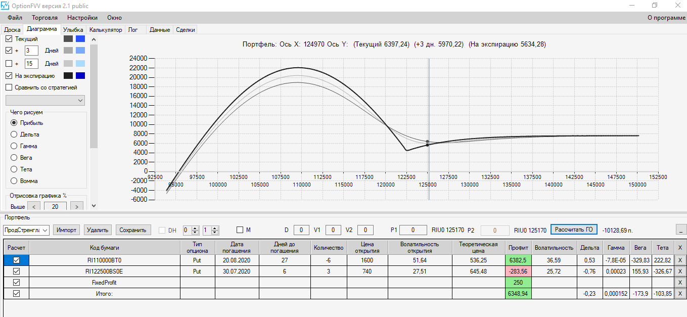 Хочу попробовать разные варианты Управления ОК. Я понимаю что здесь разные даты Экспирации и надо с этим быть внимательным. (Хочу посмотреть какой будет Профиль ОК при поступательном переходе на короткие опционы в течение месяца). И хотелось бы проверить насколько данные Аналитика Опционов, помогут при реальной торговле на Квике. И насколько значения строки ИТОГ будет соответствовать профиту/убытку при реальной торговле в Квике. Пока все соответствует тому что Аналитик Опционов демонстрирует, и естественно - помогает ориентироваться что может ждать трейджера при разных опционах и разной Экспирации. И очень в этом случае помогают рекомендации Дмитрия, о которых он говорит на своих занятиях.Полезный Аналитик Опционов.