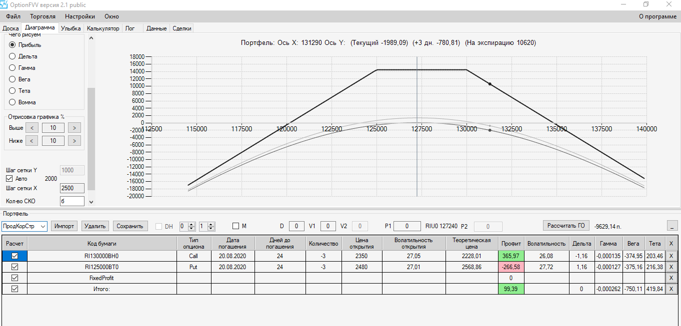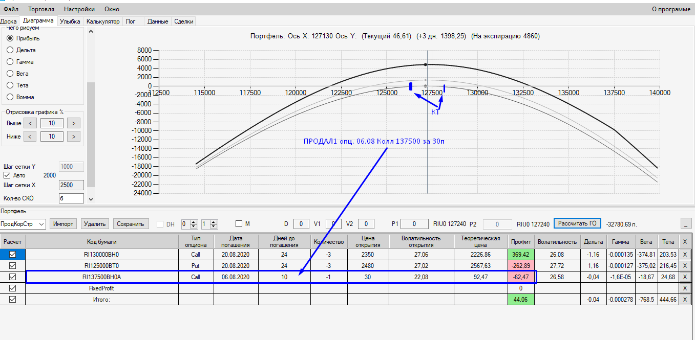 - Почему купил Колл132500п (его можно было и не покупать), но мне показалось что будет лучше если правая сторона будет прямая и не будет "угрожать" резким падением вниз (Хотя помню о возможности РЕЗКОГО падения цены вниз СЛЕВА, и медленного ПОДЪЕМА цены вверх - в жизни).