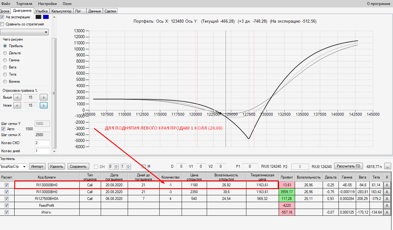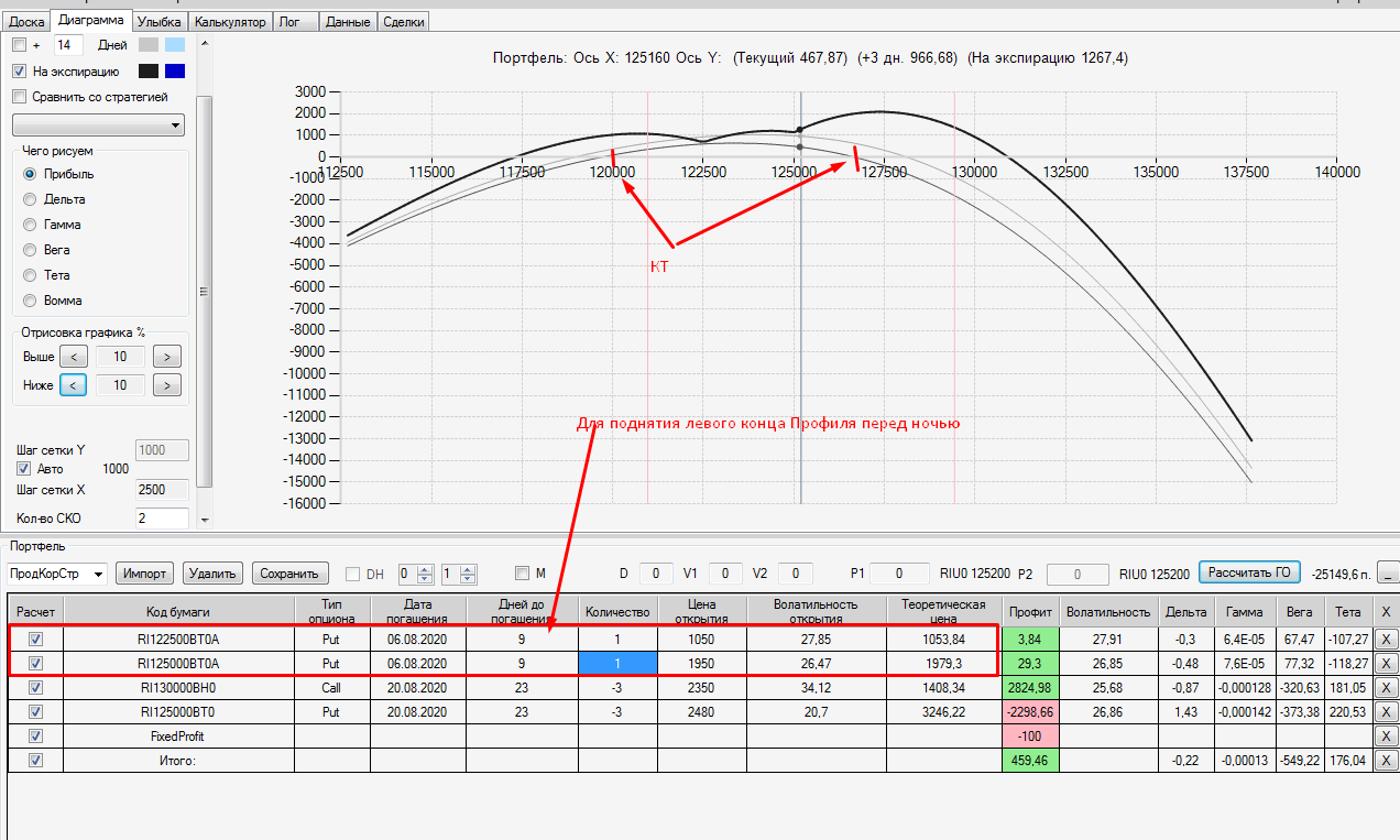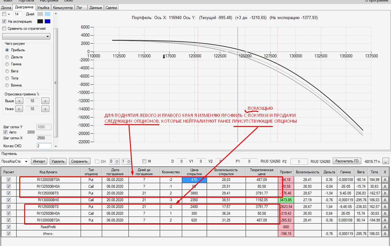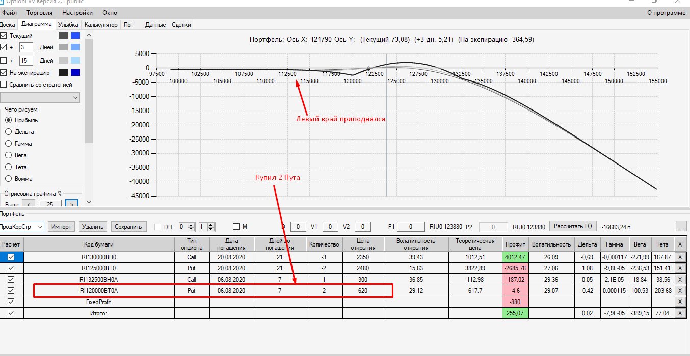 Я сперва торопился.. ставил опцион и сразу сохранял его отдельной строкой в профиле, далее с доски опционов ставил премию опциона в уже только что сохранённый мной опцион и опять нажимал на сохранение, в итоге получалось двойная страховка, и профиль общий ухудшался.