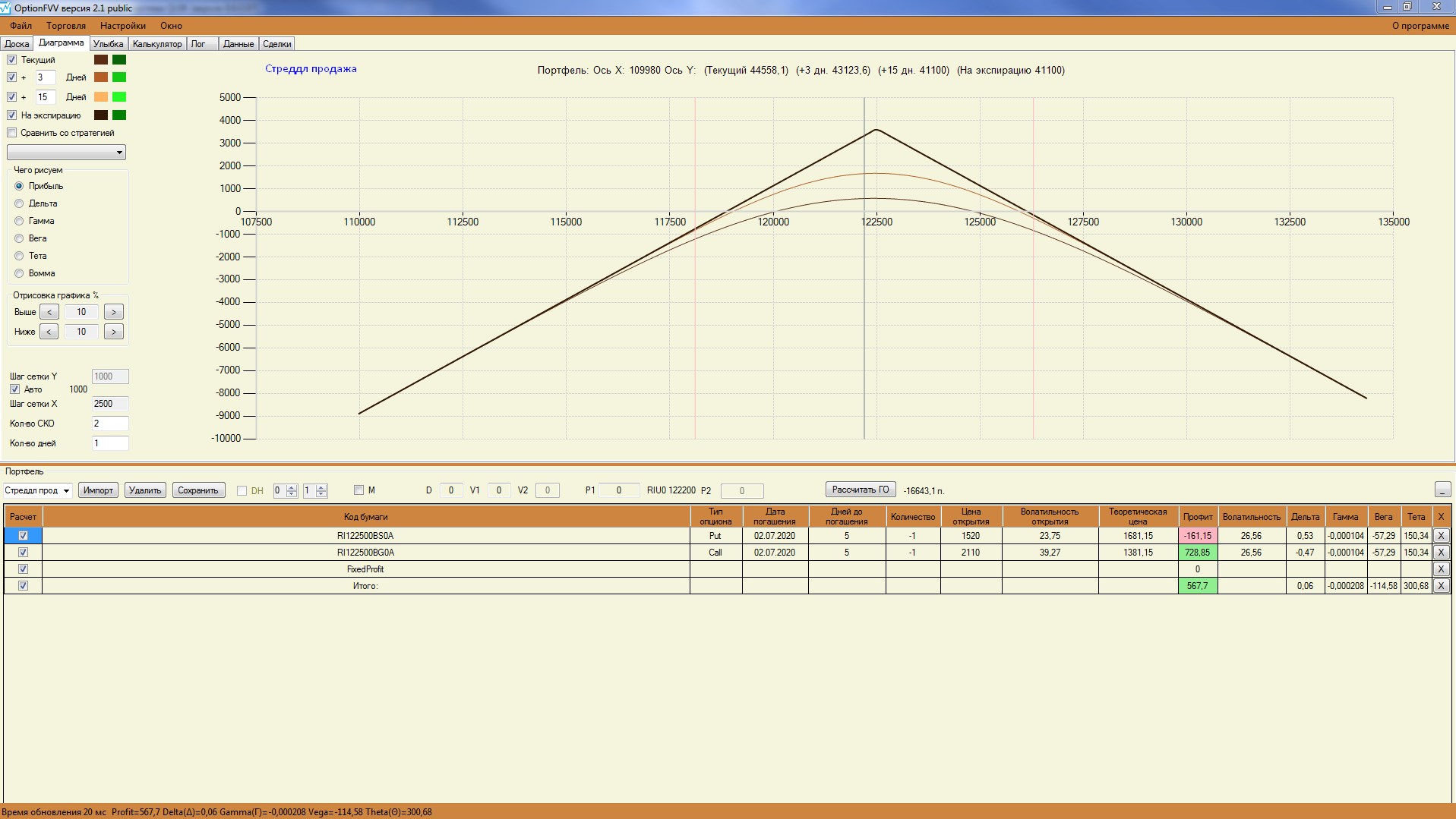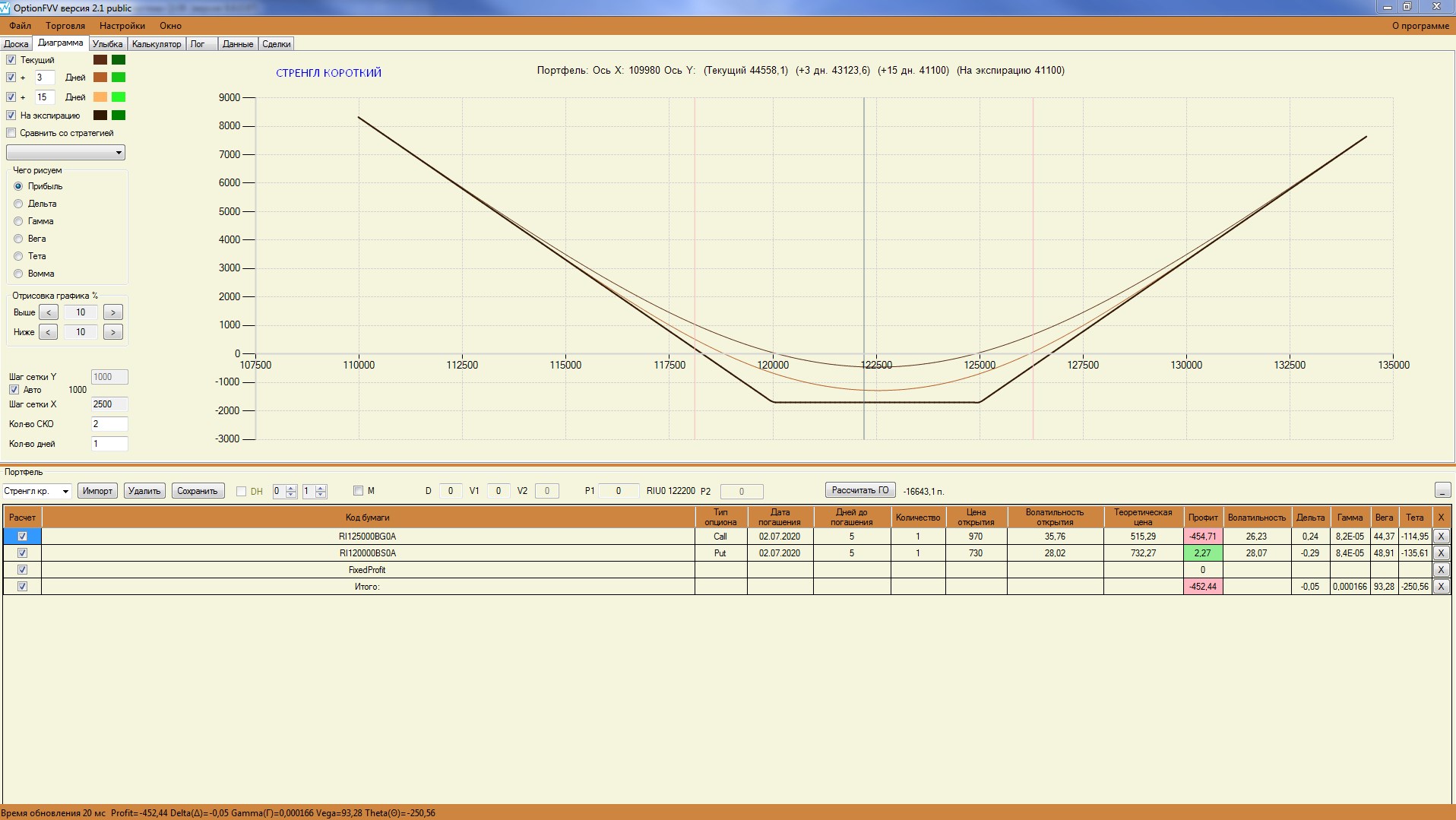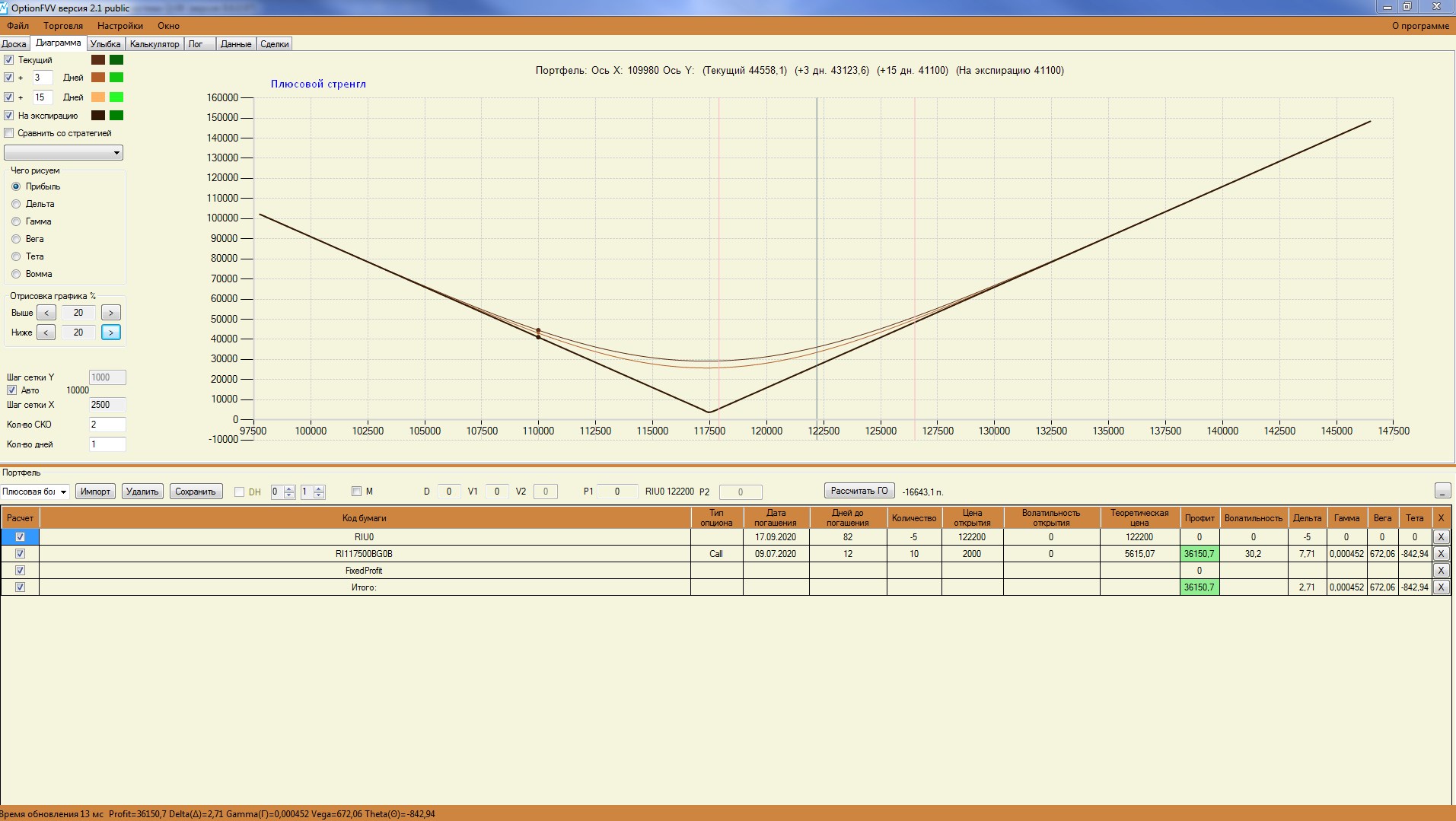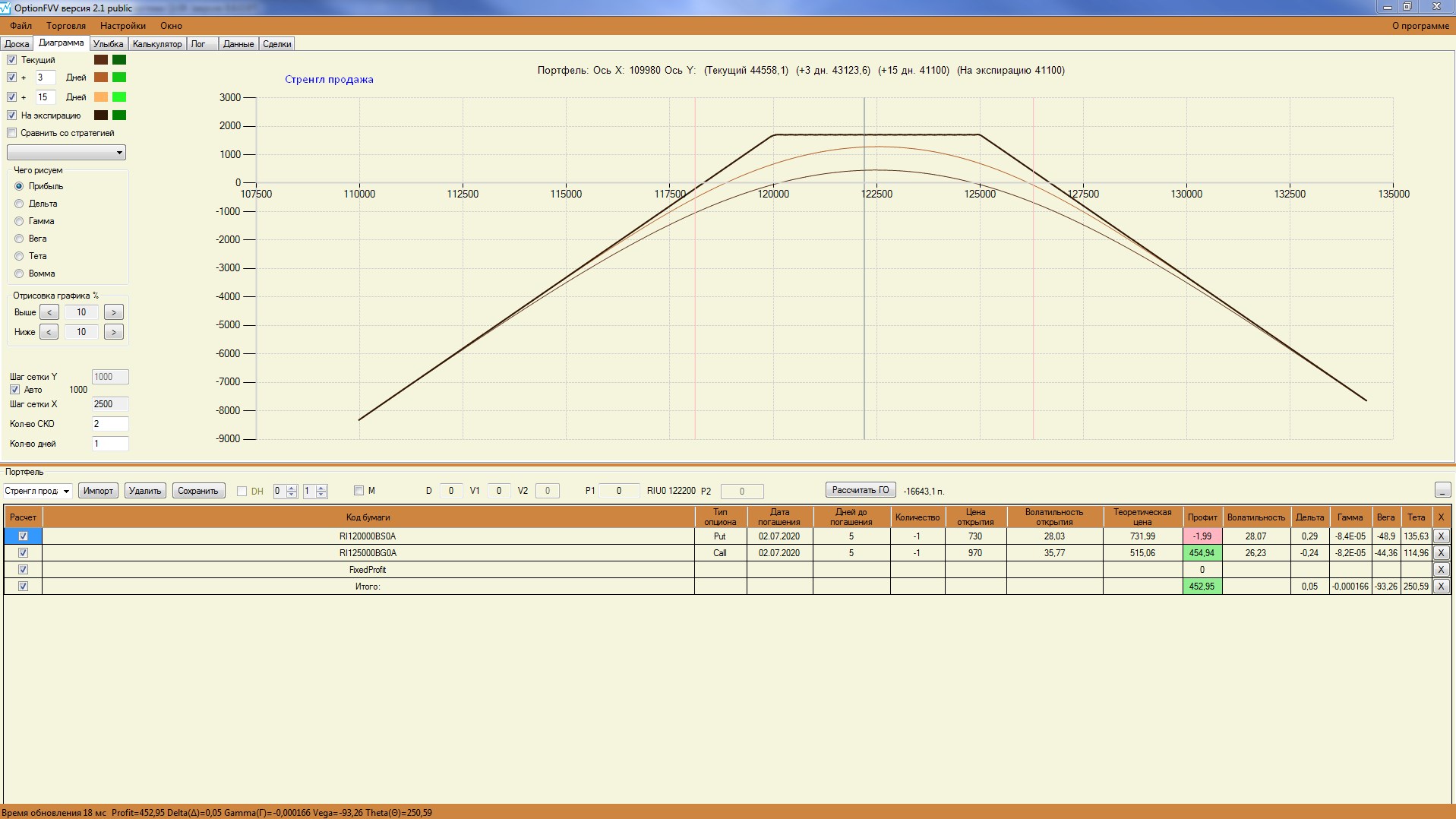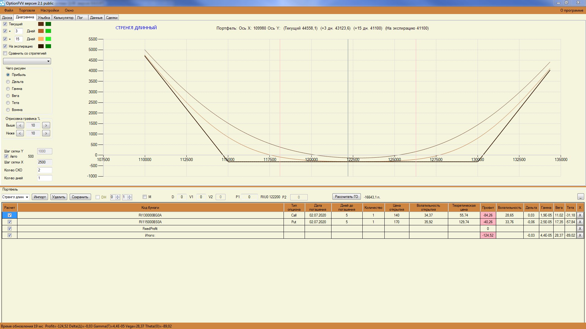для комфортного управления конструкцией "проданный стренгл", приучайтесь сразу строить подобную конструкцию минимум по три опциона продавать с каждой стороны, на это нужно 100 000 рублей на депозит.