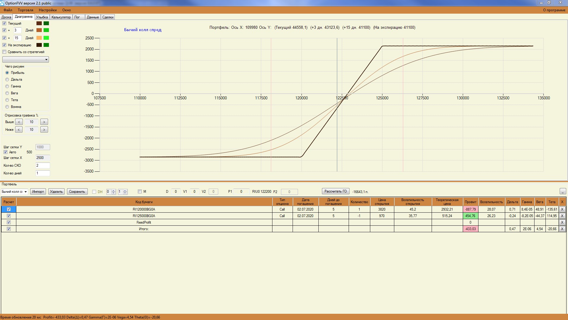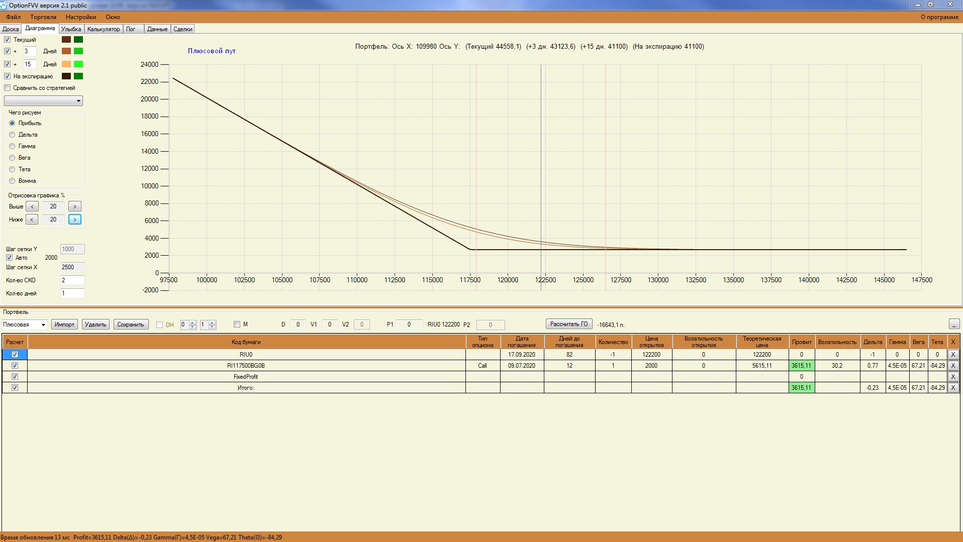 А, в конструкции пут-спред (кол-спред), депозита достаточно и 50 000 рублей, и старайтесь собирать, чтоб у спредов профит под шапкой был примерно в два и более раза выше, чем его убыточная часть (если смотреть линию на экспирацию)