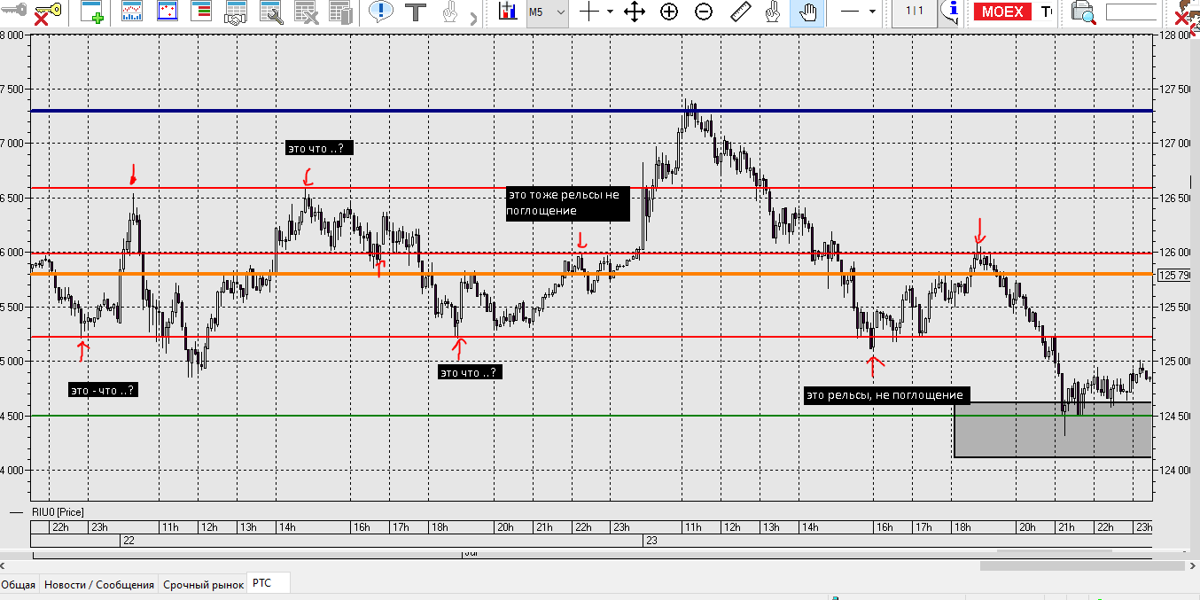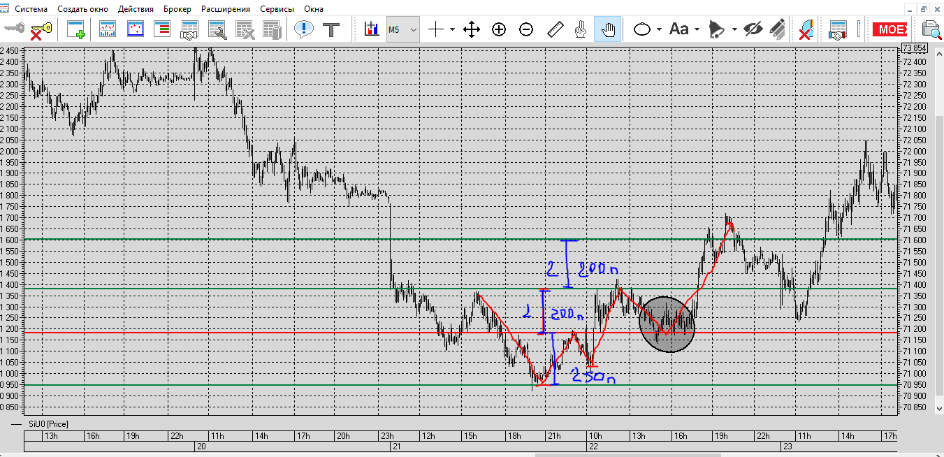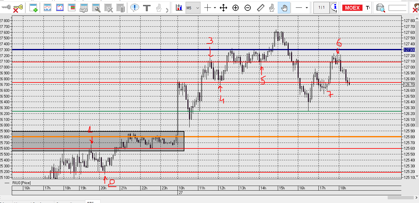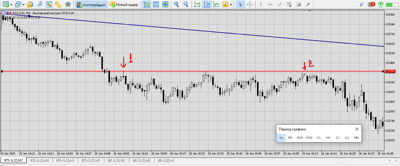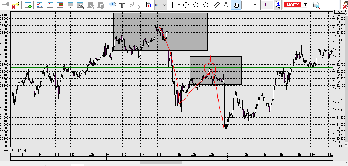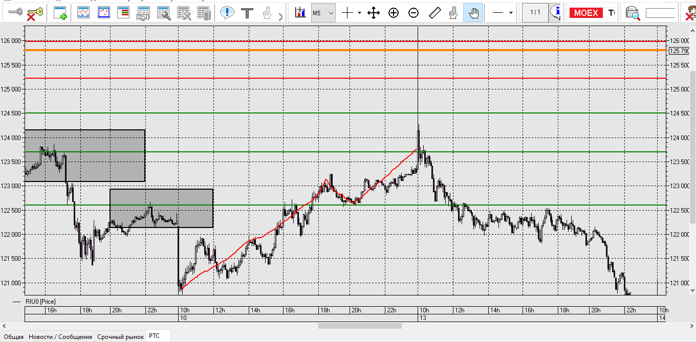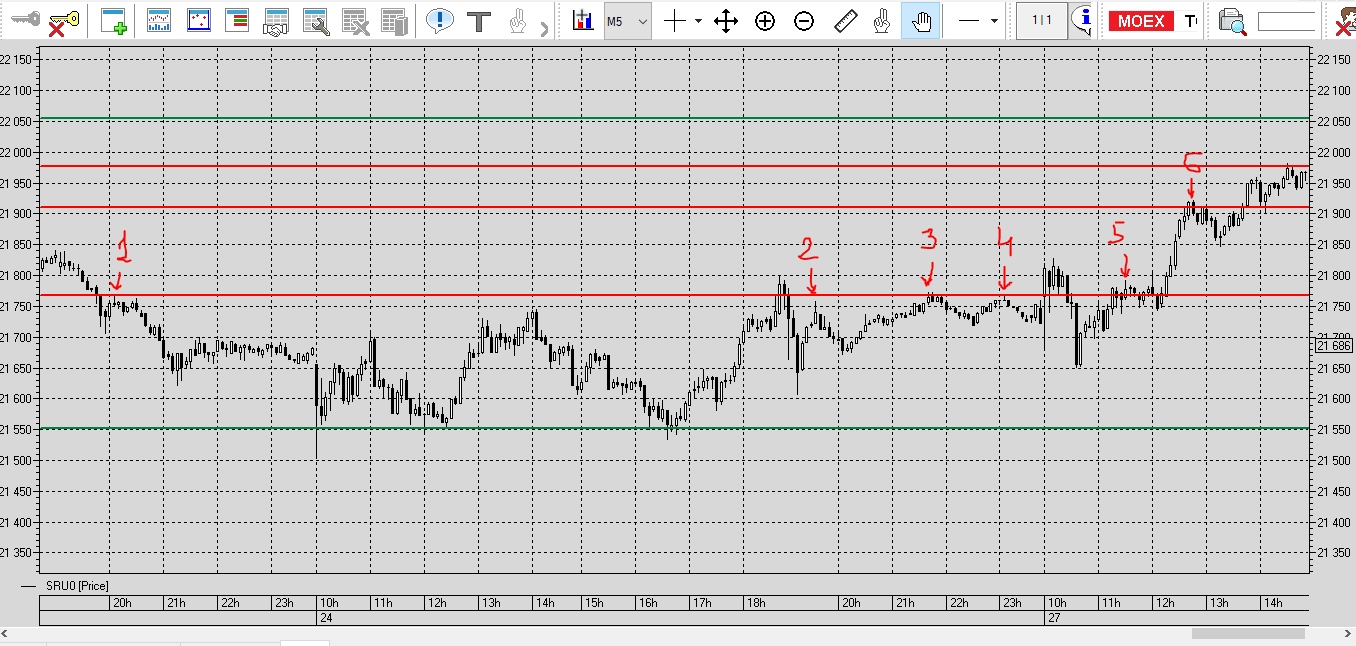 Локальный уровень на М5 Красным цветом, цена отбивается от уровней, через свечную модель