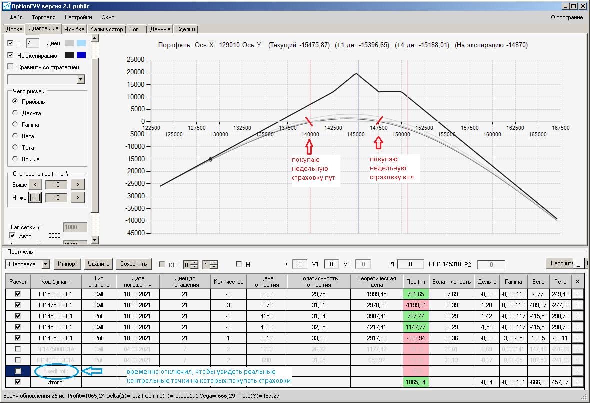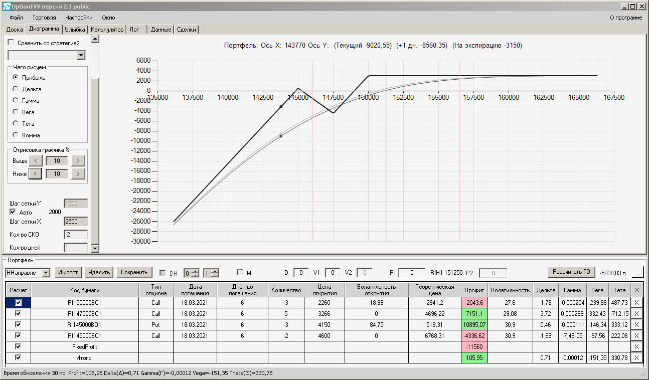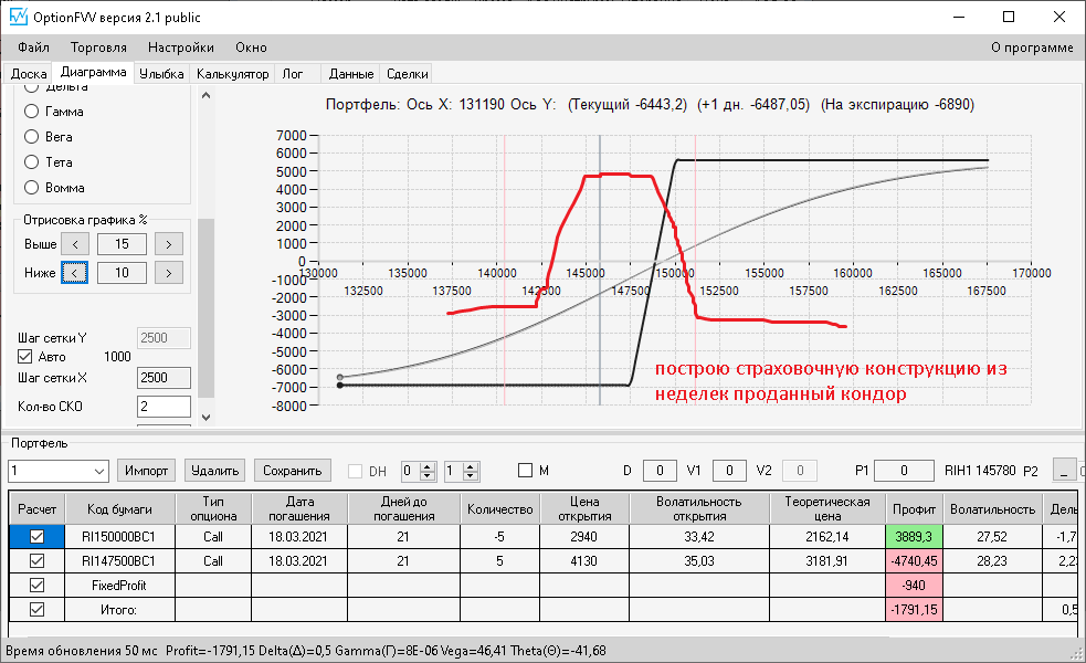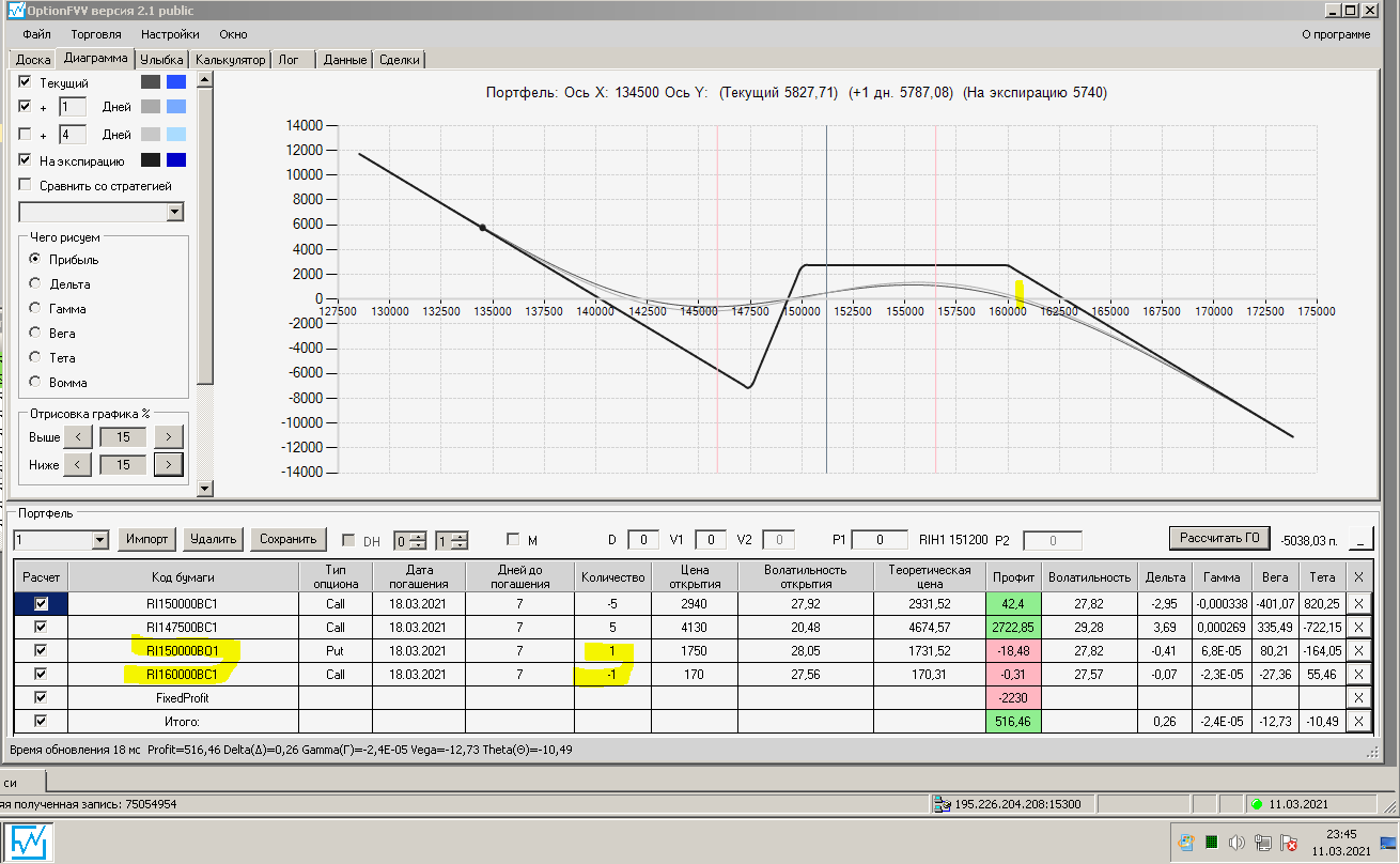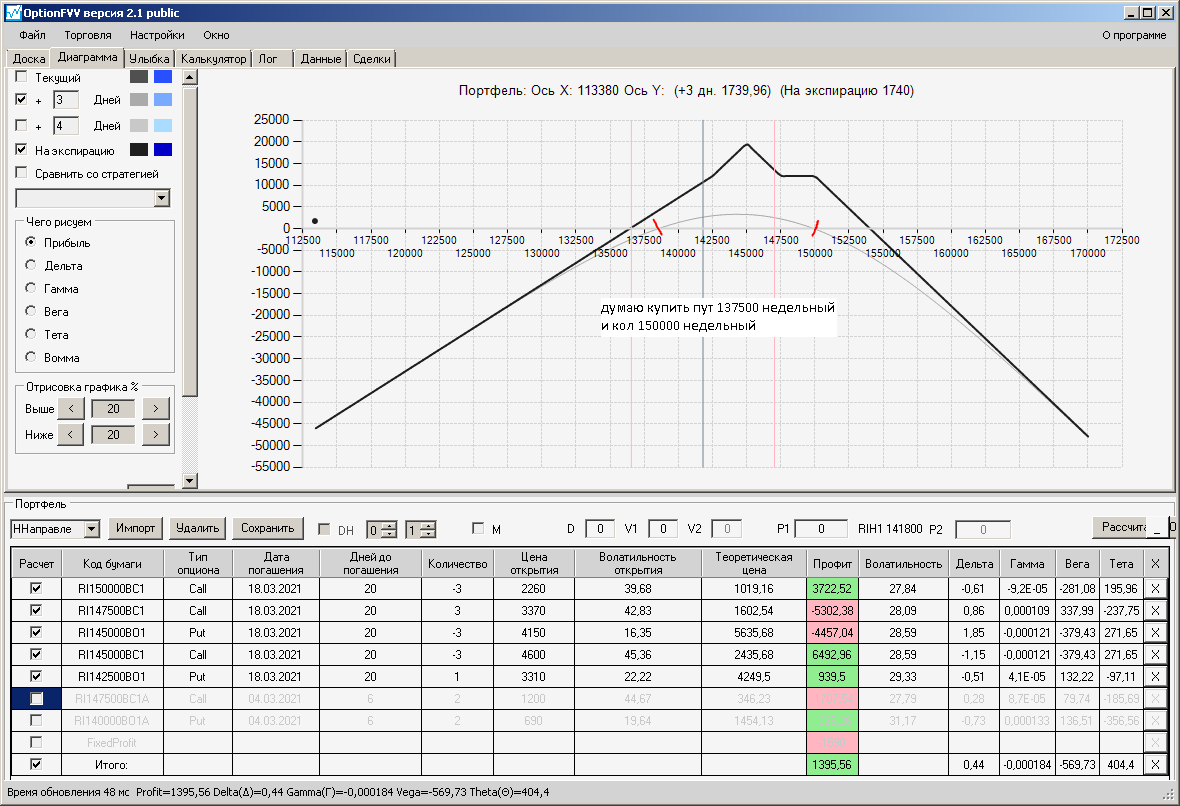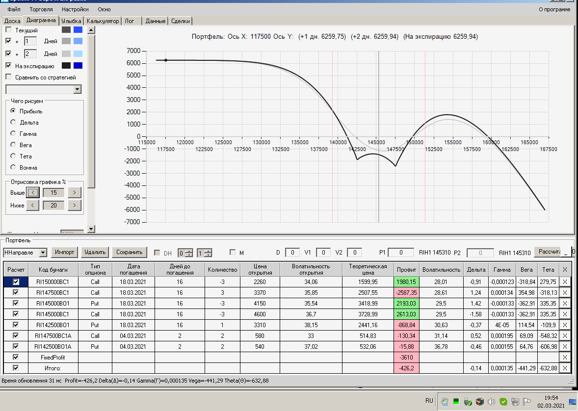 целый месяц конструкция локально давала убыток от страховок, так как фьючерс не хотел идти вверх, А сейчас когда осталась одна неделя до экспирации профиля, фьючерс начал движение вверх, хочу на этом заработать, поэтому не стал закрывать конструкцию с минимальным 600 п. прибыли, а застраховал от снижения двумя опцимонами, купил один пут 150 страйка, и снизил его стоимость продал справа один кол 160 страйка, чтоб был запас до правой КТ около 10 000 пунктов.