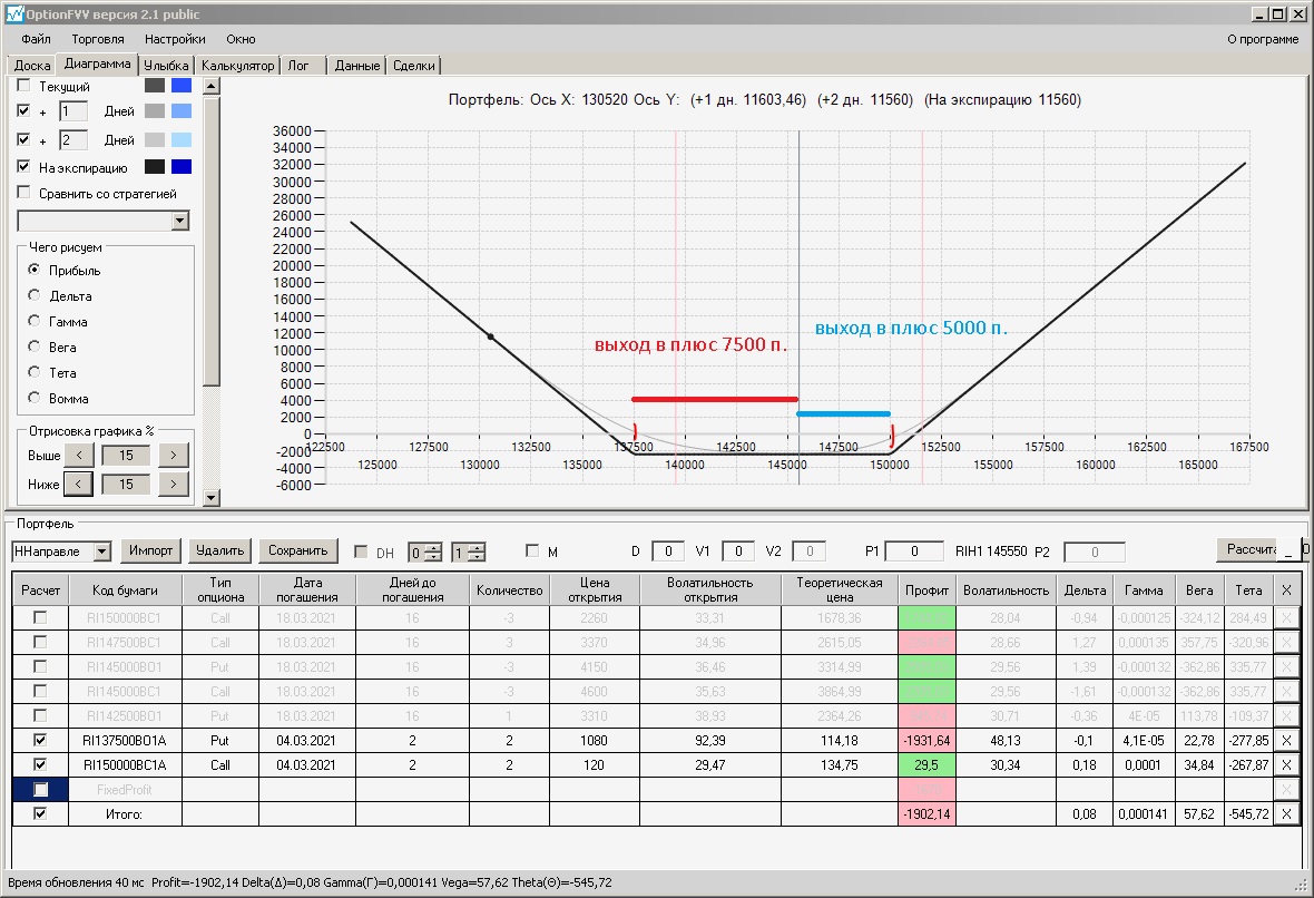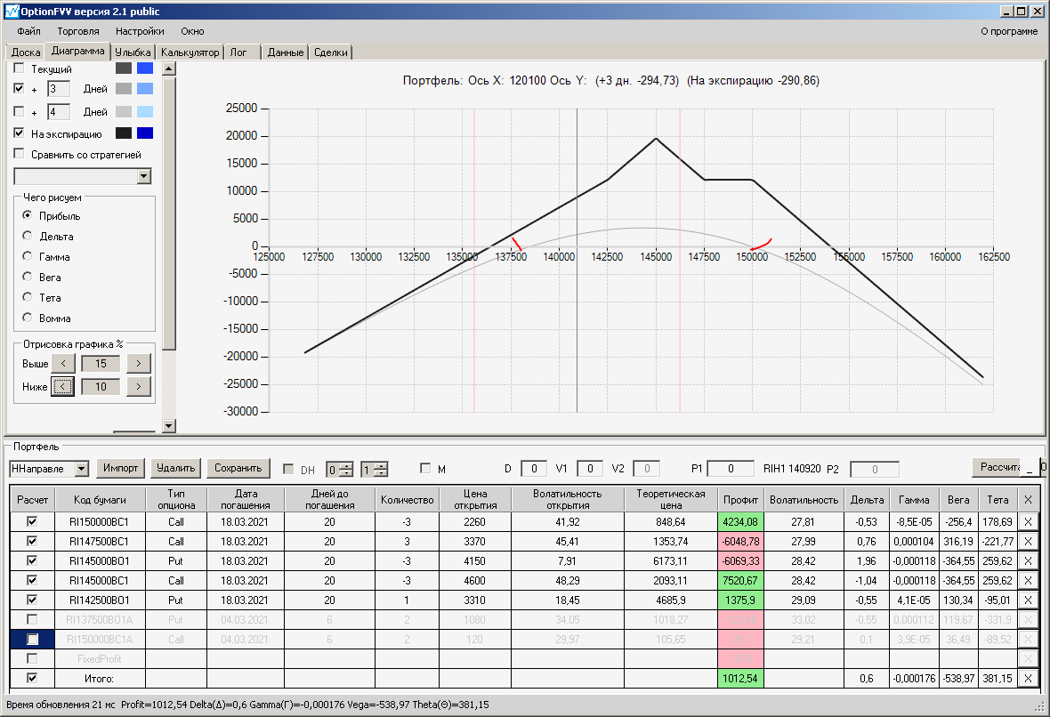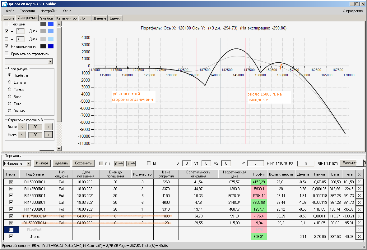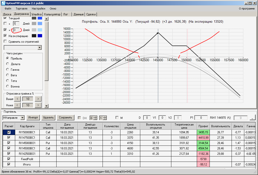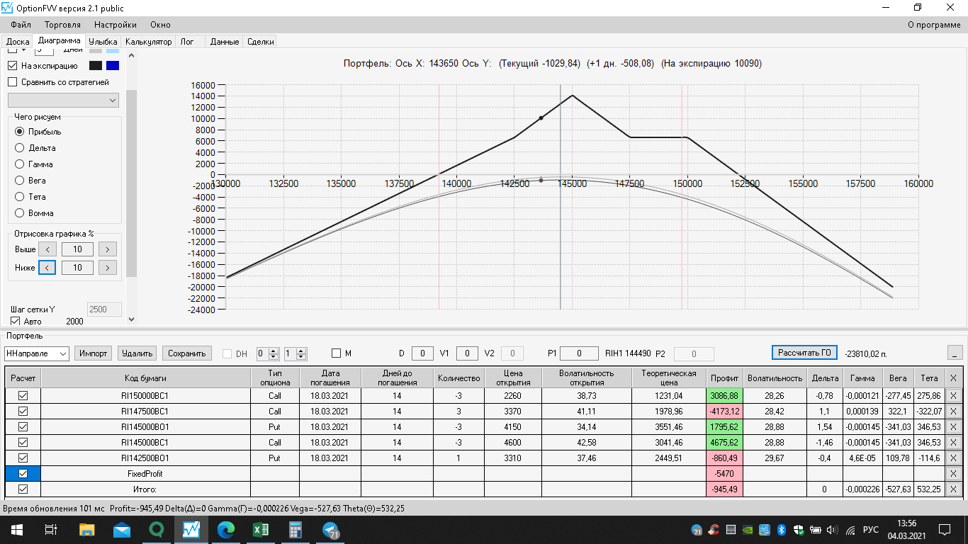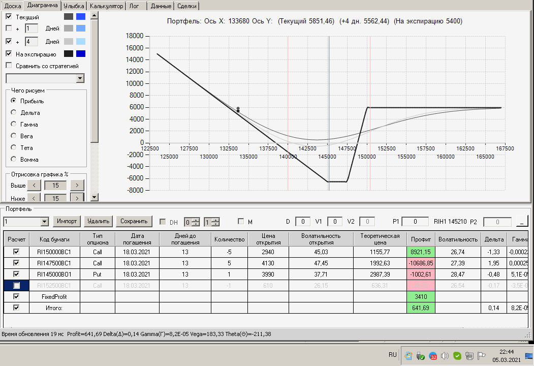 целый месяц конструкция локально давала убыток от страховок, так как фьючерс не хотел идти вверх, А сейчас когда осталась одна неделя до экспирации профиля, фьючерс начал движение вверх, хочу на этом заработать, поэтому не стал закрывать конструкцию с минимальным 600 п. прибыли, а застраховал от снижения двумя опцимонами, купил один пут 150 страйка, и снизил его стоимость продал справа один кол 160 страйка, чтоб был запас до правой КТ около 10 000 пунктов.