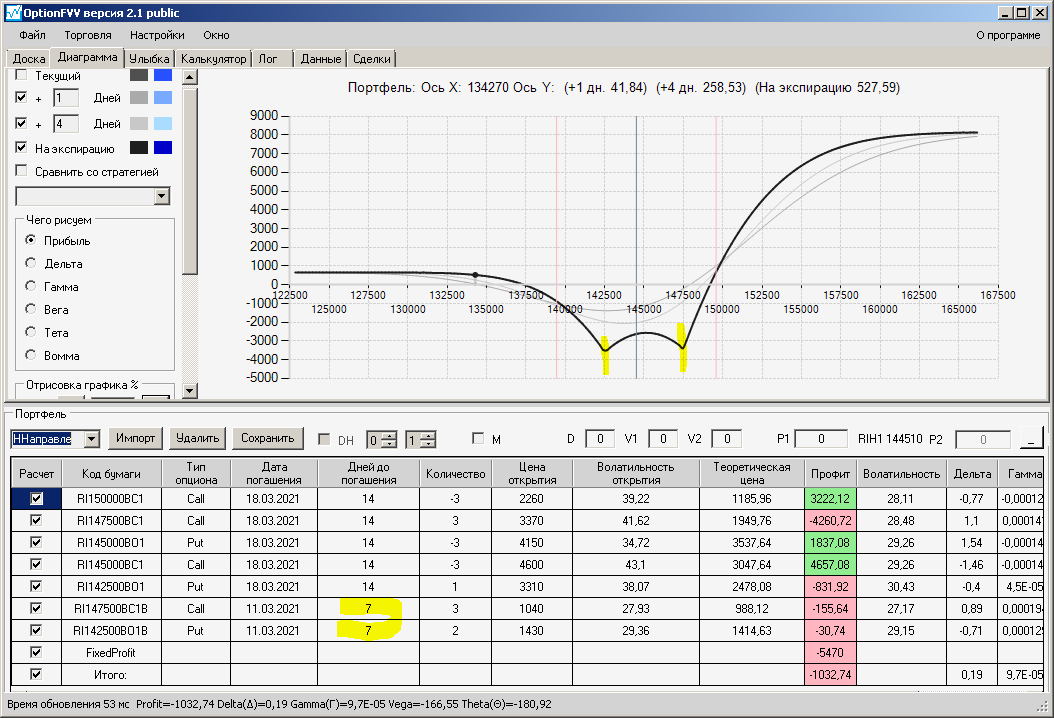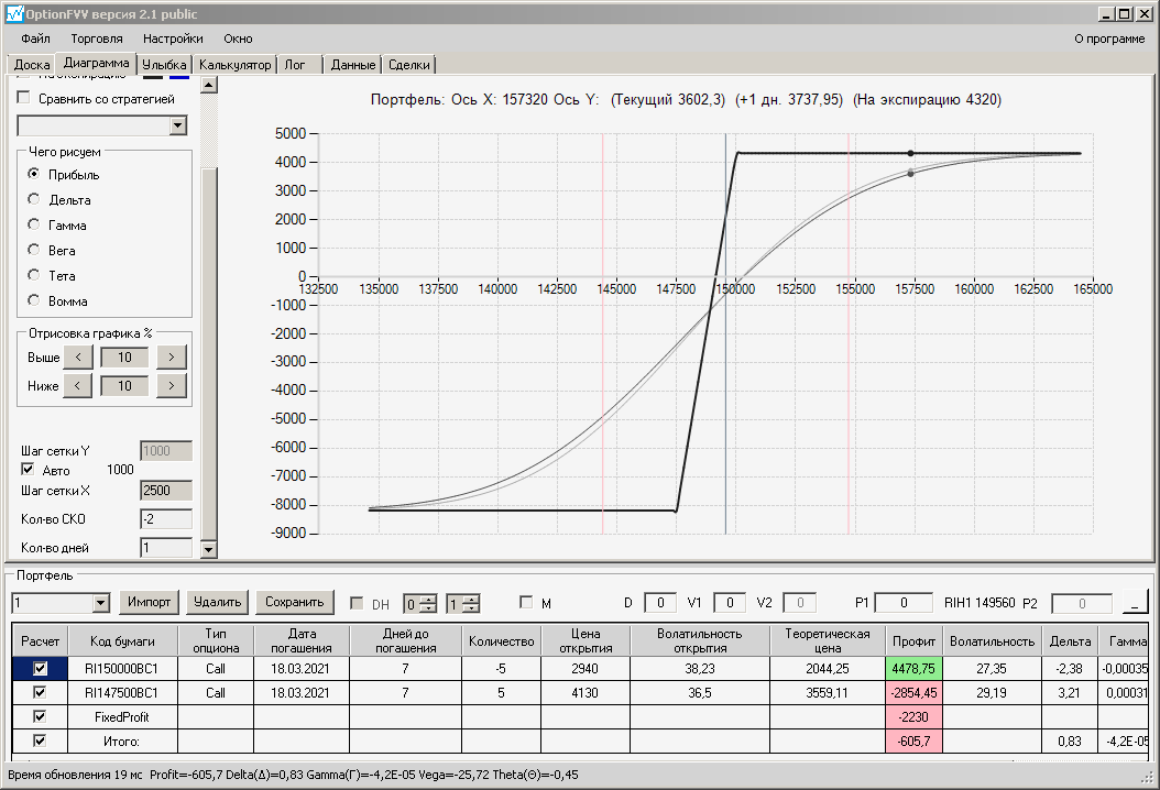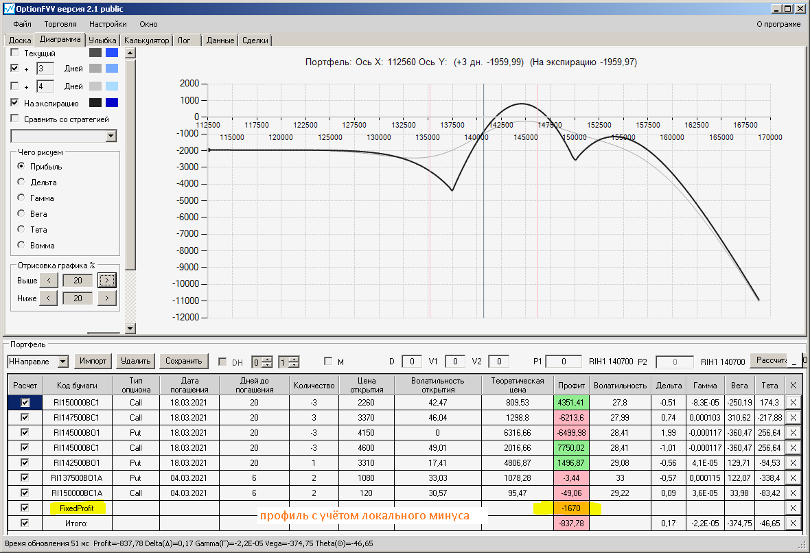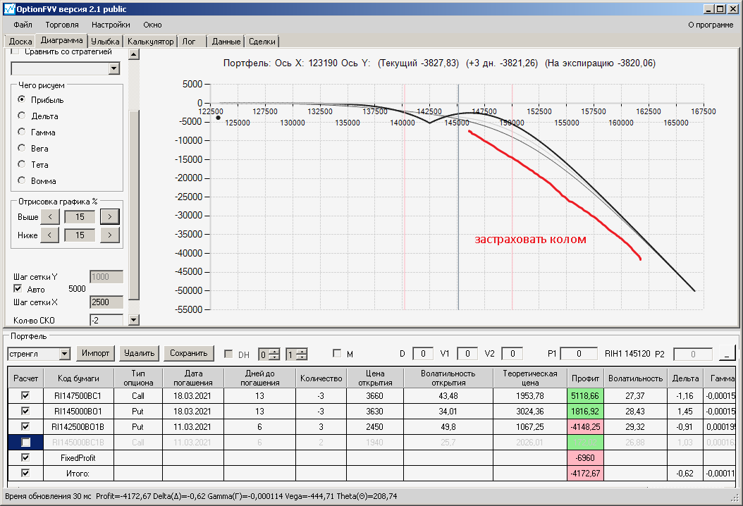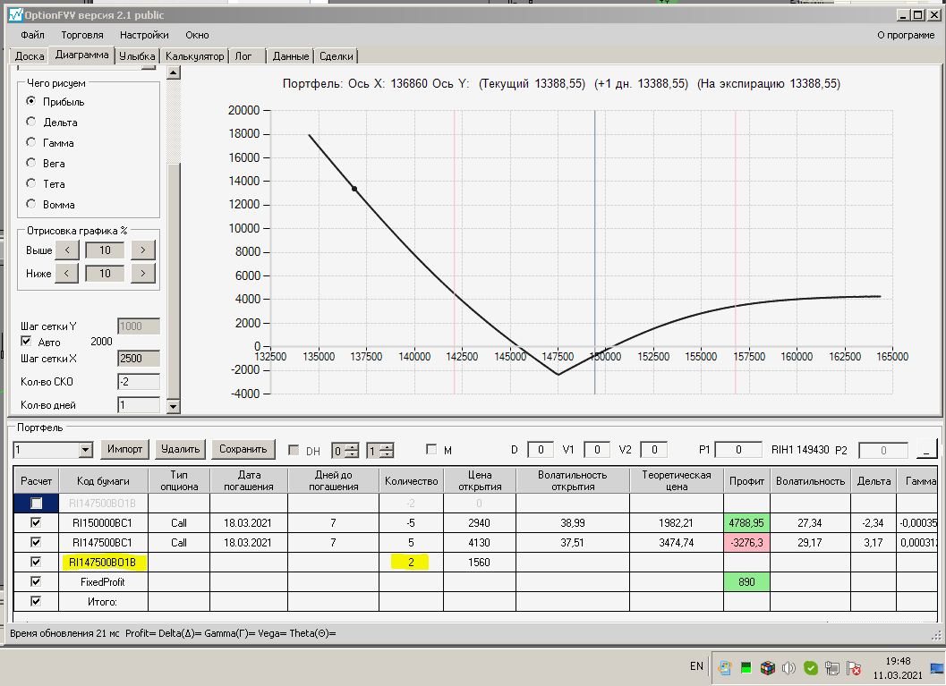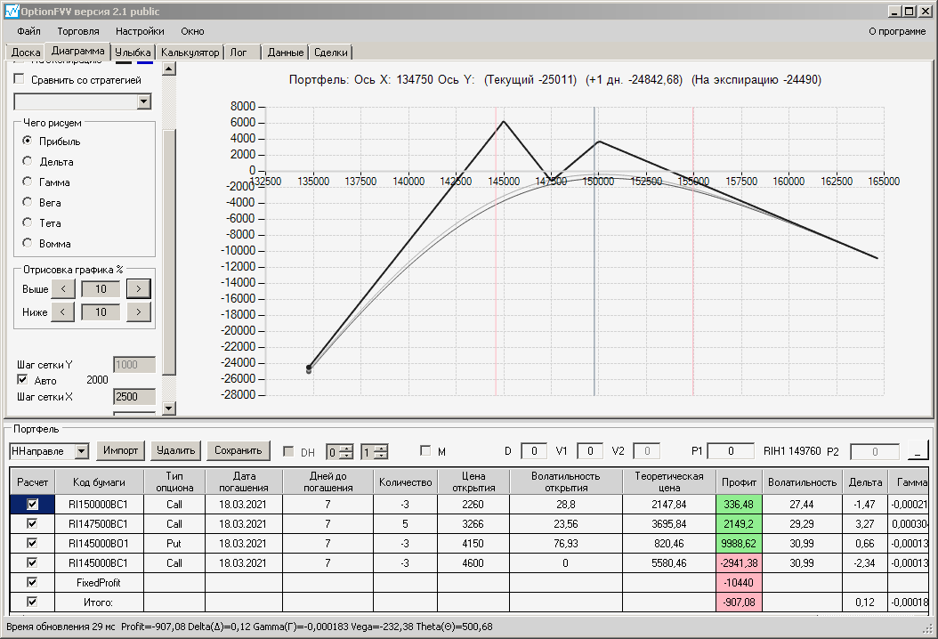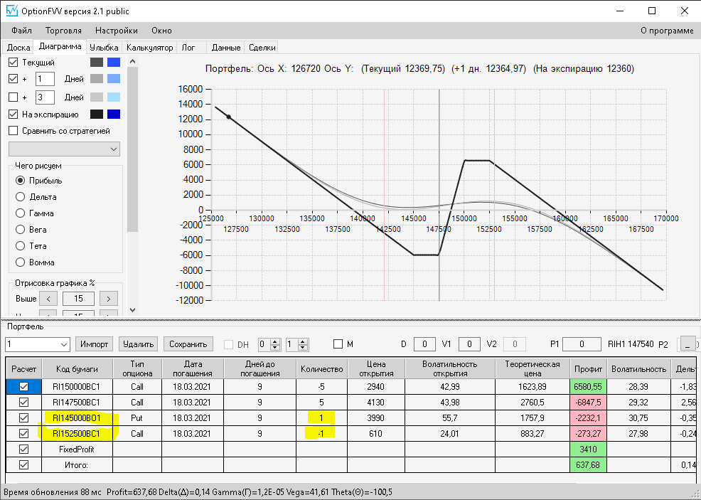 целый месяц конструкция локально давала убыток от страховок, так как фьючерс не хотел идти вверх, А сейчас когда осталась одна неделя до экспирации профиля, фьючерс начал движение вверх, хочу на этом заработать, поэтому не стал закрывать конструкцию с минимальным 600 п. прибыли, а застраховал от снижения двумя опцимонами, купил один пут 150 страйка, и снизил его стоимость продал справа один кол 160 страйка, чтоб был запас до правой КТ около 10 000 пунктов.