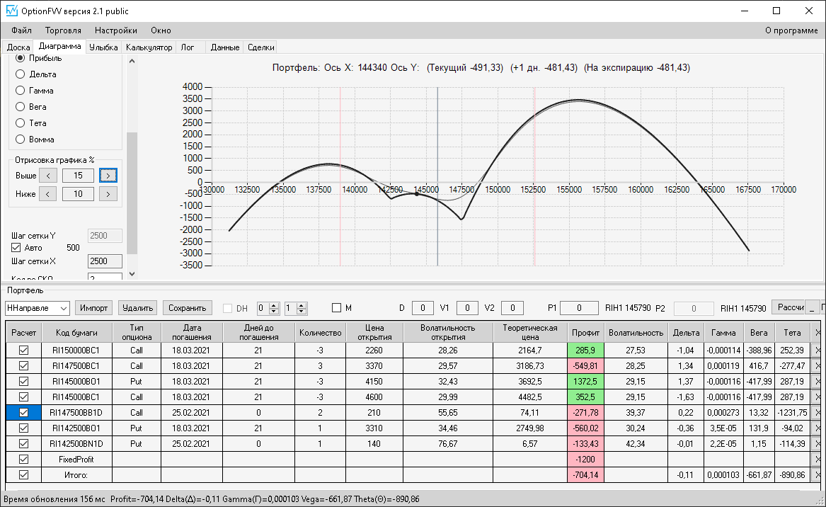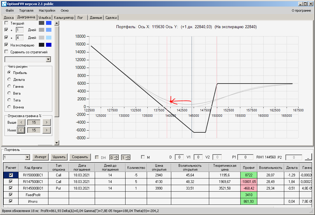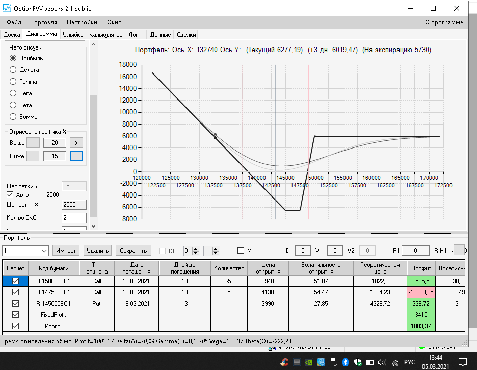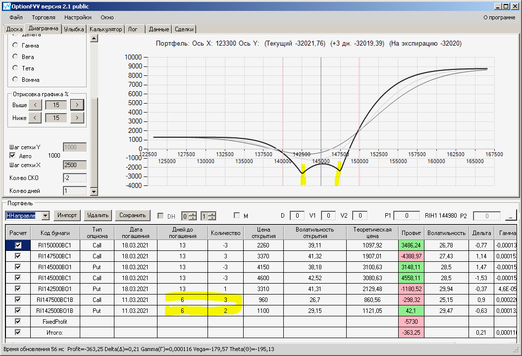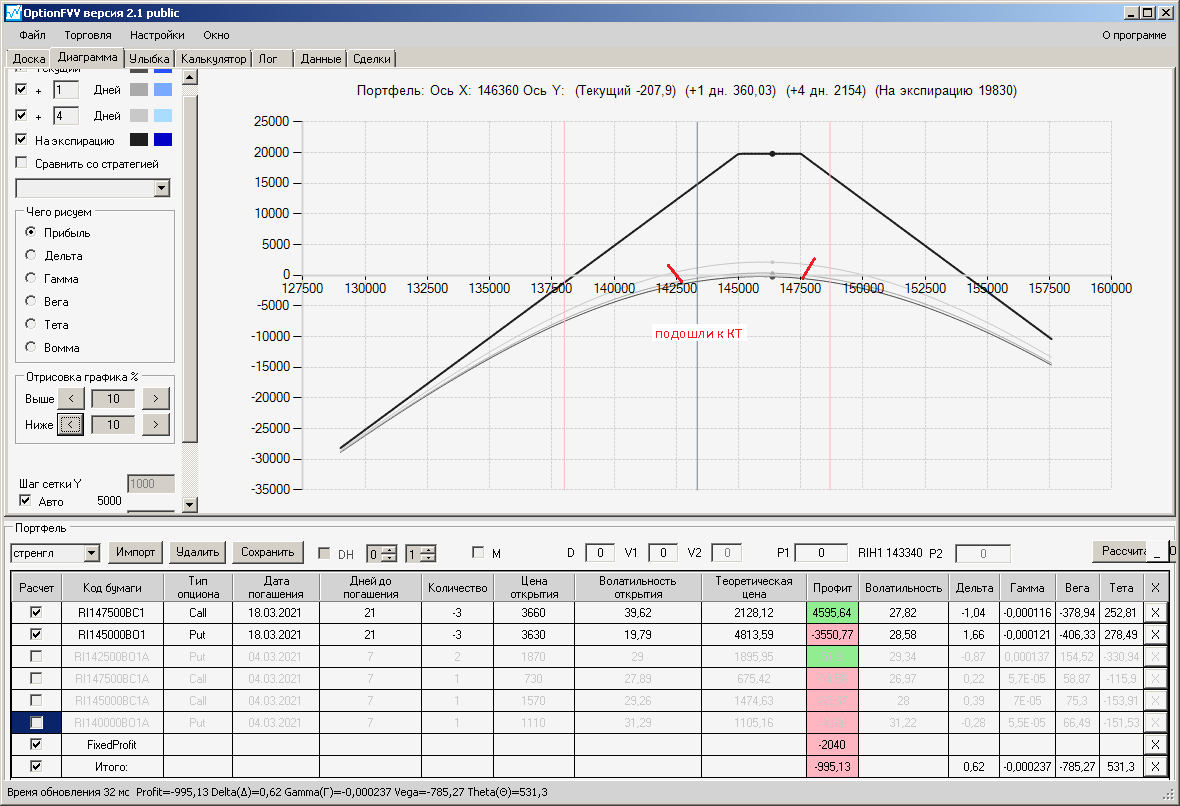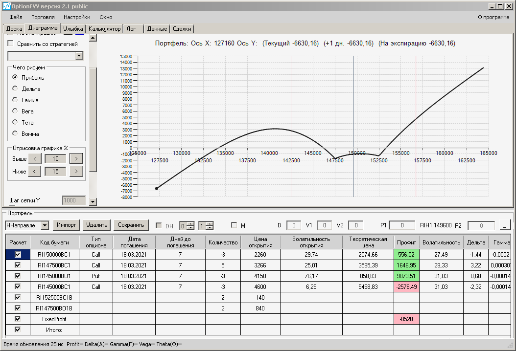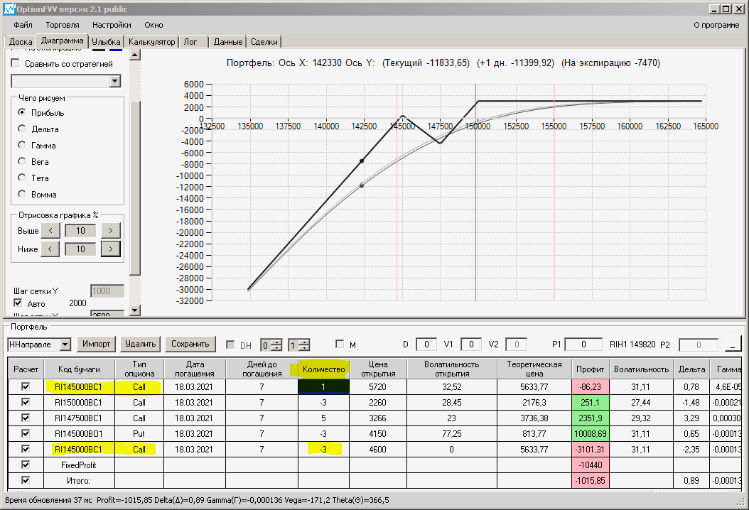 целый месяц конструкция локально давала убыток от страховок, так как фьючерс не хотел идти вверх, А сейчас когда осталась одна неделя до экспирации профиля, фьючерс начал движение вверх, хочу на этом заработать, поэтому не стал закрывать конструкцию с минимальным 600 п. прибыли, а застраховал от снижения двумя опцимонами, купил один пут 150 страйка, и снизил его стоимость продал справа один кол 160 страйка, чтоб был запас до правой КТ около 10 000 пунктов.