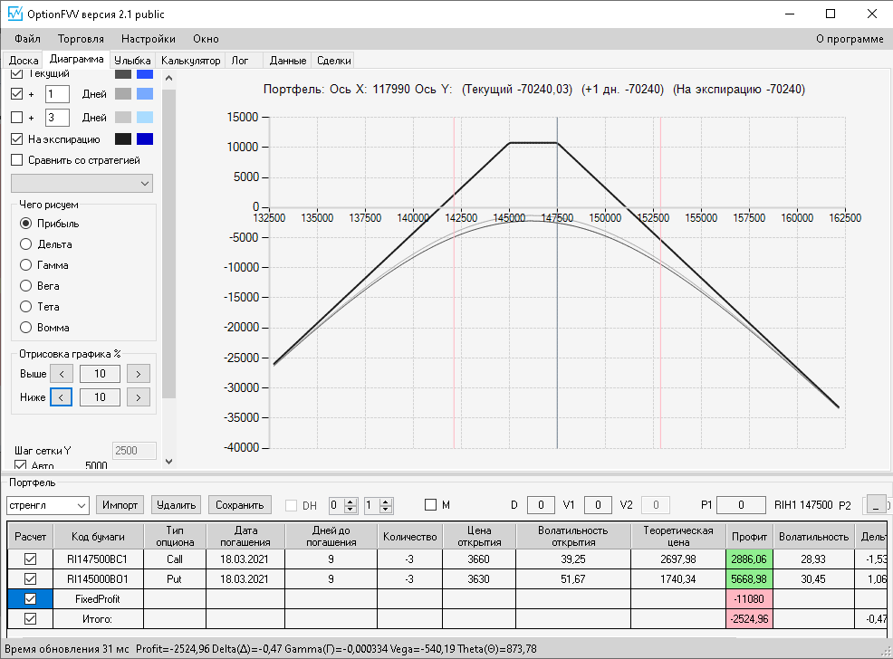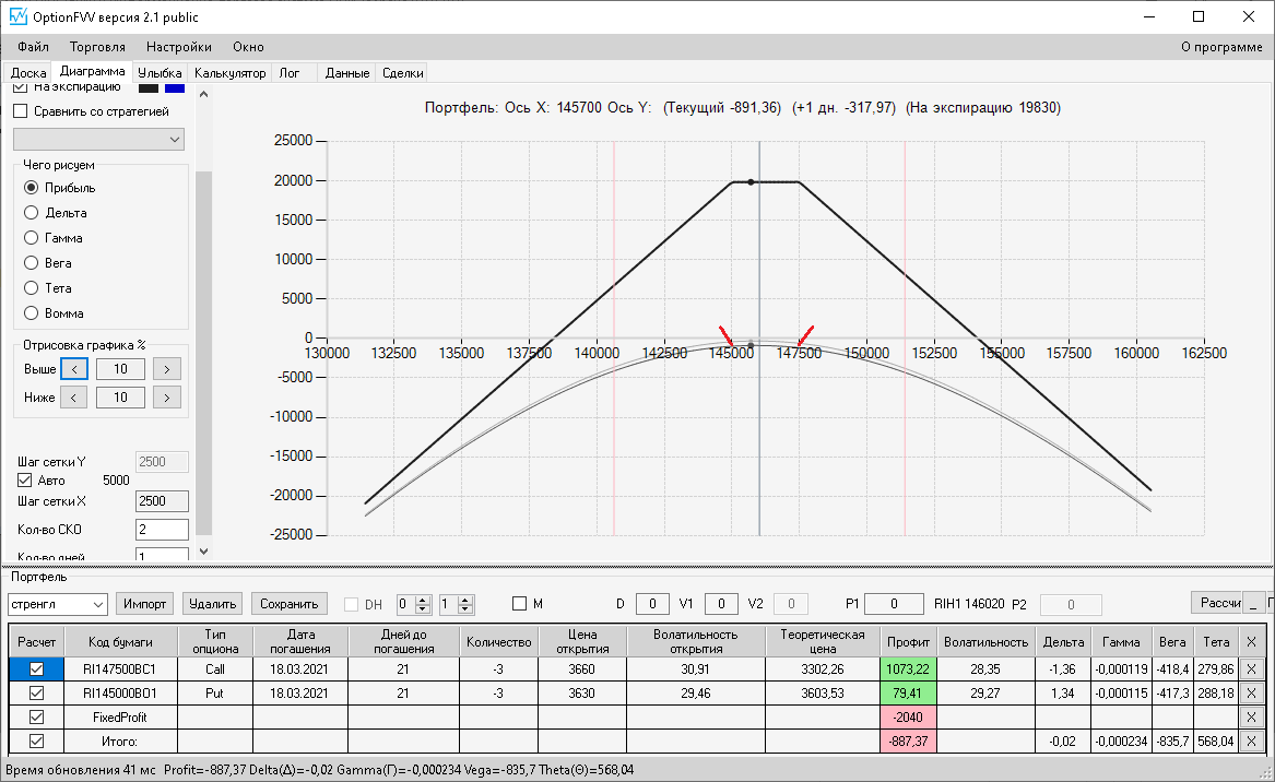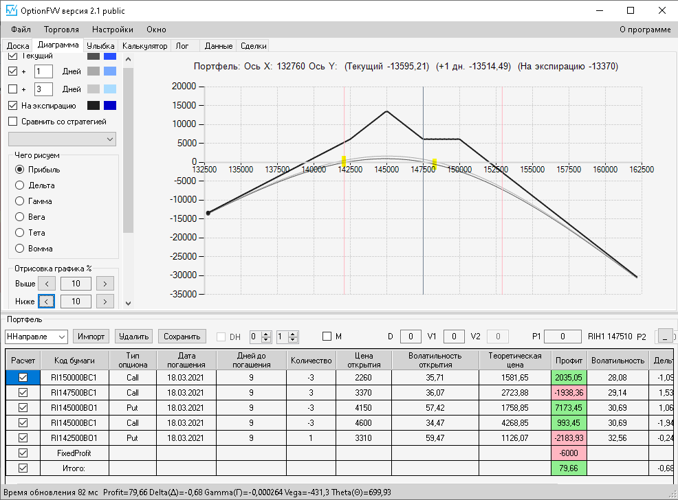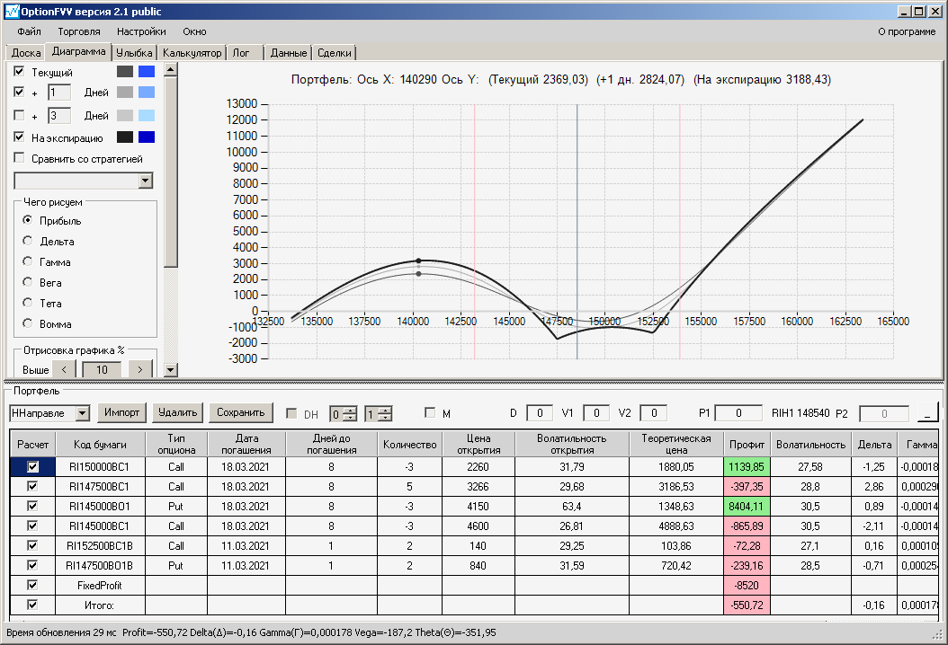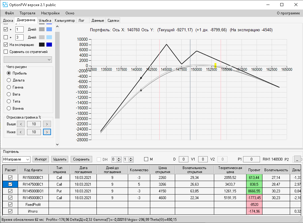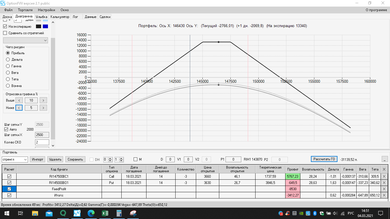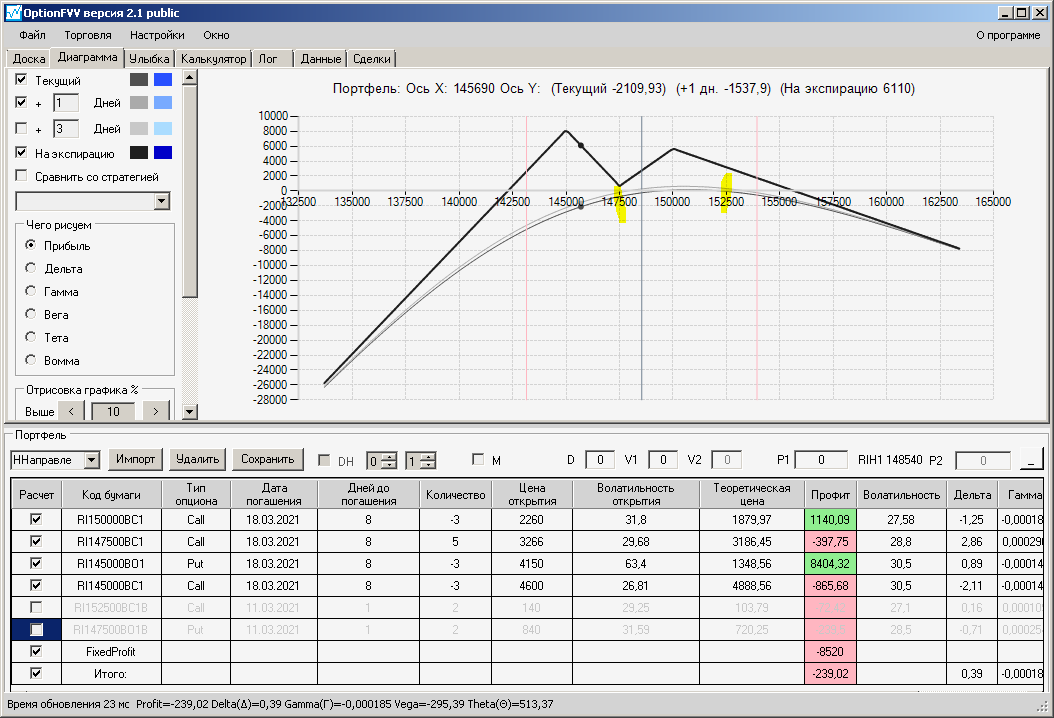 целый месяц конструкция локально давала убыток от страховок, так как фьючерс не хотел идти вверх, А сейчас когда осталась одна неделя до экспирации профиля, фьючерс начал движение вверх, хочу на этом заработать, поэтому не стал закрывать конструкцию с минимальным 600 п. прибыли, а застраховал от снижения двумя опцимонами, купил один пут 150 страйка, и снизил его стоимость продал справа один кол 160 страйка, чтоб был запас до правой КТ около 10 000 пунктов.