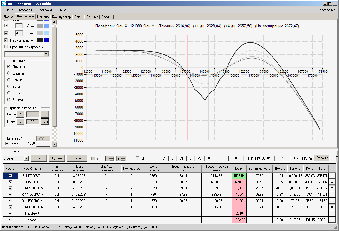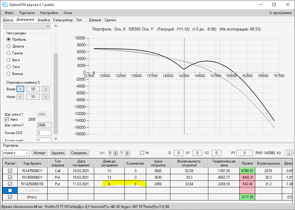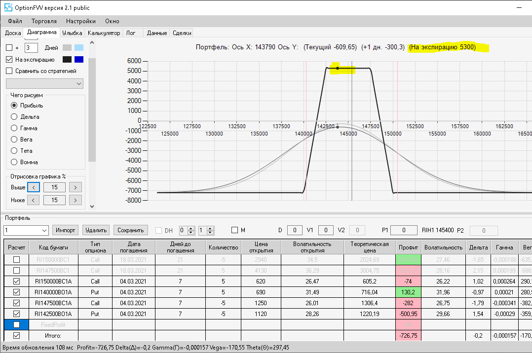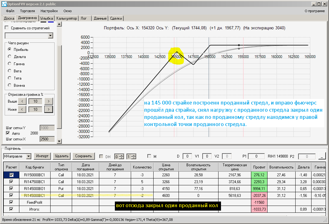 фьючерс пошёл вверх, закрыл два проданных кола приподнял правую часть профиля.