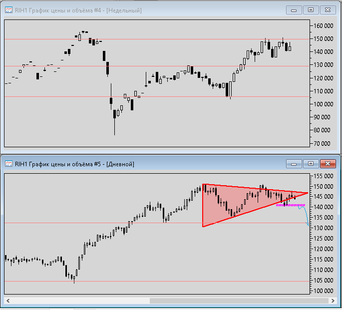 Но потенциал страховочного недельного кондора не отработался, и находимся слева у контрольной точки кондора, поэтому страховку месячный пут снимать нельзя, Рынок фьючерса находится у линии поддержки перед пробоем его вниз на D1.