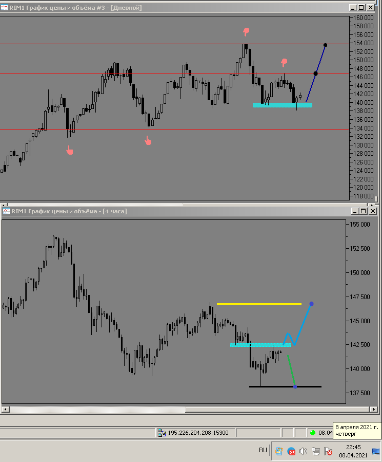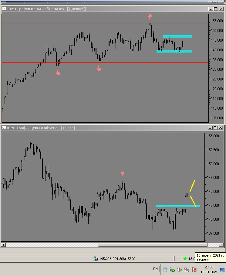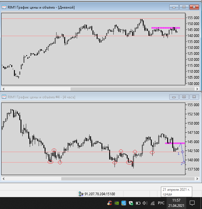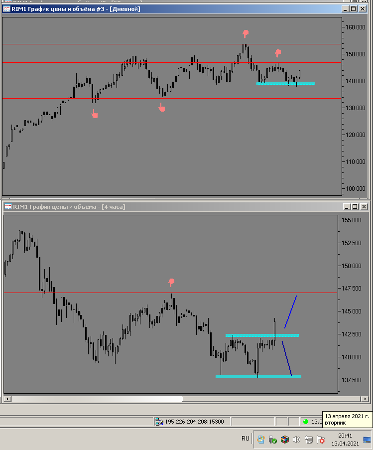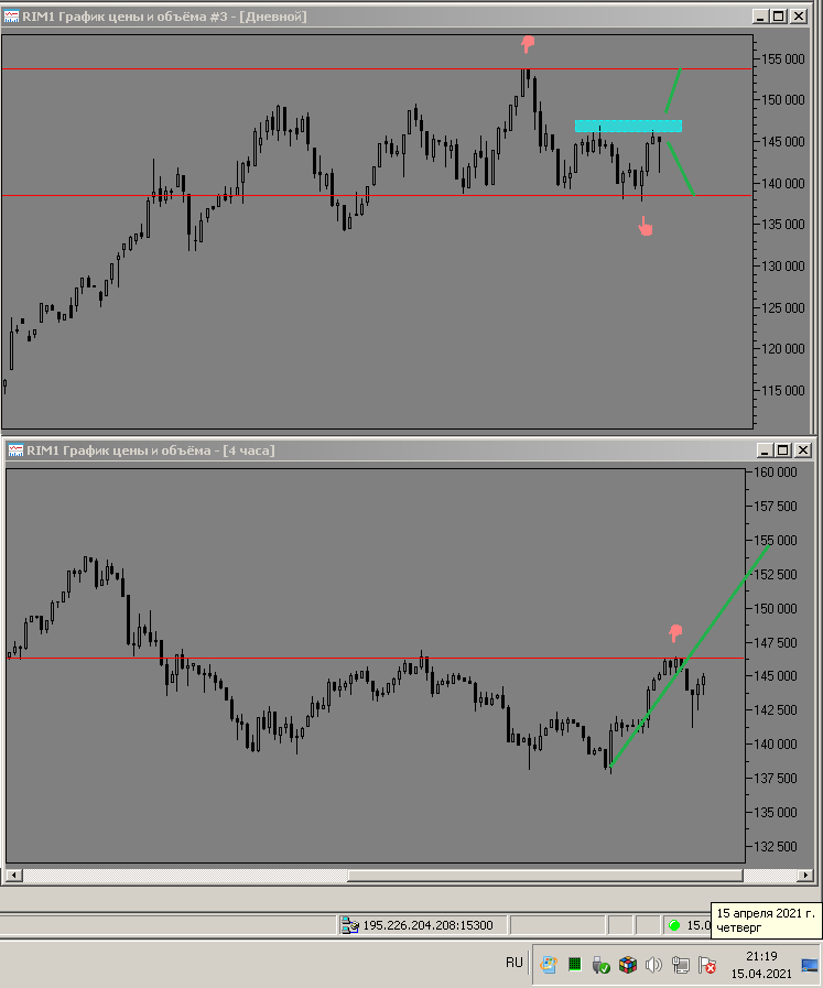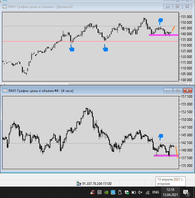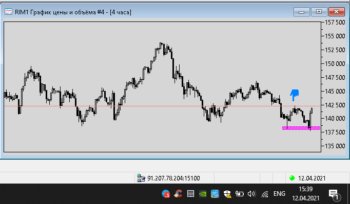 19 апреля 2021 года - пишу из дома, фьючерс показывает отскок вниз, до уровня поддержки ближайшей на графике h4 уровня 137500 пунктов