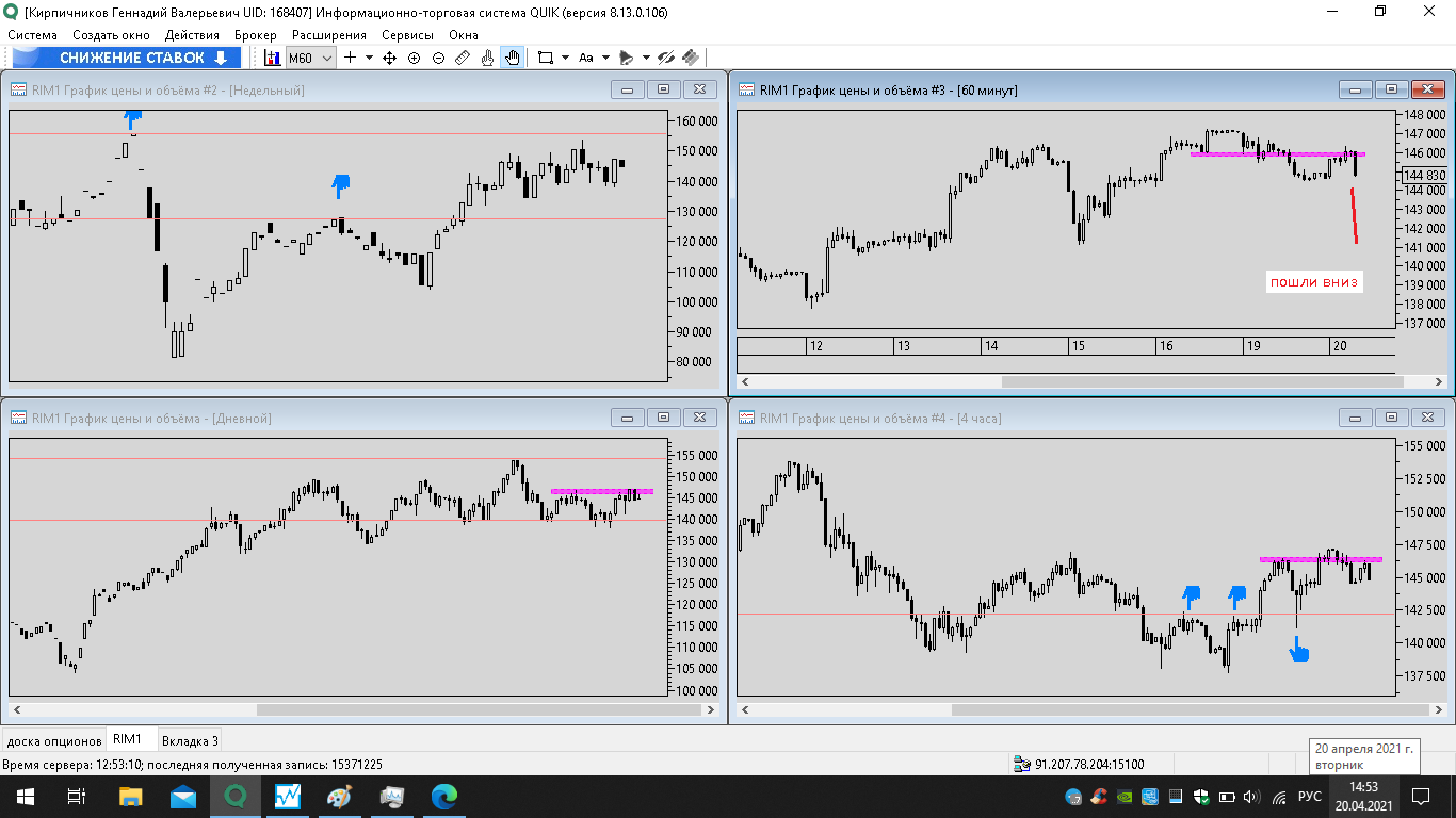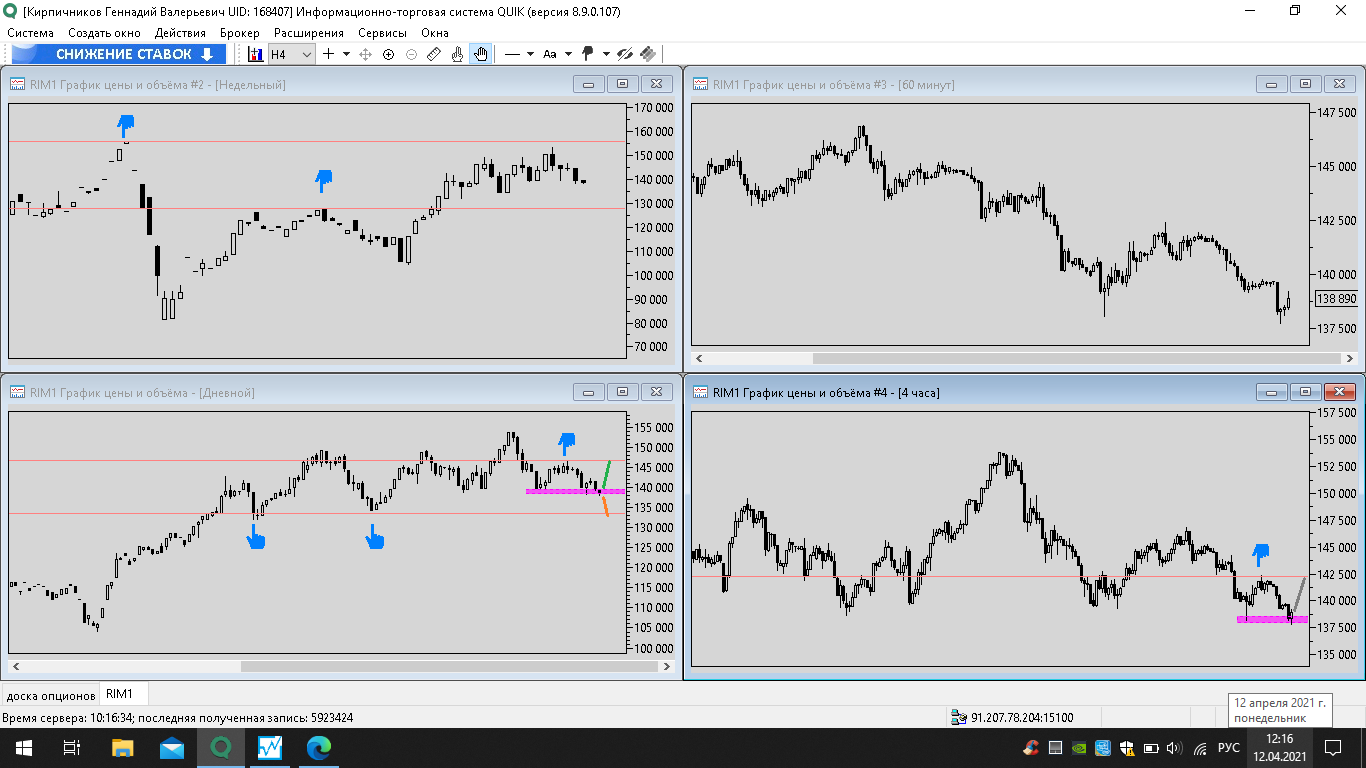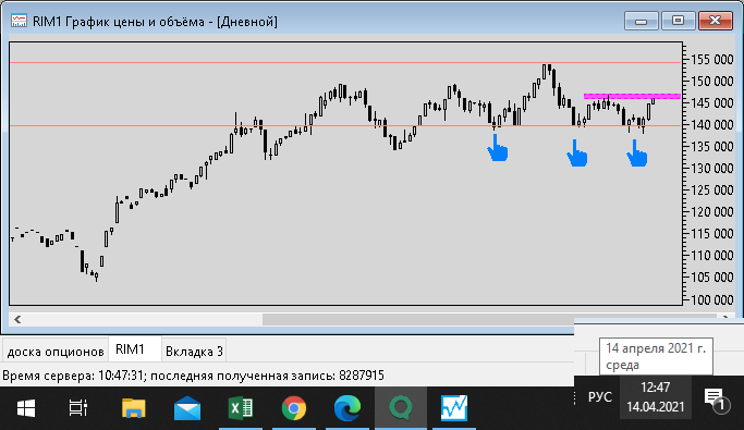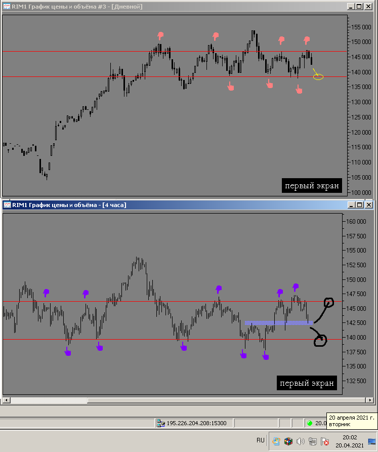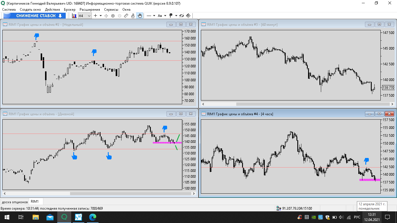 19 апреля 2021 года - пишу из дома, фьючерс показывает отскок вниз, до уровня поддержки ближайшей на графике h4 уровня 137500 пунктов
