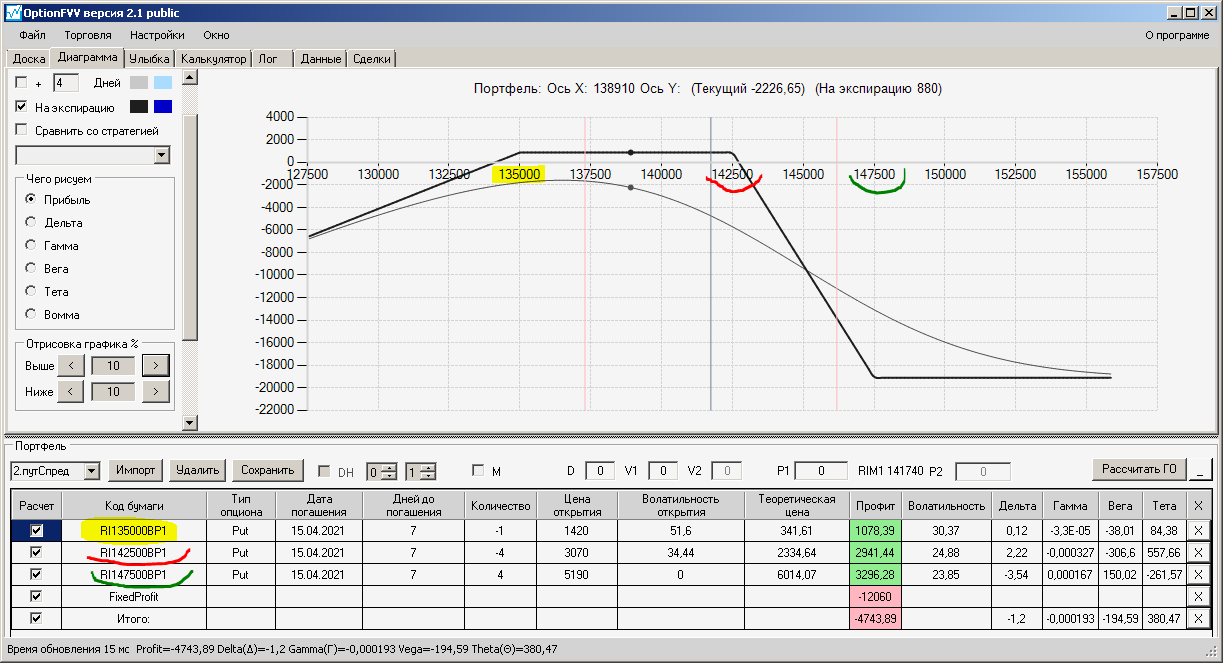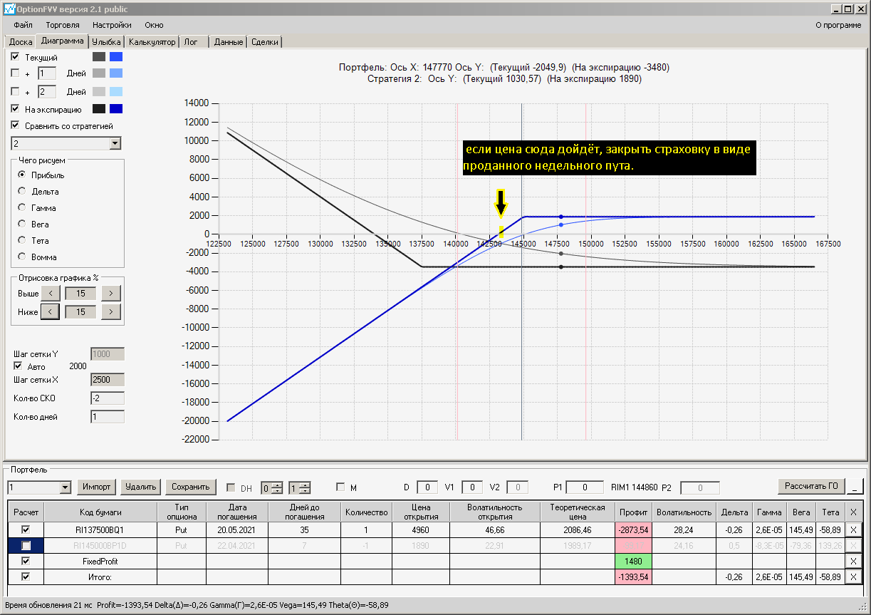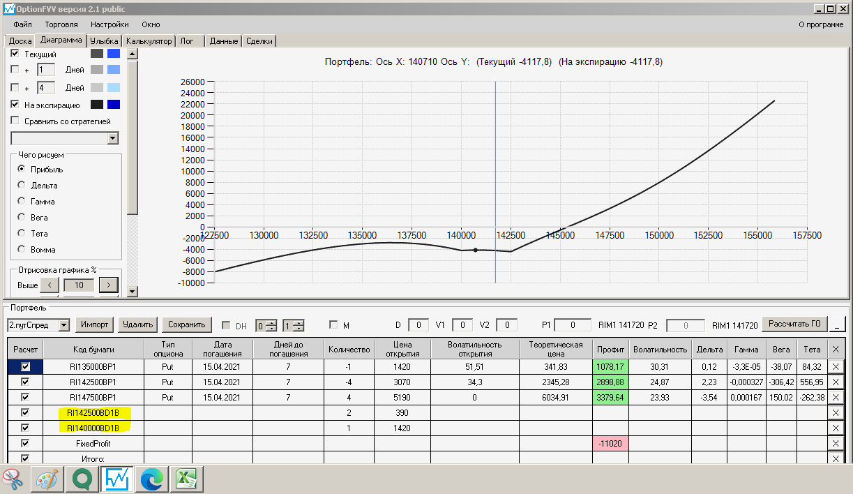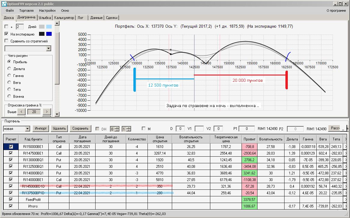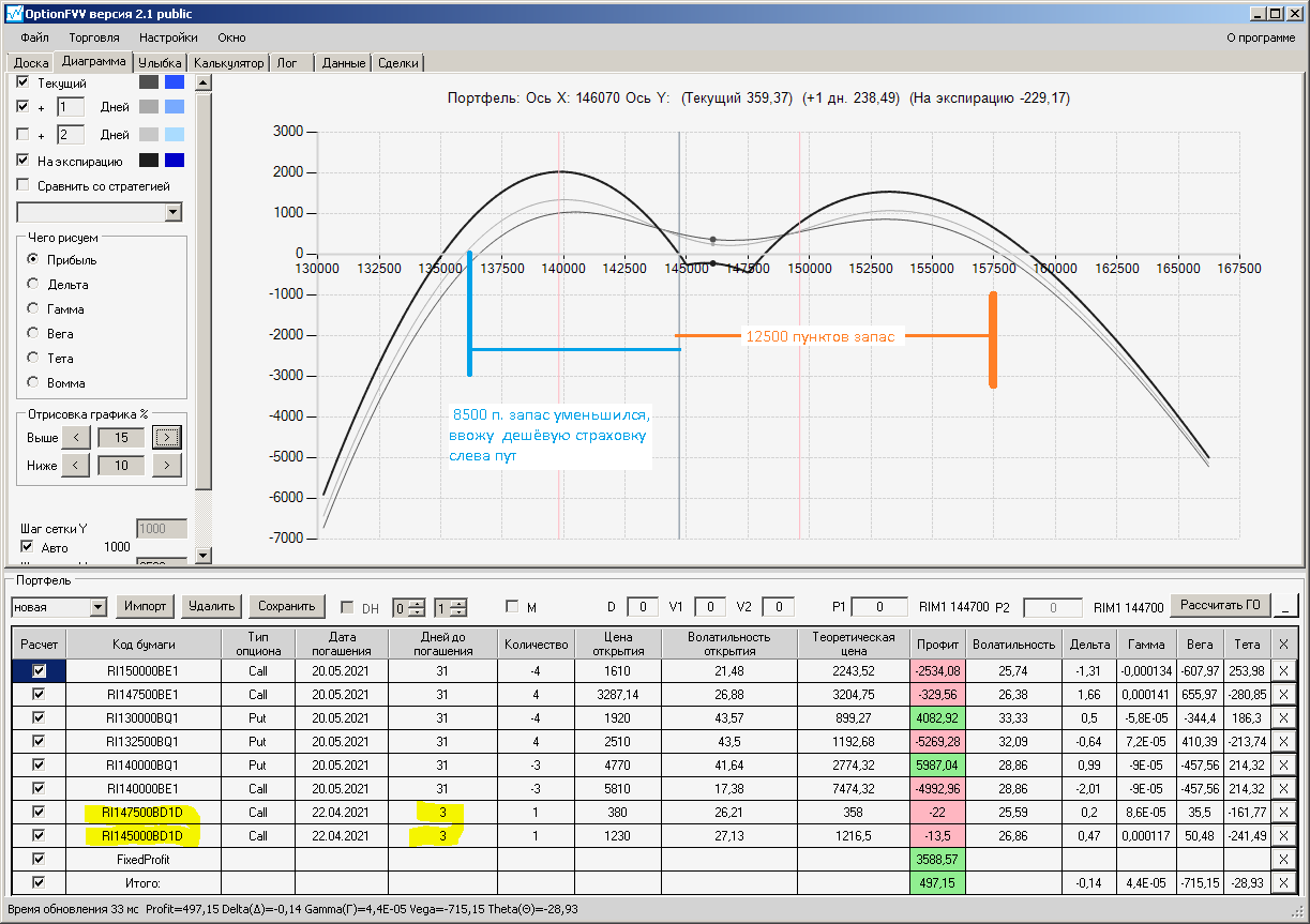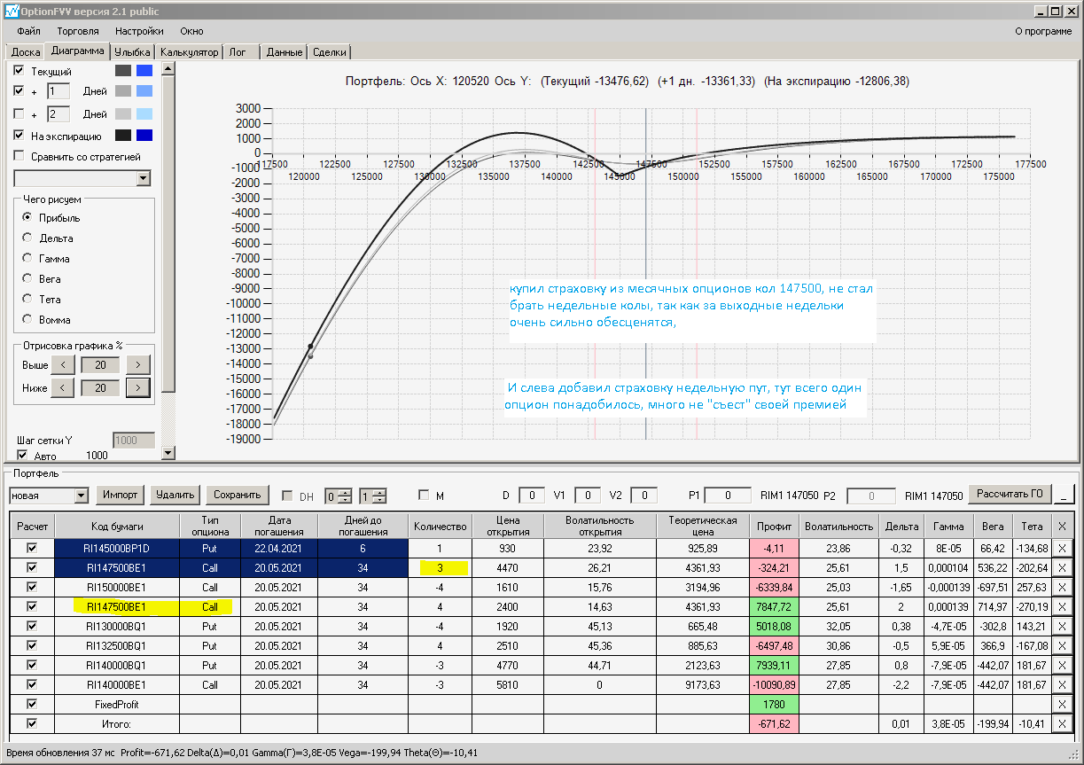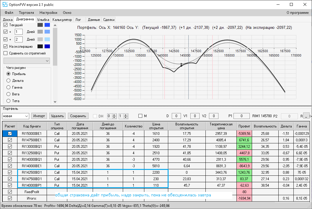 по второй конструкции закрываю истёкшие недельные страховки, получил такой профиль, у которого текущая цена фьючерса находится у рискованного правого края, покупаю агрессивно два кола недельных.