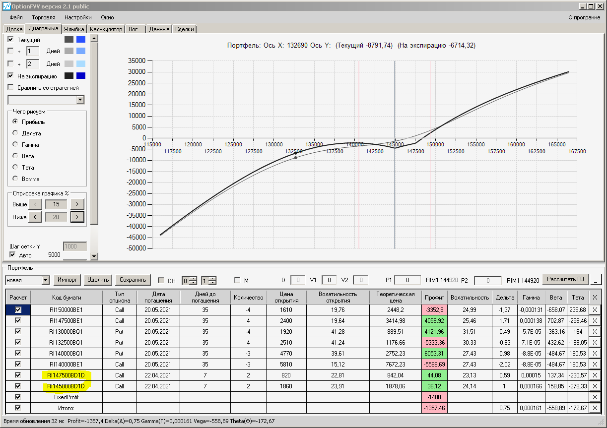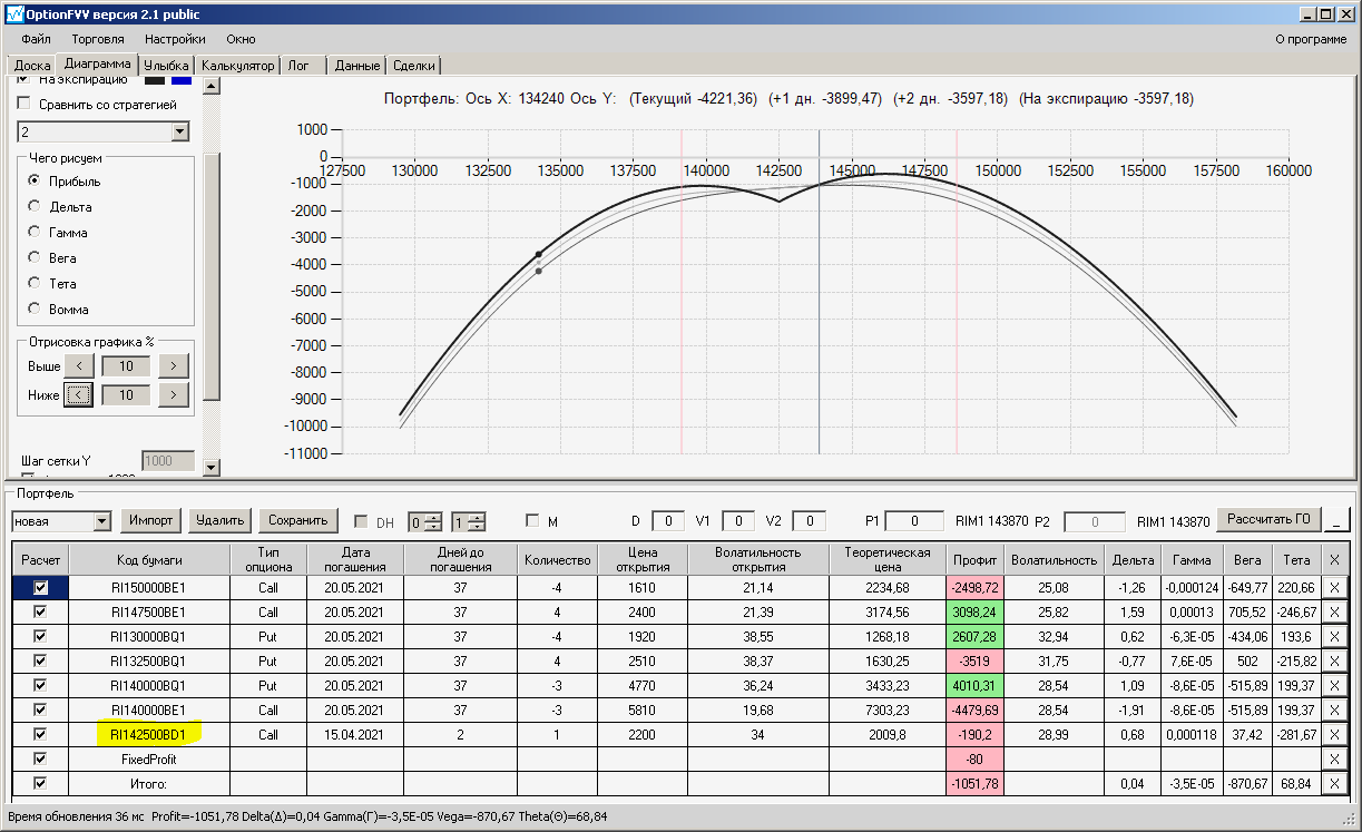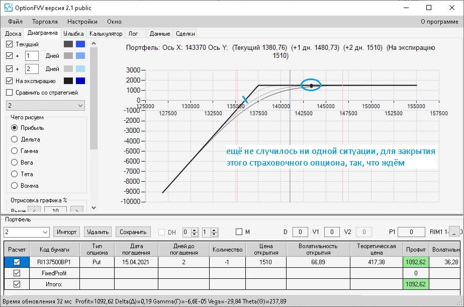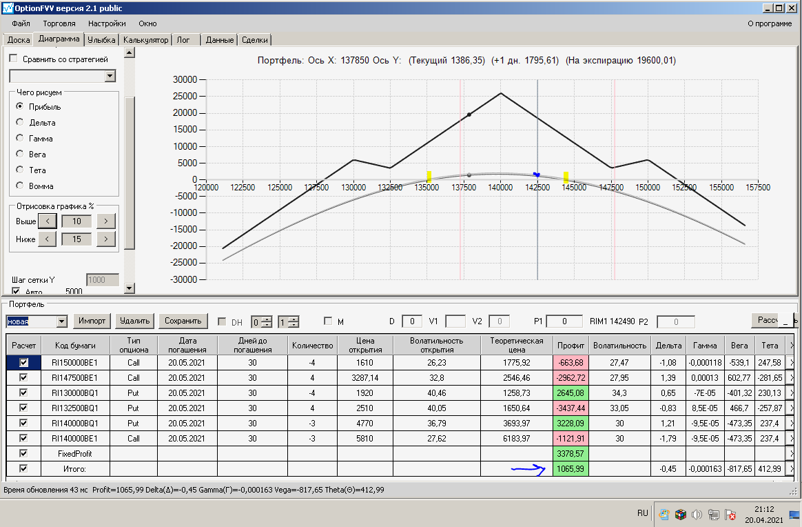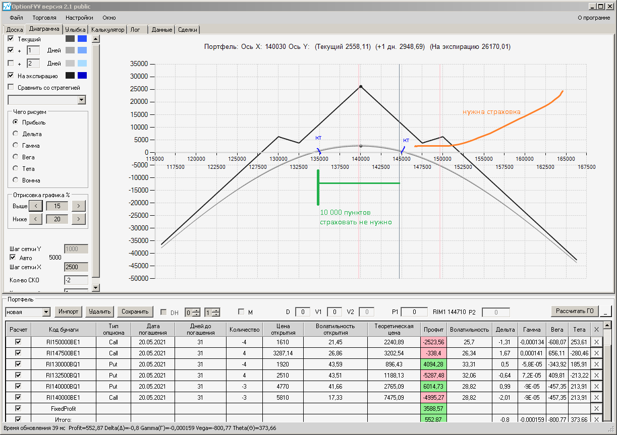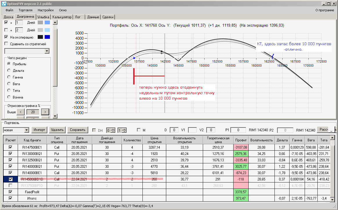 по второй конструкции закрываю истёкшие недельные страховки, получил такой профиль, у которого текущая цена фьючерса находится у рискованного правого края, покупаю агрессивно два кола недельных.