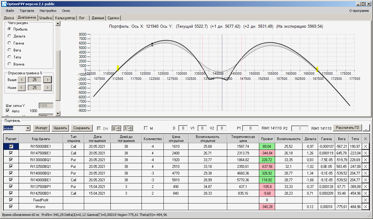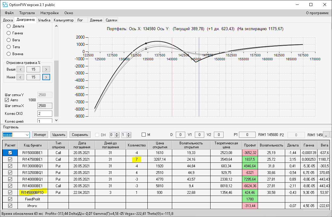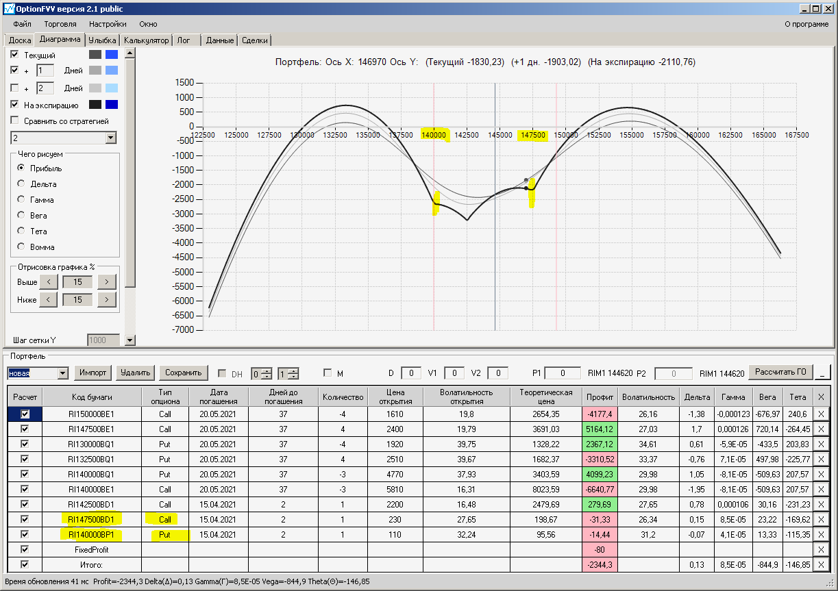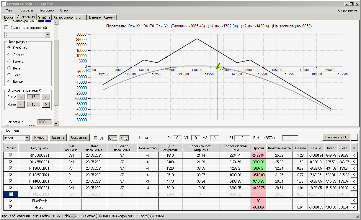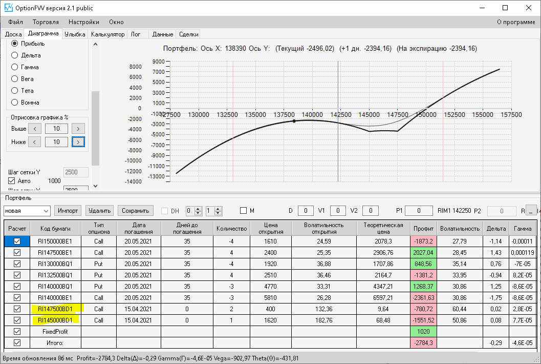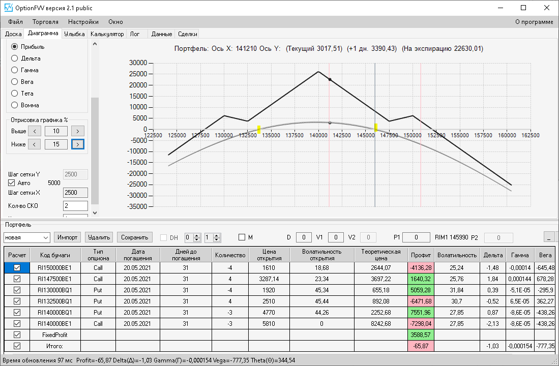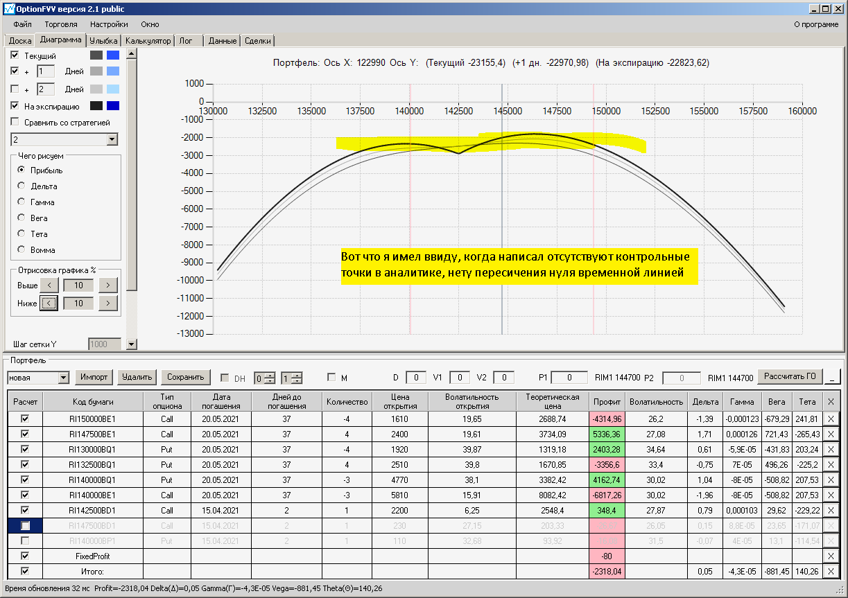 по второй конструкции закрываю истёкшие недельные страховки, получил такой профиль, у которого текущая цена фьючерса находится у рискованного правого края, покупаю агрессивно два кола недельных.