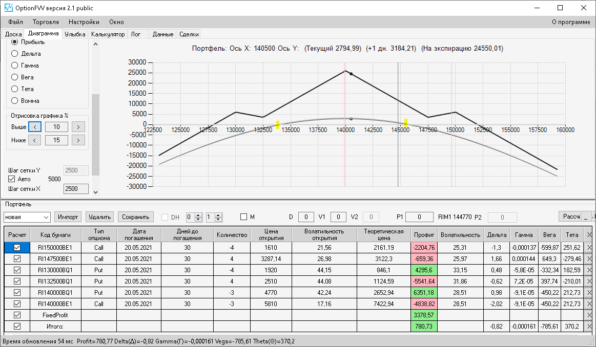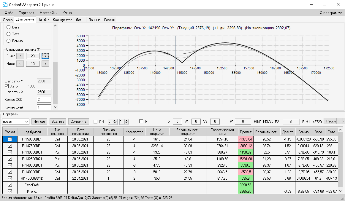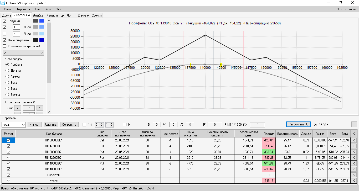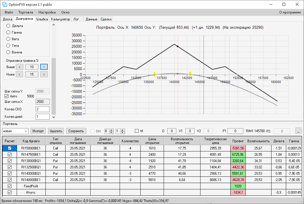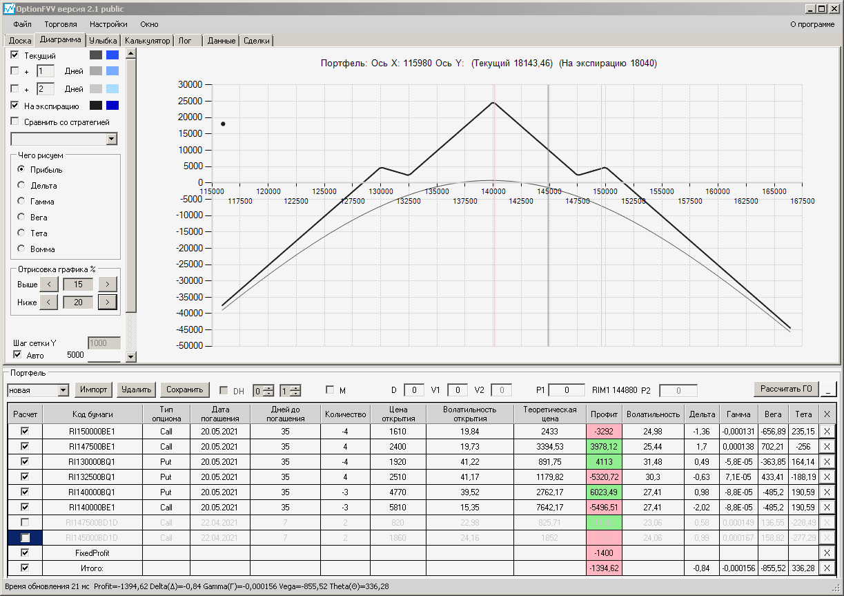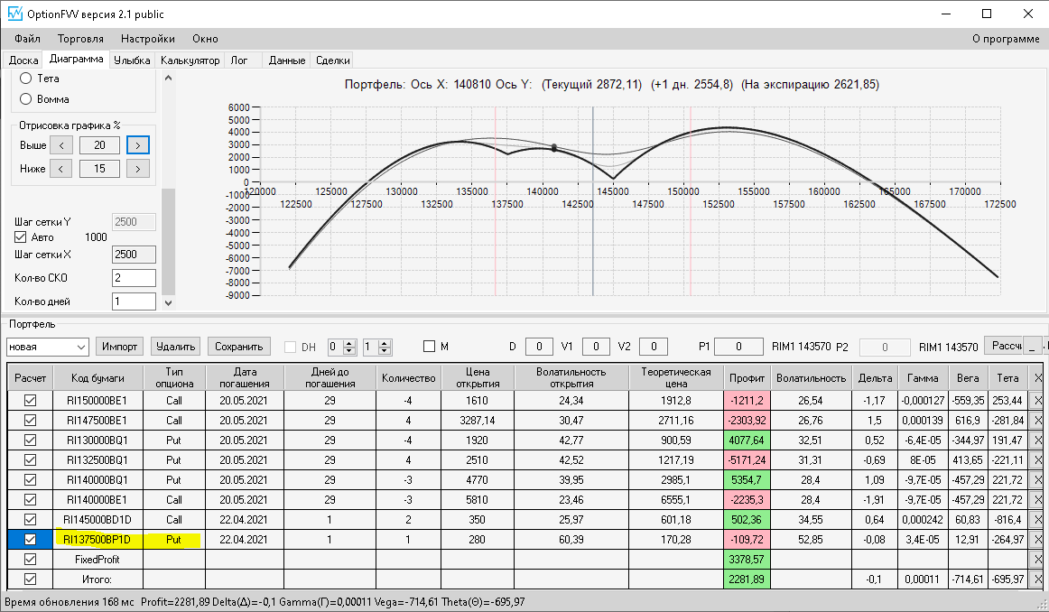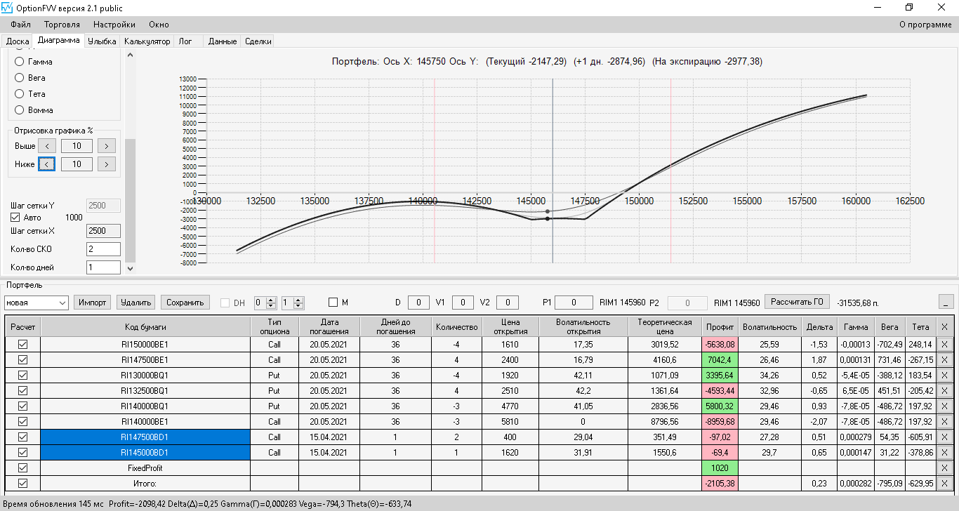 по второй конструкции закрываю истёкшие недельные страховки, получил такой профиль, у которого текущая цена фьючерса находится у рискованного правого края, покупаю агрессивно два кола недельных.