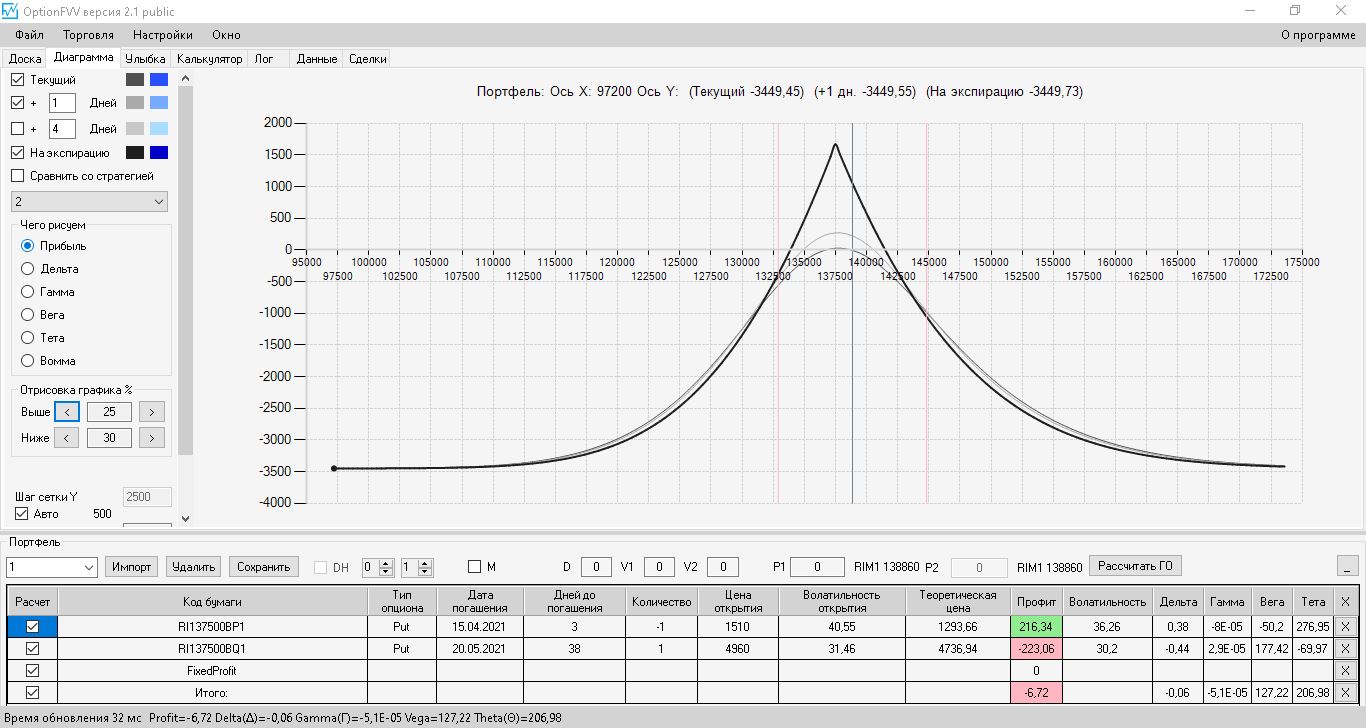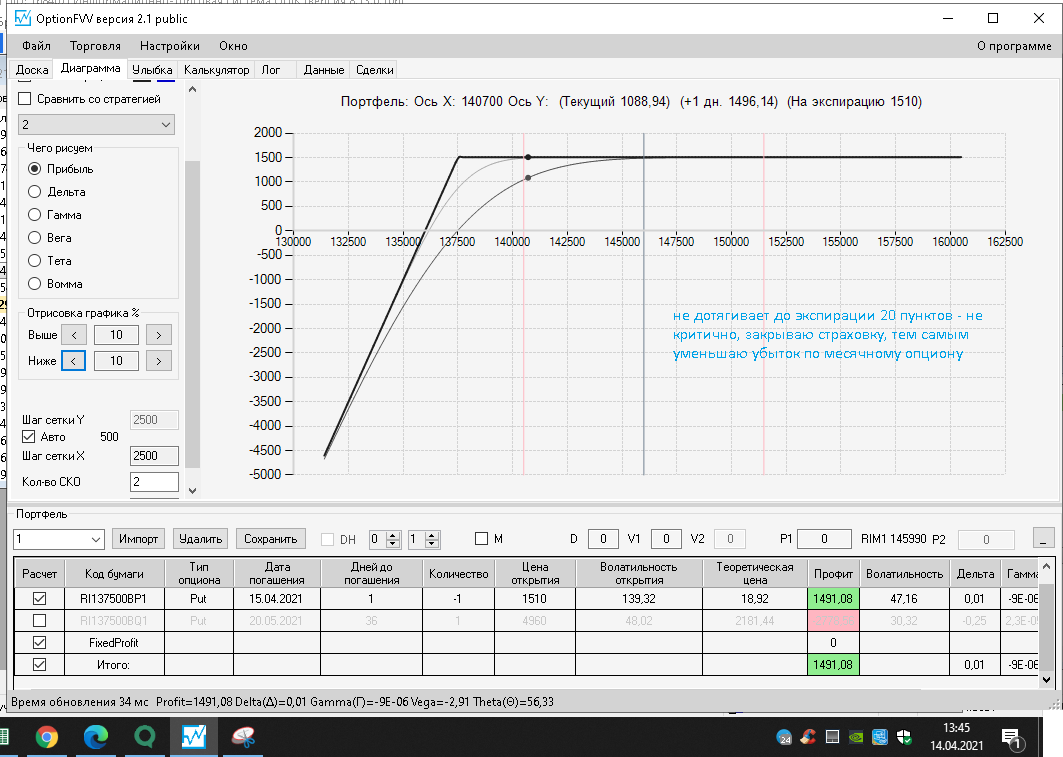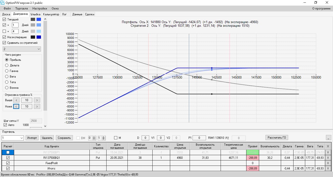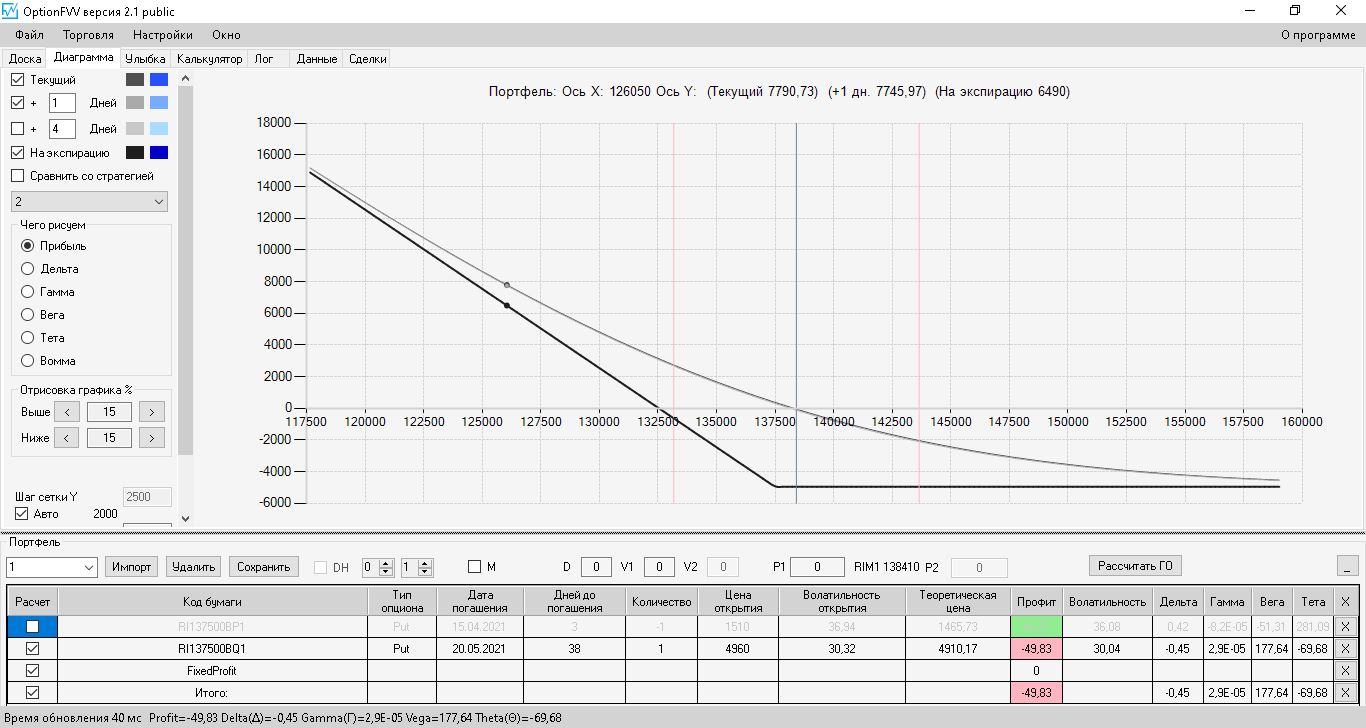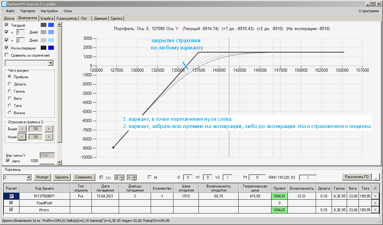 приехал домой фьючерс идёт вниз, волатильность увеличилась на 10%, первая покупка простого месячного опциона пут, даёт локальную прибыль, а вот вторая конструкция даёт локальный минус.