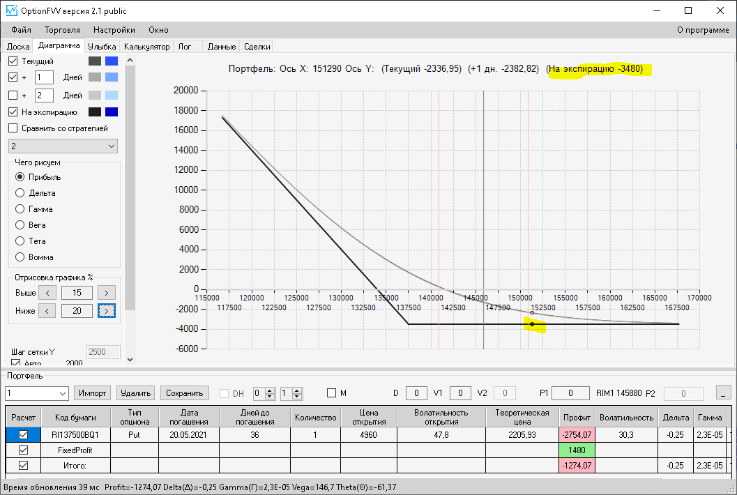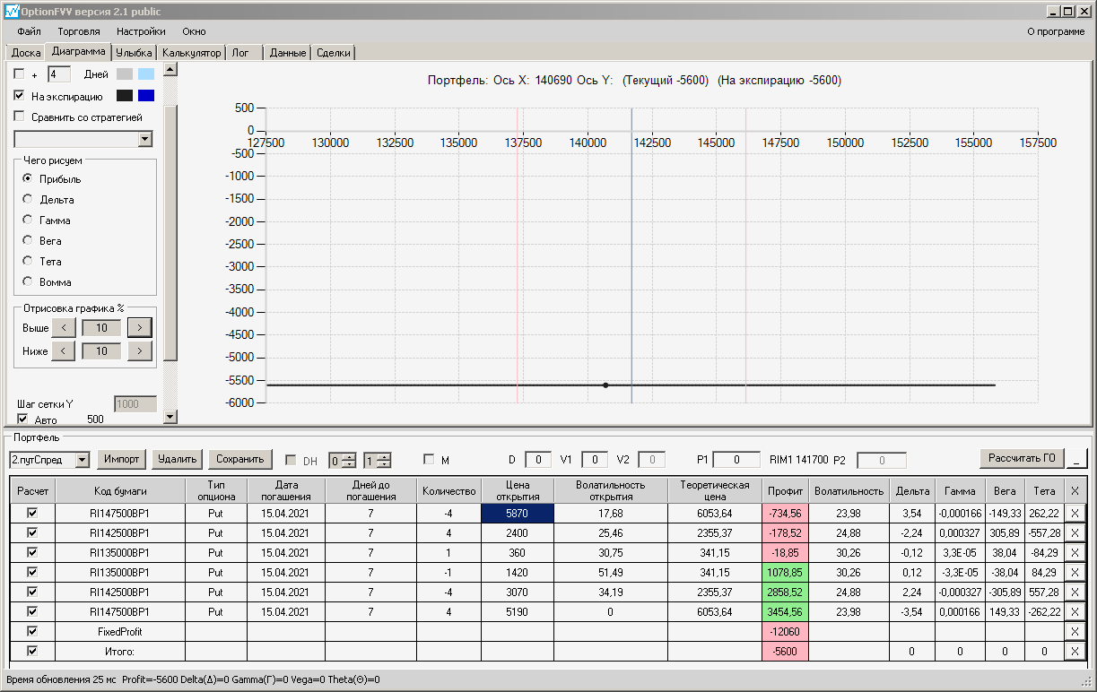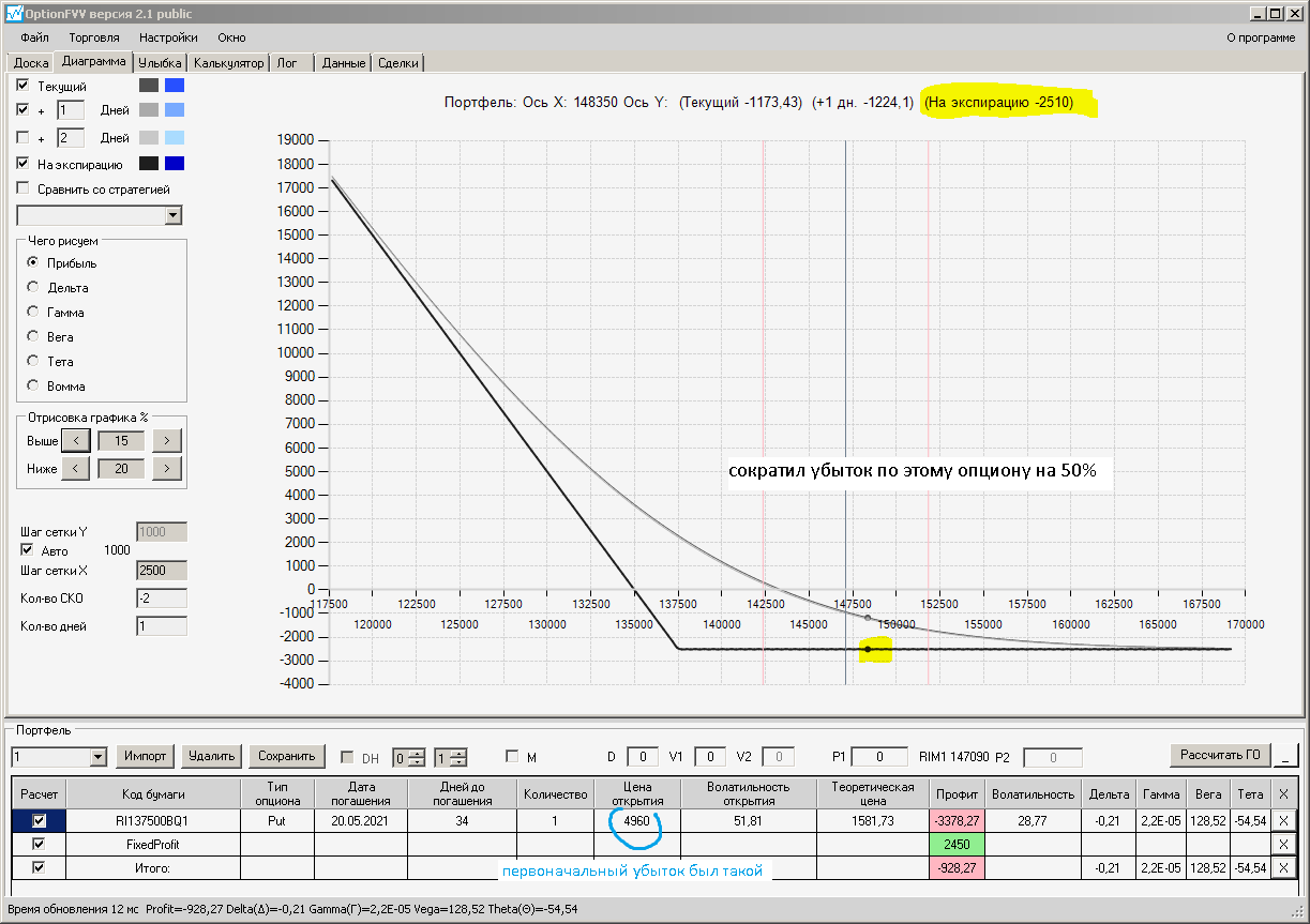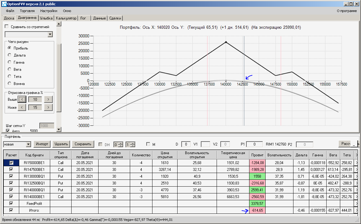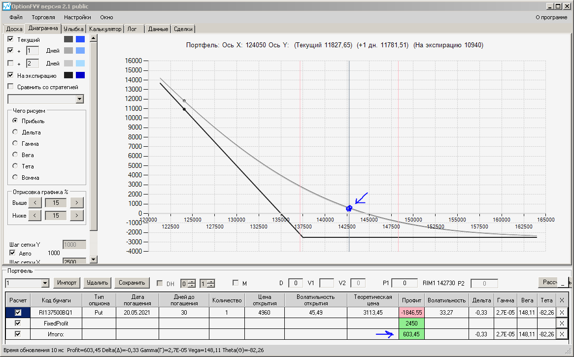приехал домой фьючерс идёт вниз, волатильность увеличилась на 10%, первая покупка простого месячного опциона пут, даёт локальную прибыль, а вот вторая конструкция даёт локальный минус.