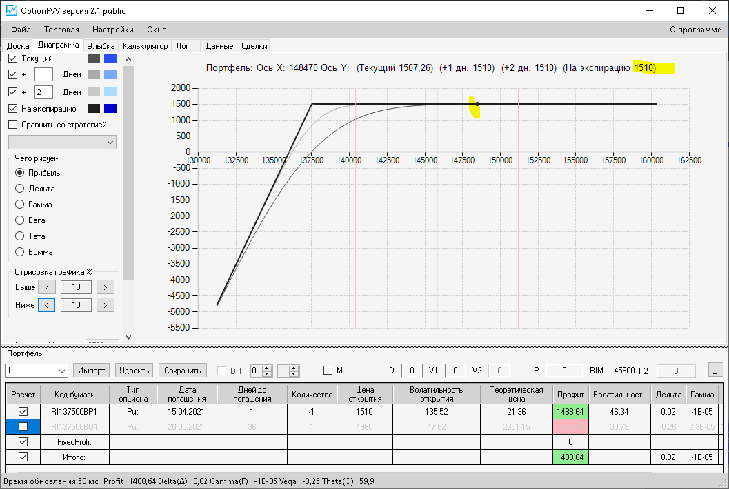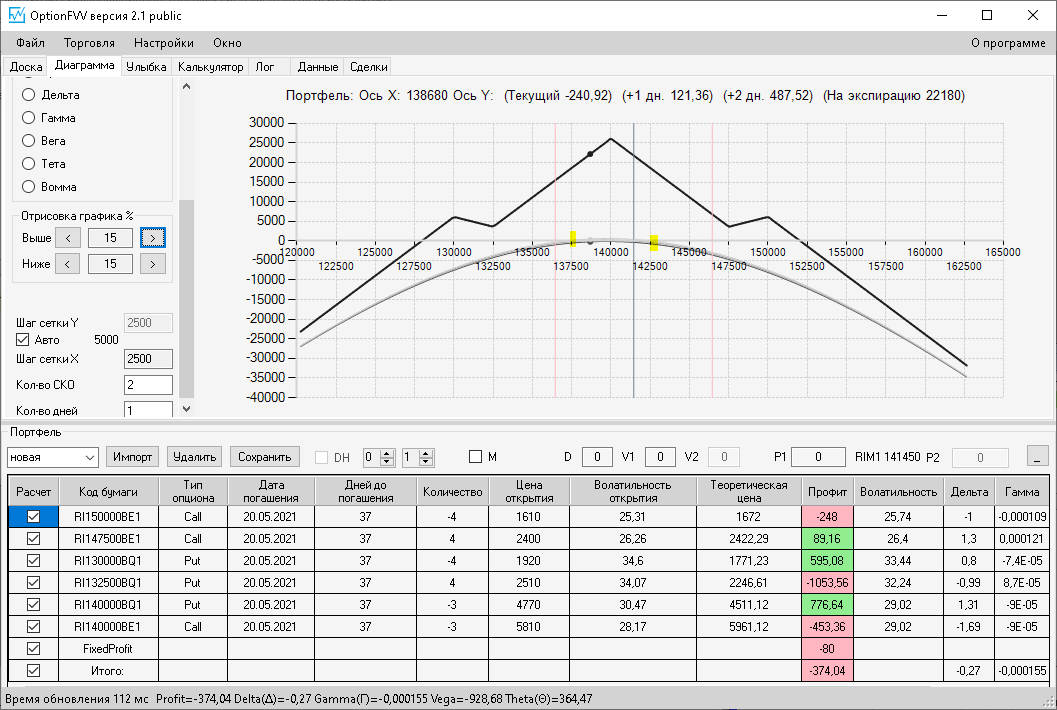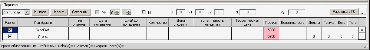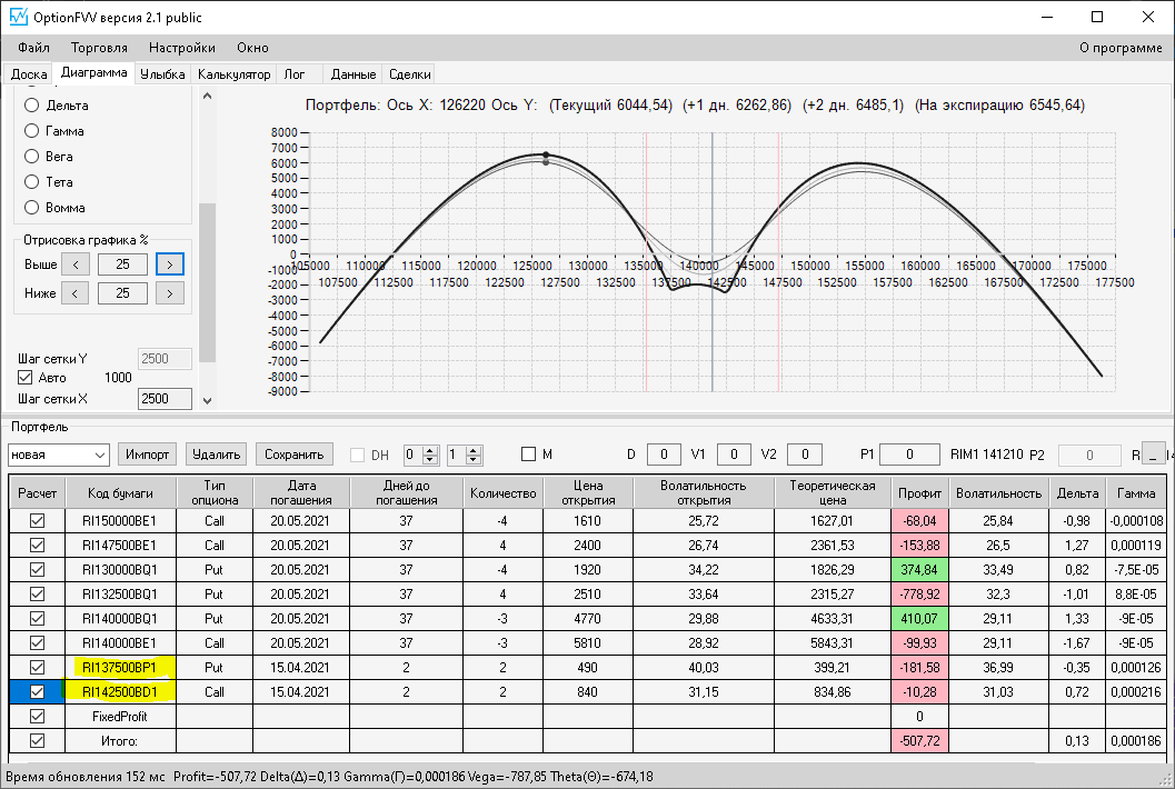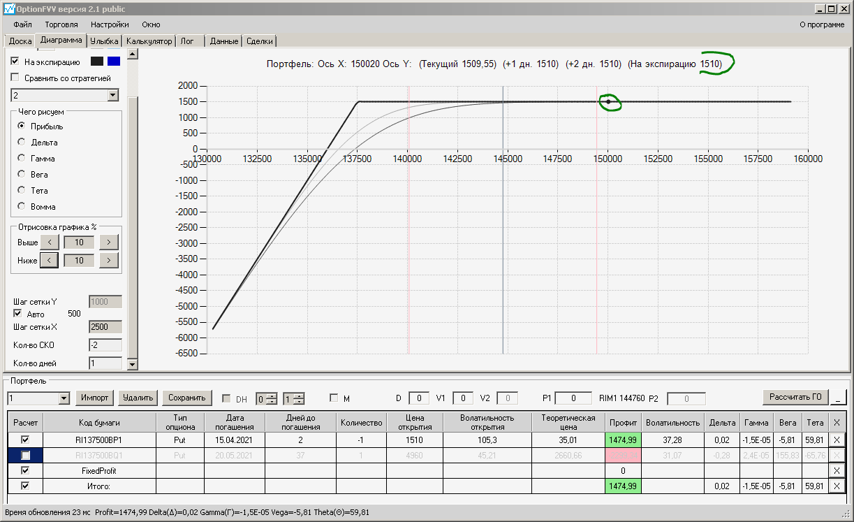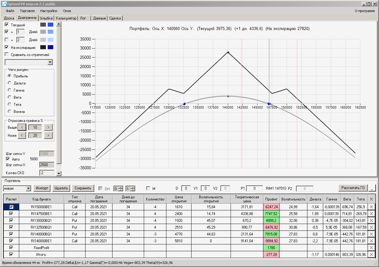 приехал домой фьючерс идёт вниз, волатильность увеличилась на 10%, первая покупка простого месячного опциона пут, даёт локальную прибыль, а вот вторая конструкция даёт локальный минус.