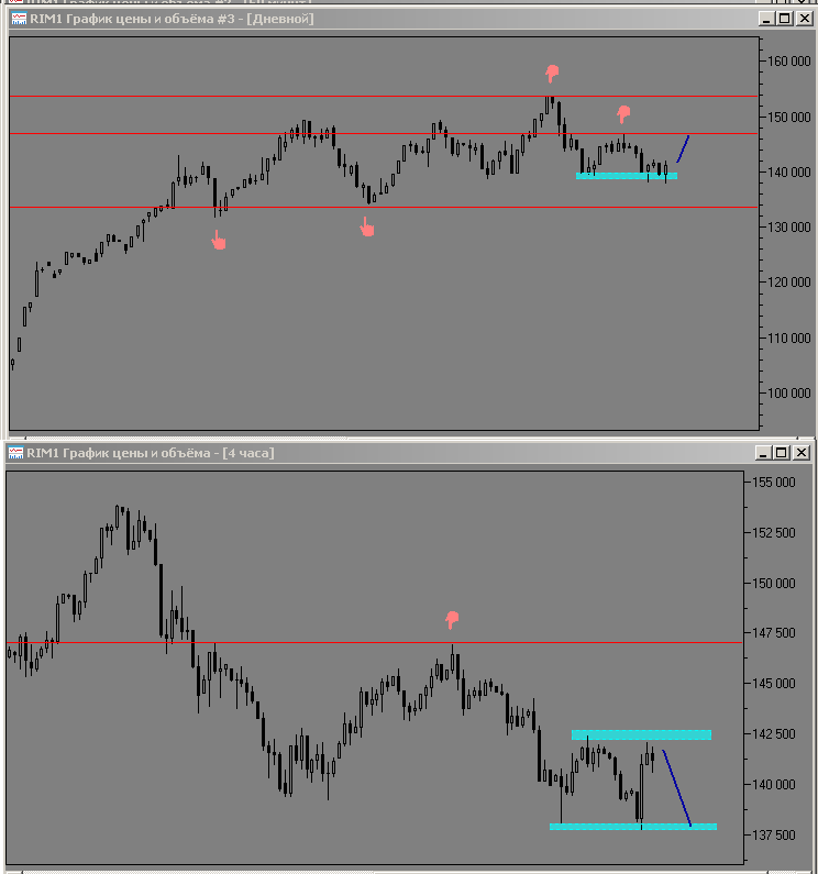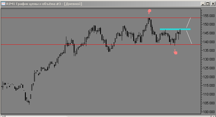 закрыл, и текущая цена фьючерса находится у правой контрольной точки, но фьючерс идёт на снижение, так что пока не будет пробой уровня сопротивления (это 146 396 пунктов уровень h4) страховать правый край колом не буду.
