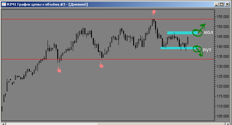 и так фьючерс на индекс РТС, показывает движение вниз, значит покупаю месячный опцион пут центрального страйка.