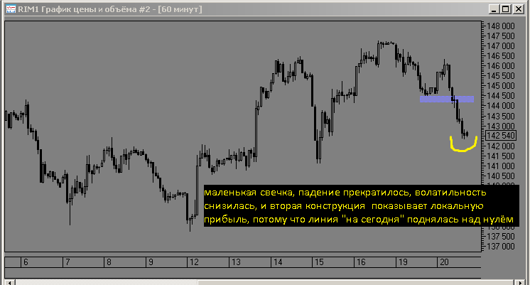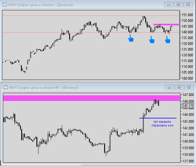 жду подъёма фьючерса до 145000 пунктов на h4 графике и закрываю страховку кол с прибылью. риск ночного движения вниз миновал, закрываю страховку пут, отметил жёлтым