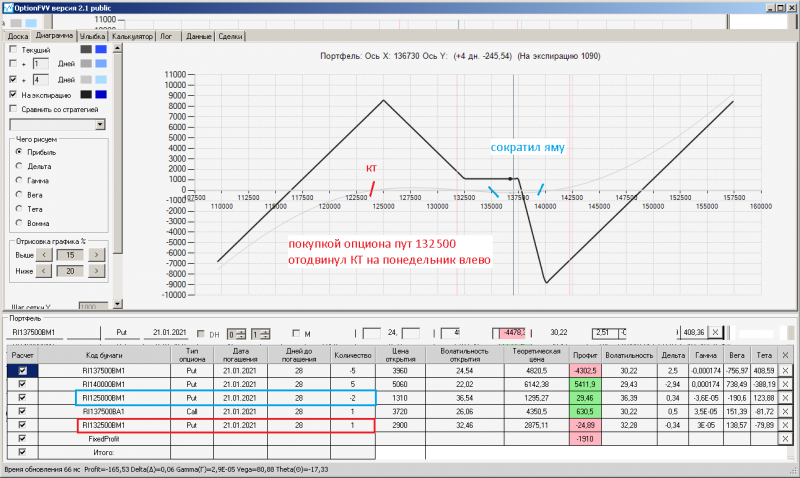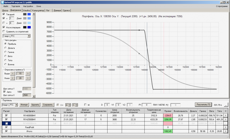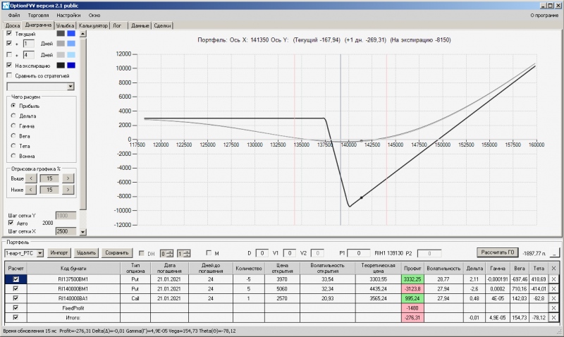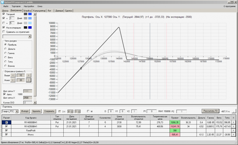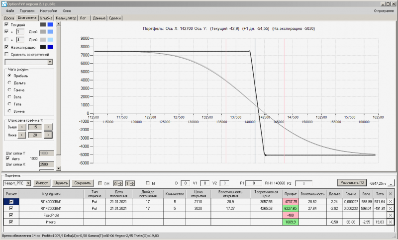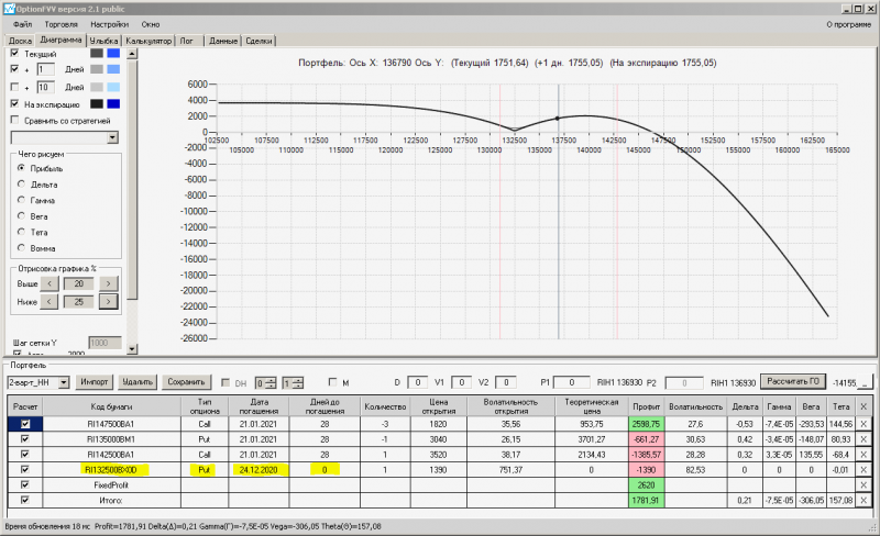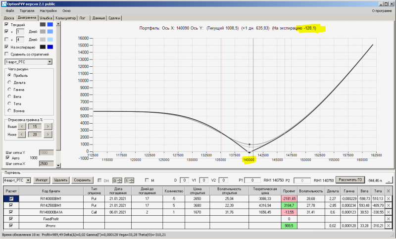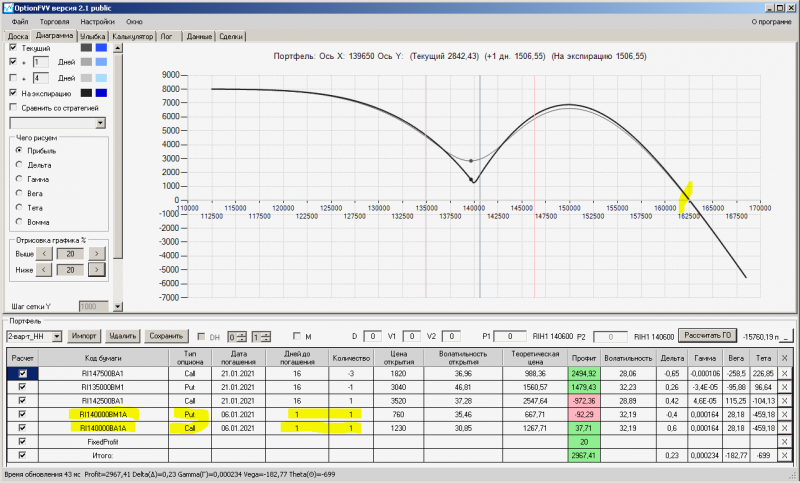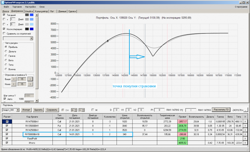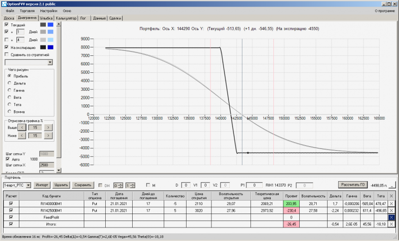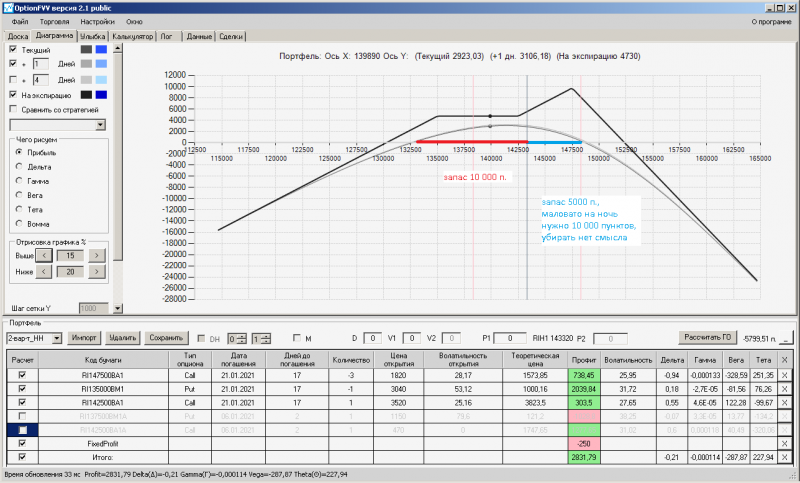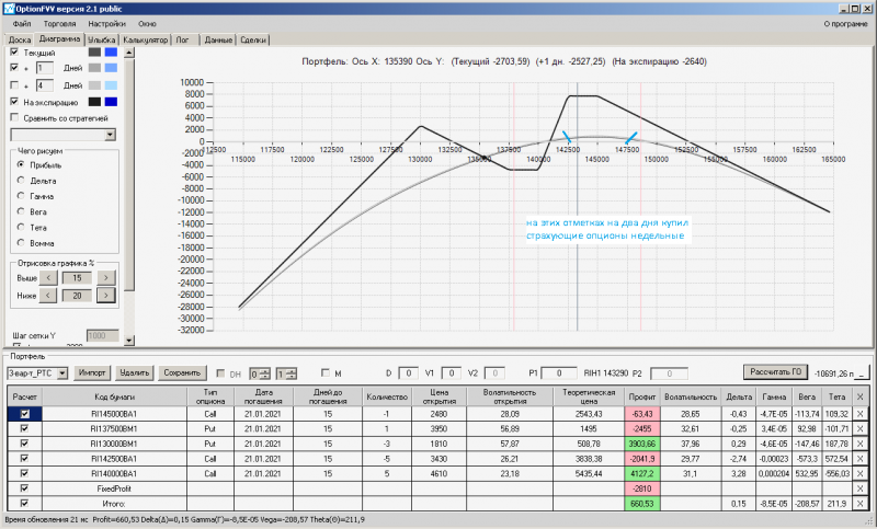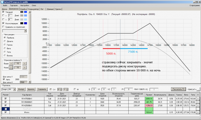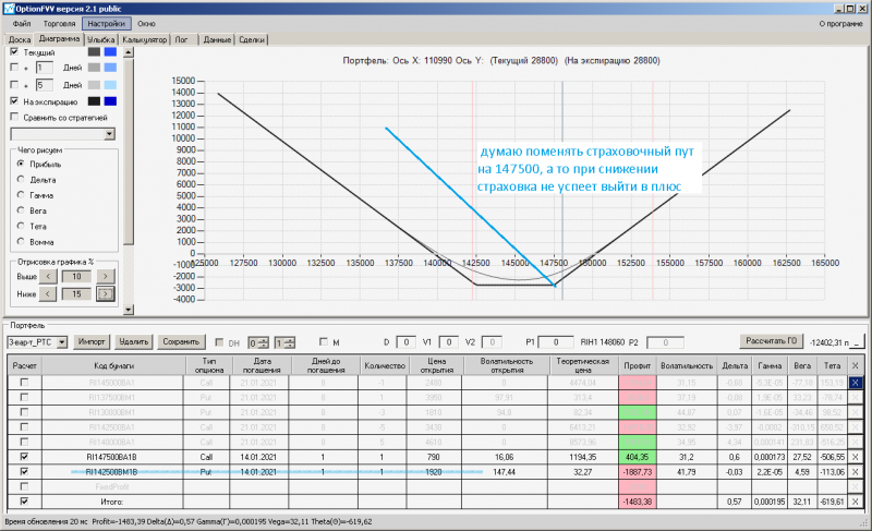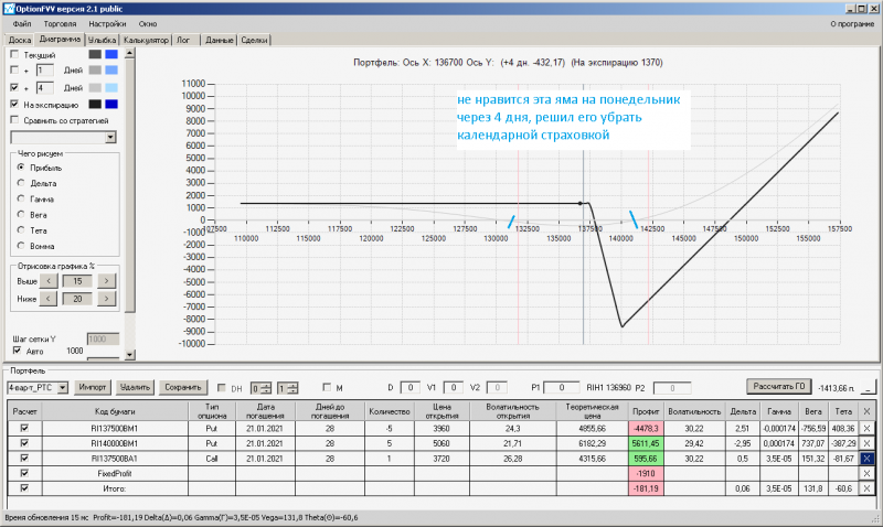пут-спред с временно отключенной страховкой, у него текущая цена фьючерса ушла вправо, посмотрю что завтра будет, пока страховка около нуля ни прибыли ни убытка по ней, может завтра что нибудь изменится.