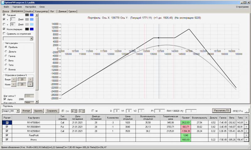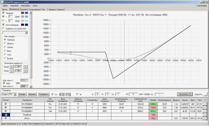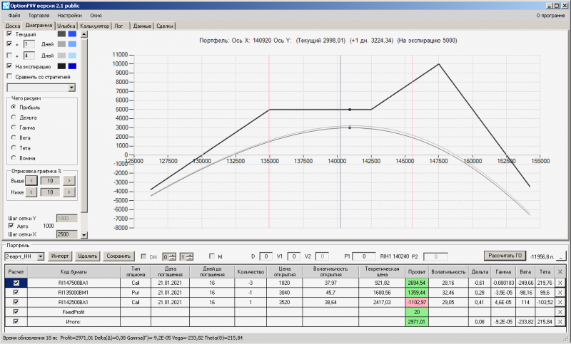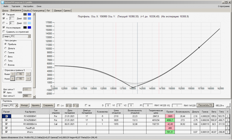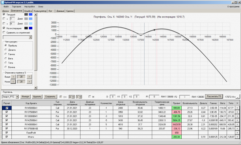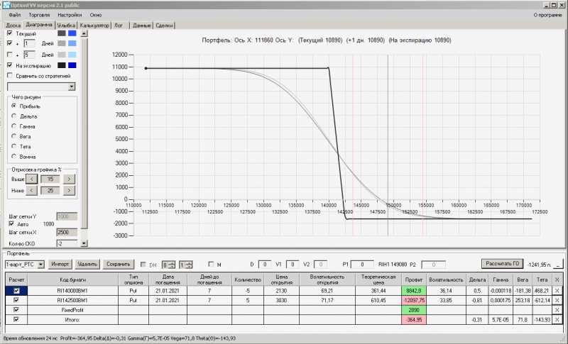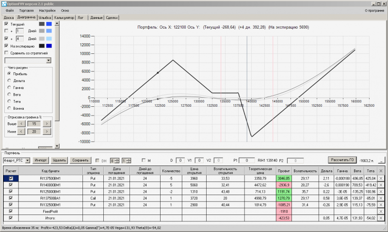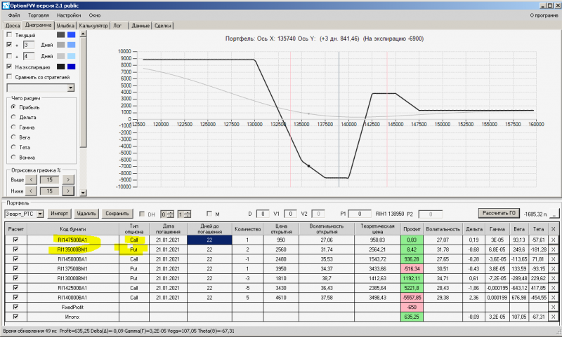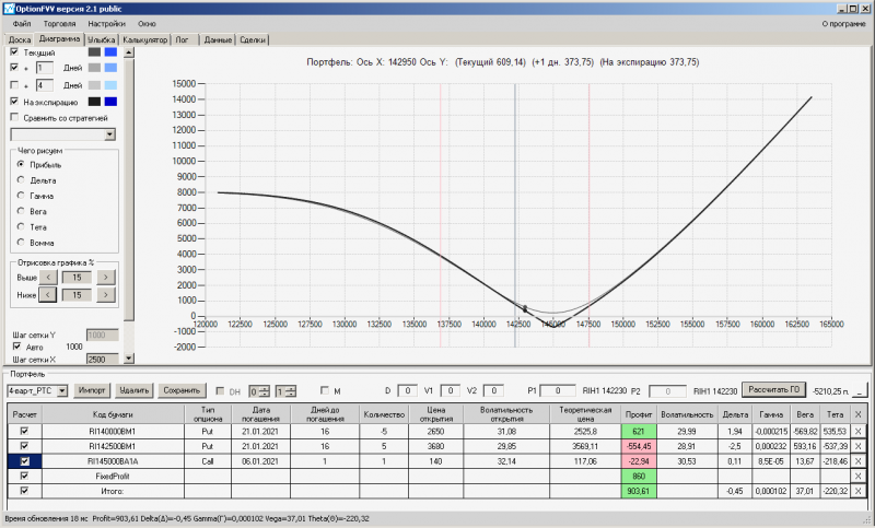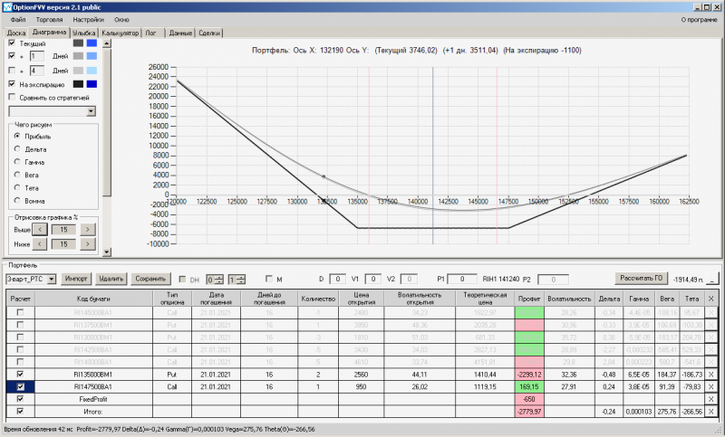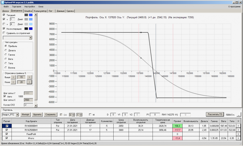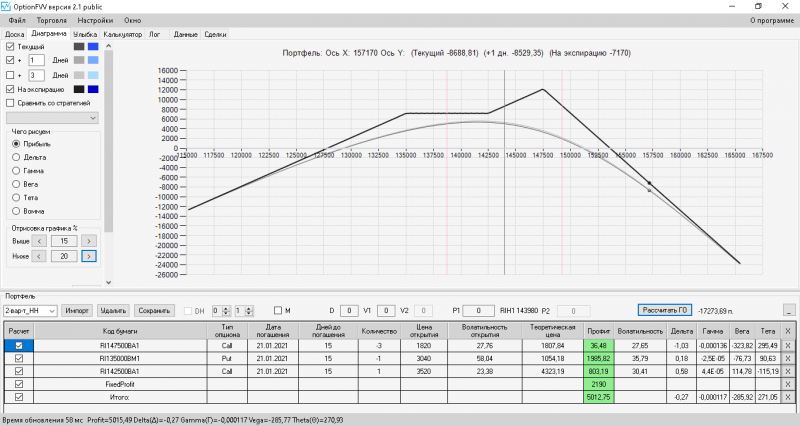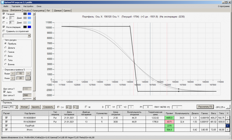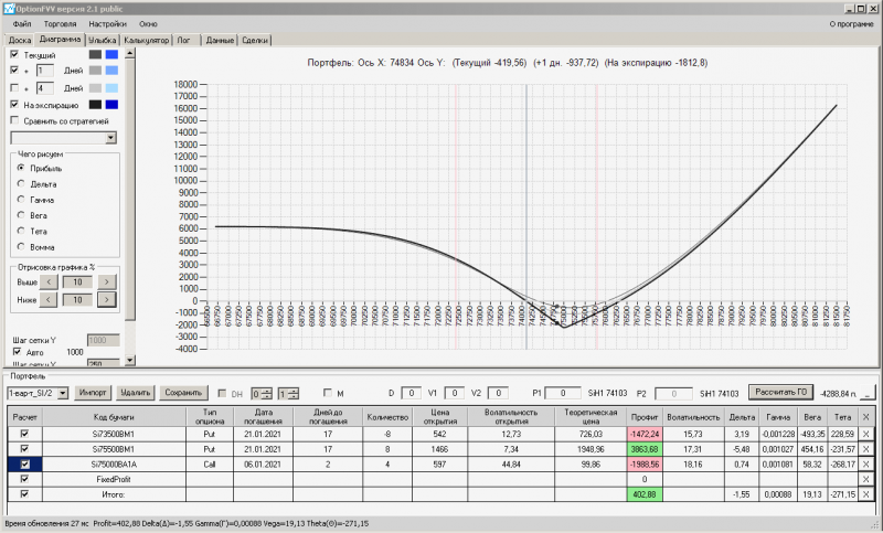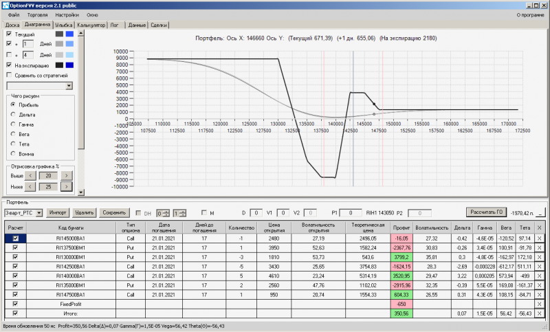 пут-спред с временно отключенной страховкой, у него текущая цена фьючерса ушла вправо, посмотрю что завтра будет, пока страховка около нуля ни прибыли ни убытка по ней, может завтра что нибудь изменится.