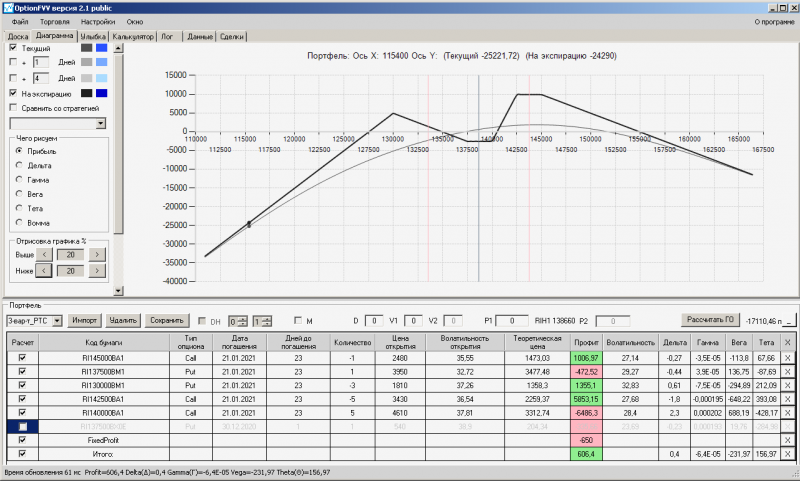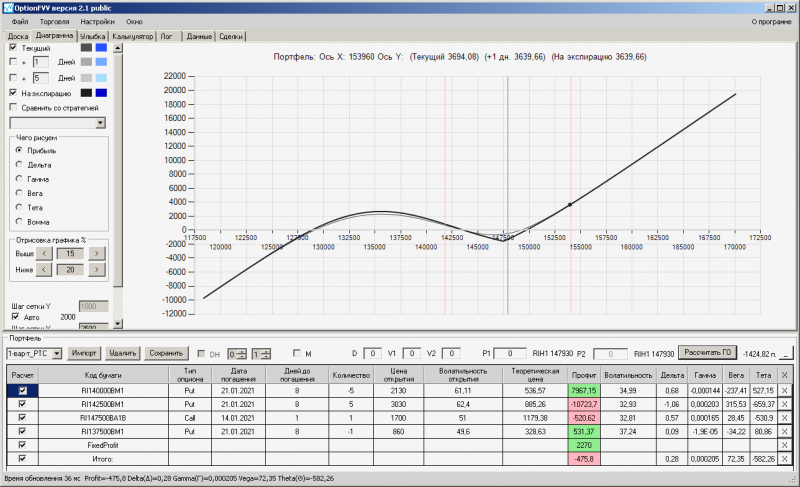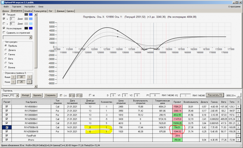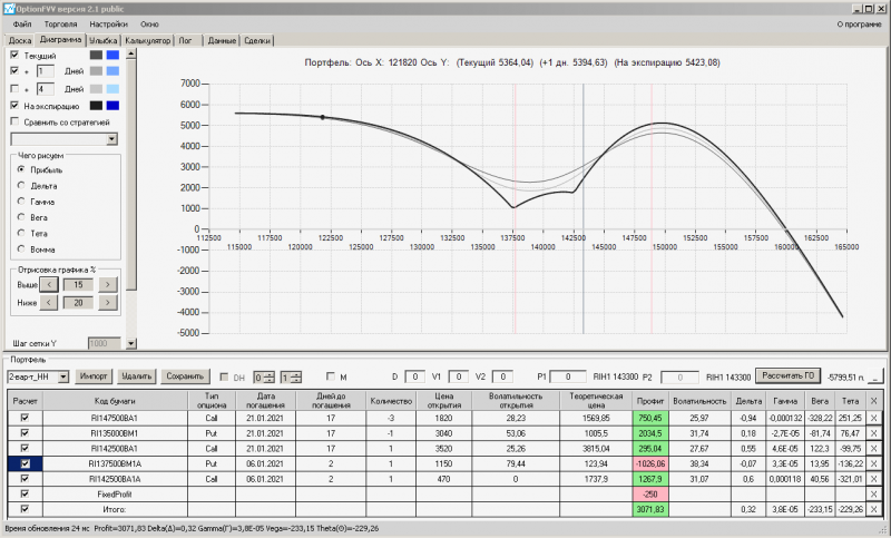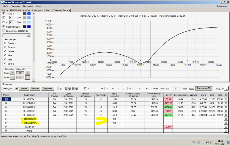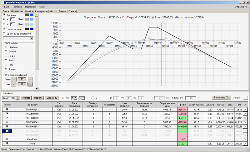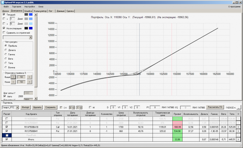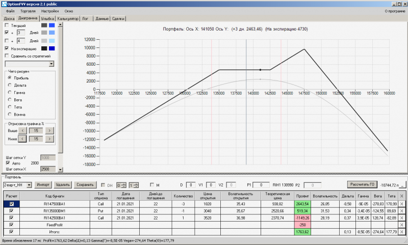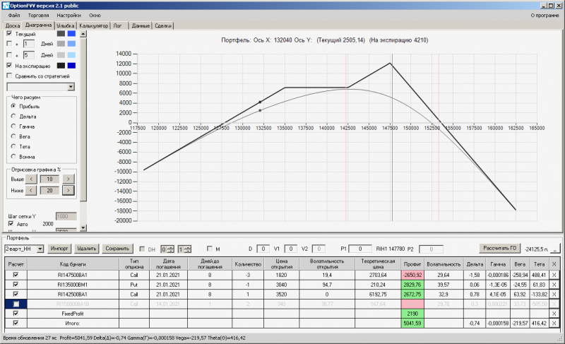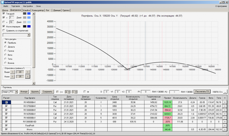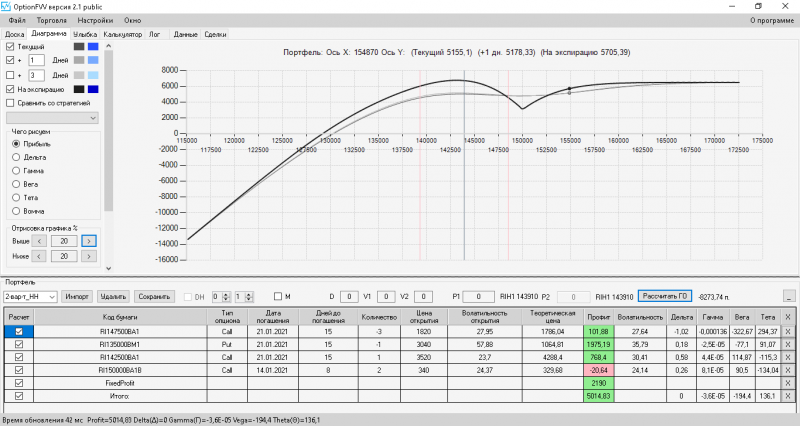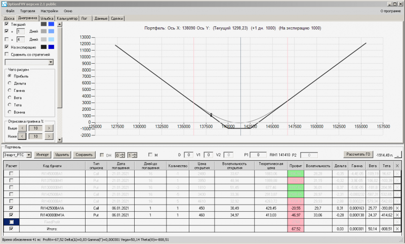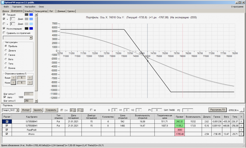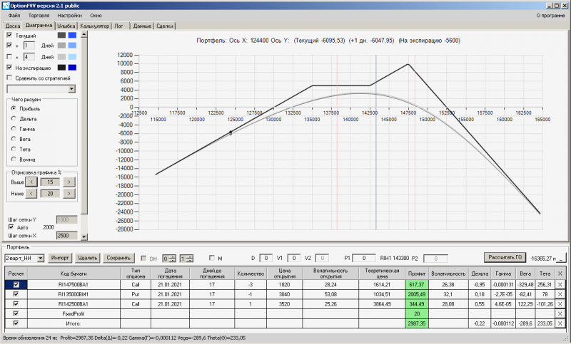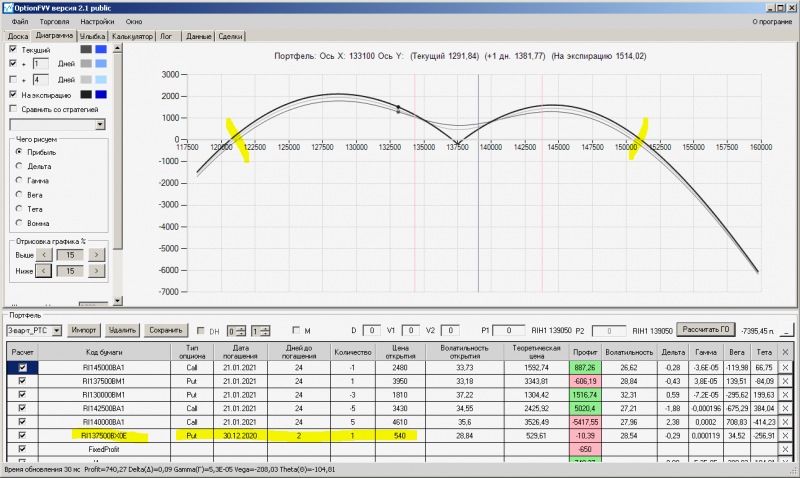 пут-спред с временно отключенной страховкой, у него текущая цена фьючерса ушла вправо, посмотрю что завтра будет, пока страховка около нуля ни прибыли ни убытка по ней, может завтра что нибудь изменится.