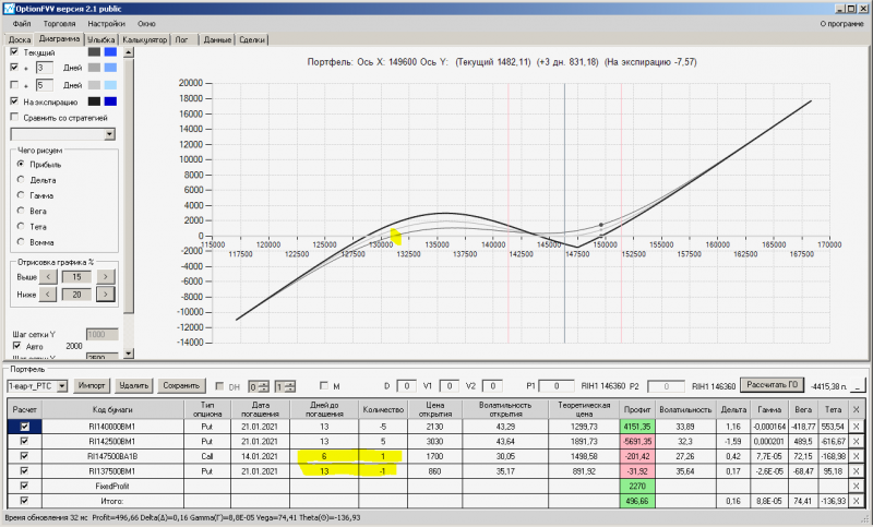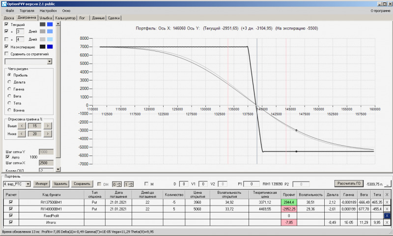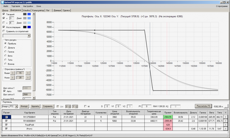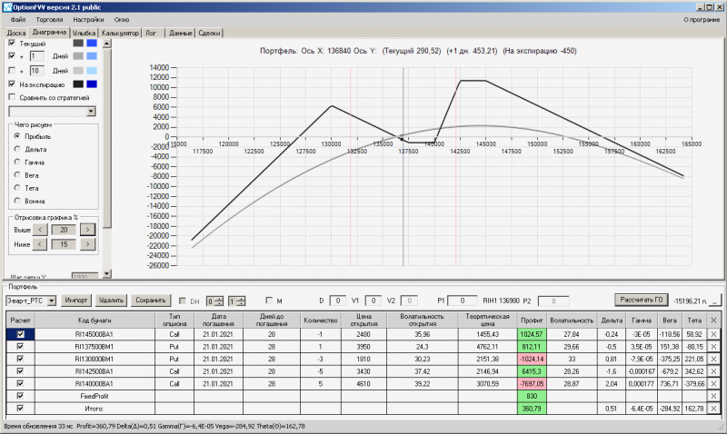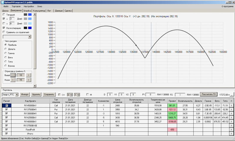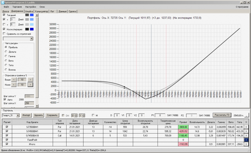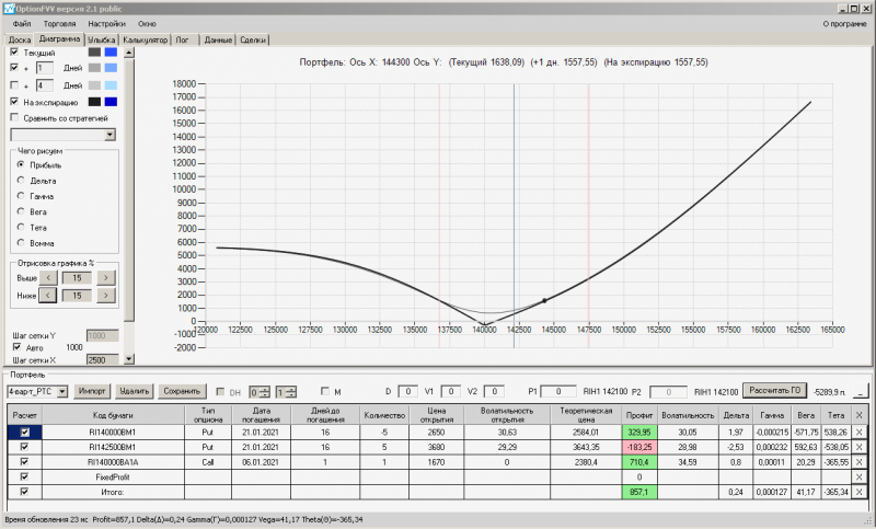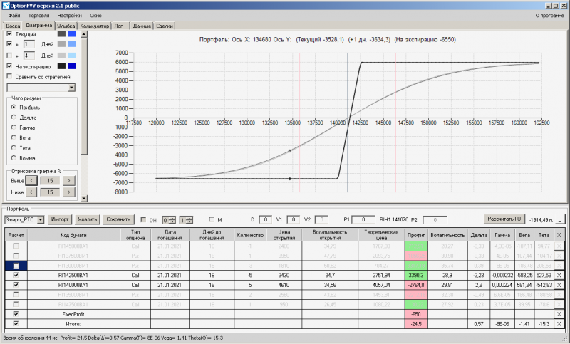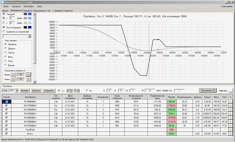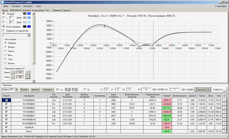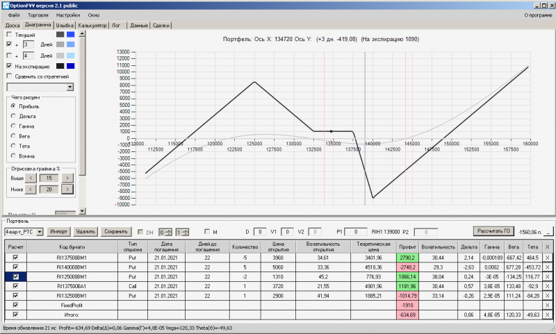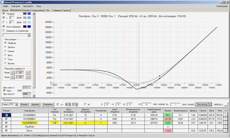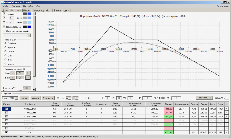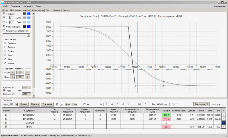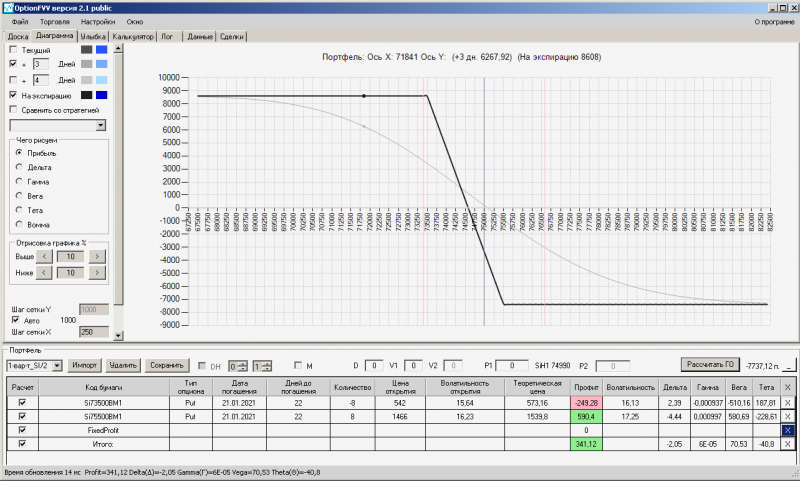 пут-спред с временно отключенной страховкой, у него текущая цена фьючерса ушла вправо, посмотрю что завтра будет, пока страховка около нуля ни прибыли ни убытка по ней, может завтра что нибудь изменится.