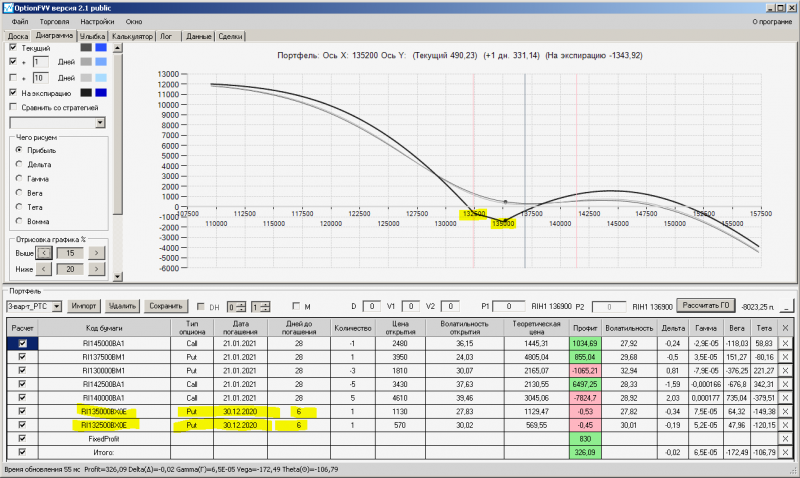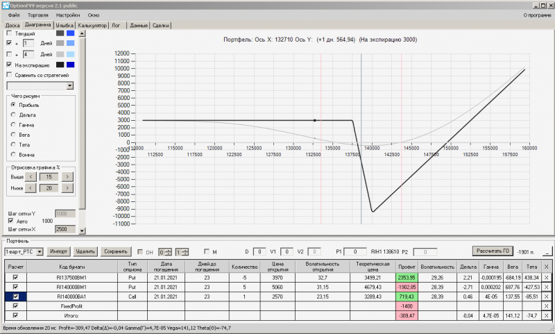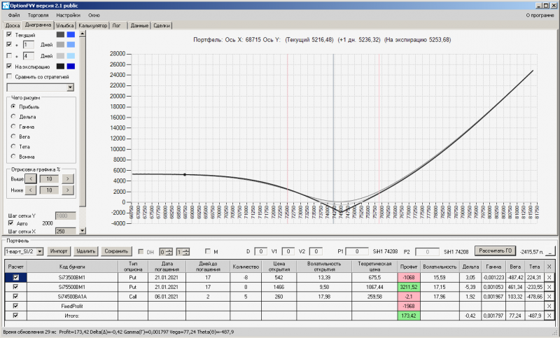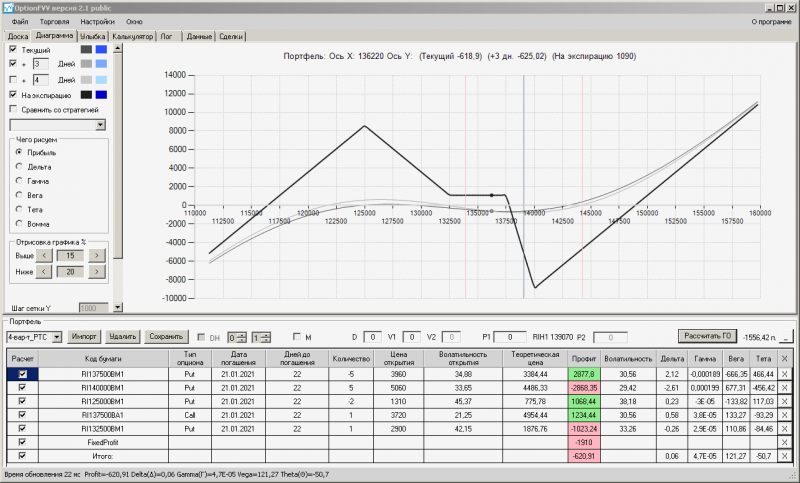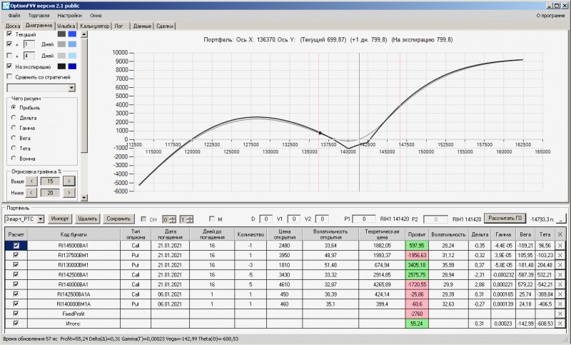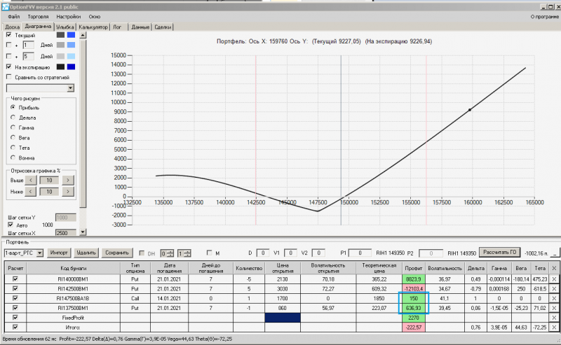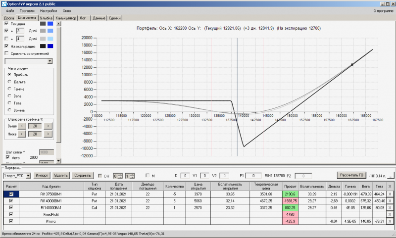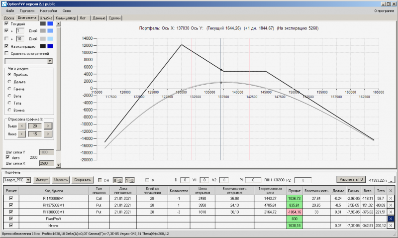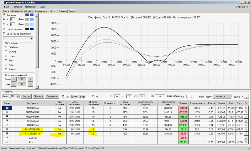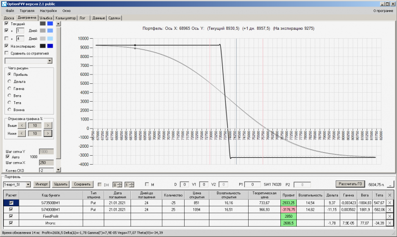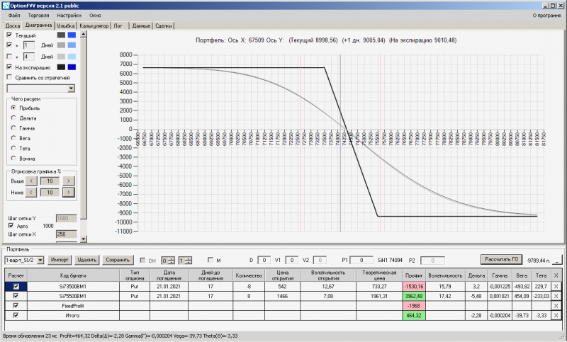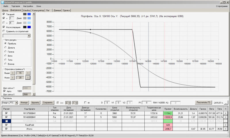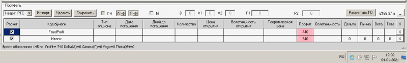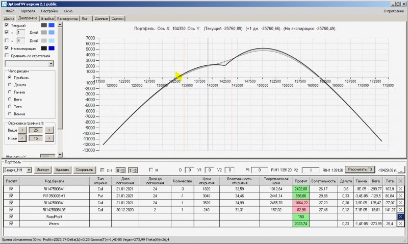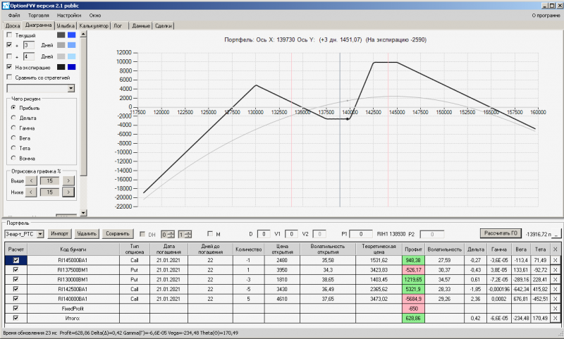 пут-спред с временно отключенной страховкой, у него текущая цена фьючерса ушла вправо, посмотрю что завтра будет, пока страховка около нуля ни прибыли ни убытка по ней, может завтра что нибудь изменится.