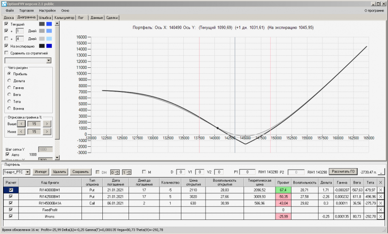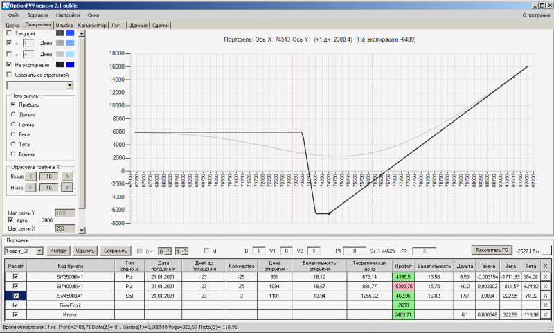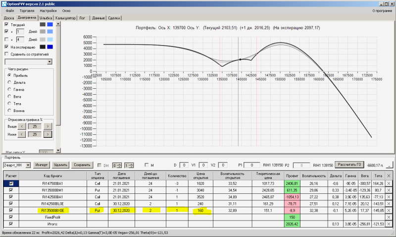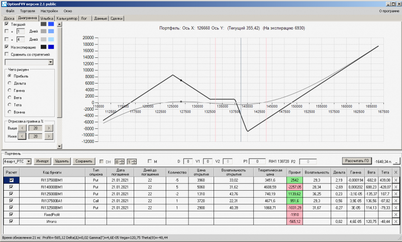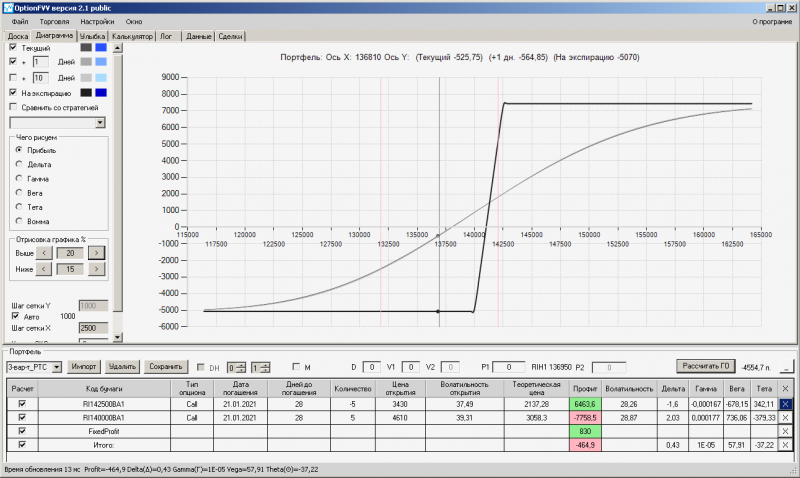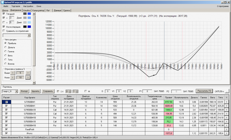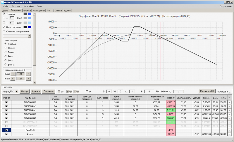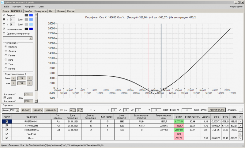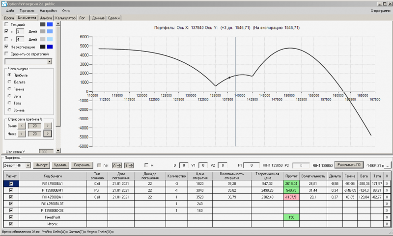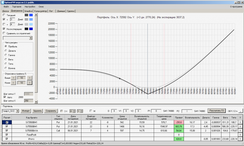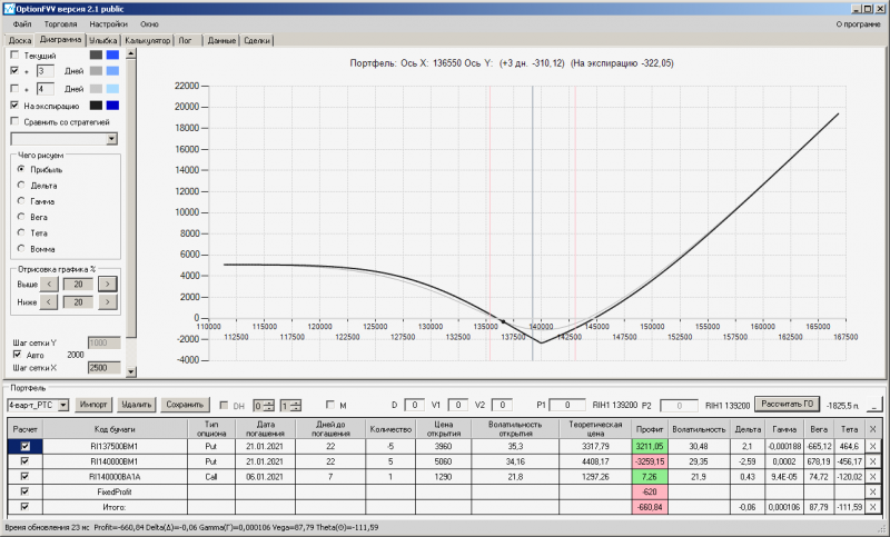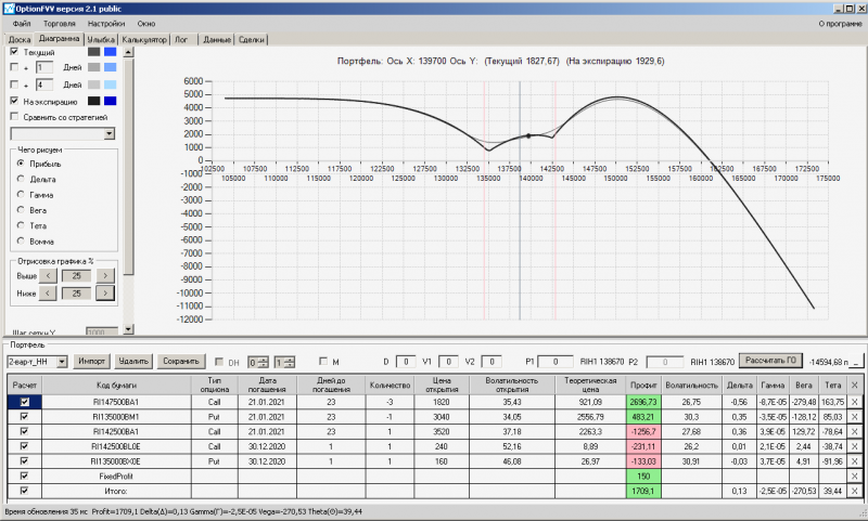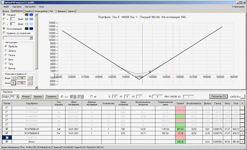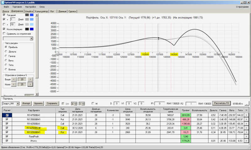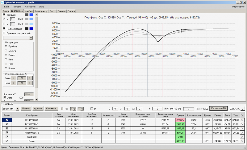 пут-спред с временно отключенной страховкой, у него текущая цена фьючерса ушла вправо, посмотрю что завтра будет, пока страховка около нуля ни прибыли ни убытка по ней, может завтра что нибудь изменится.