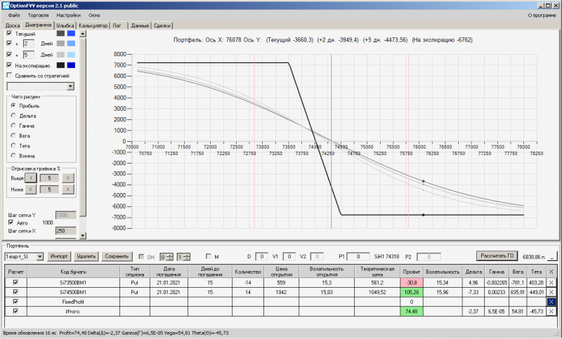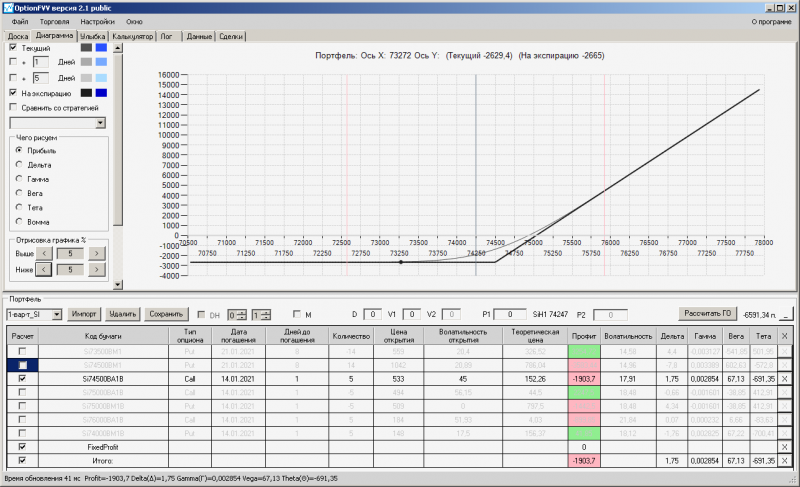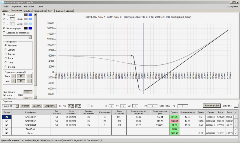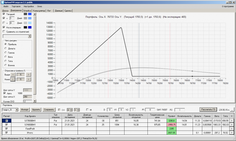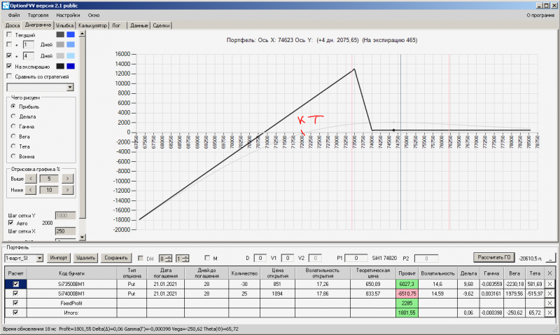 I-вариант: пут -спред по SI - достигнута максимально верхняя точка на линии "На сегодня", фиксирую прибыль закрываю 73500 путы в количестве пять штук, т.к. Рынок фьючерса движется вниз, открываю потенциал для снижения.