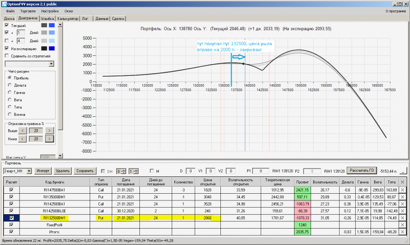 думал приподнять линию на экспирацию справа выше нуля, а оказалась линия ниже нуля (закрыл один купленный опцион пут)