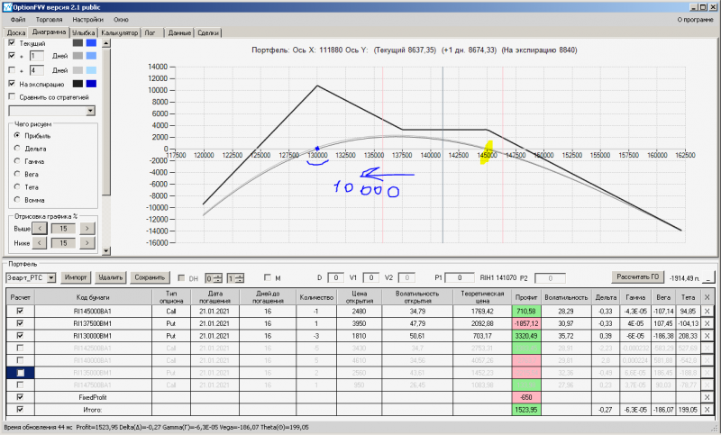 текущая цена фьючерса  ушла влево на 500 п. в сторону пут-спреда, естественно страховка стала минусить, закрываю страховку, профиль просел, теперь нужно застраховать справа, из-за закрытия страховки  близко подошли к нулевой линии.