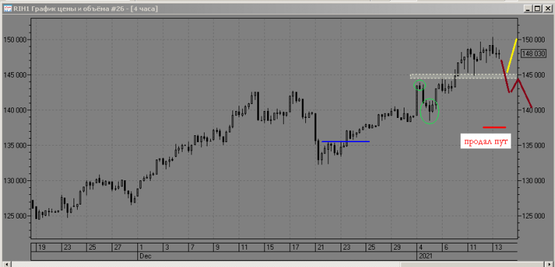 I-вариант: пут -спред по РТС цена ушла против пут-спреда и даёт в моменте плюс, закрываю конструкцию, на 3000 пунктов фьючерс ушёл вверх.