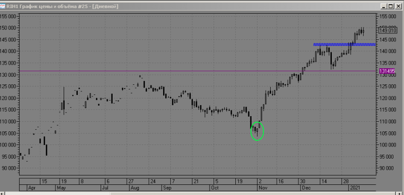 РТС идёт вверх, не смотря на попытку обновить отмеченный уровень поддержки, сейчас в моменте нет ретеста и проходим уровень вверх.