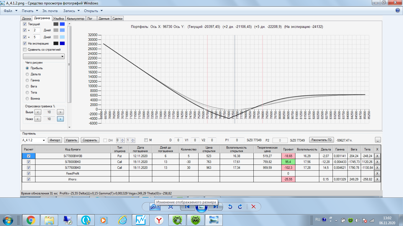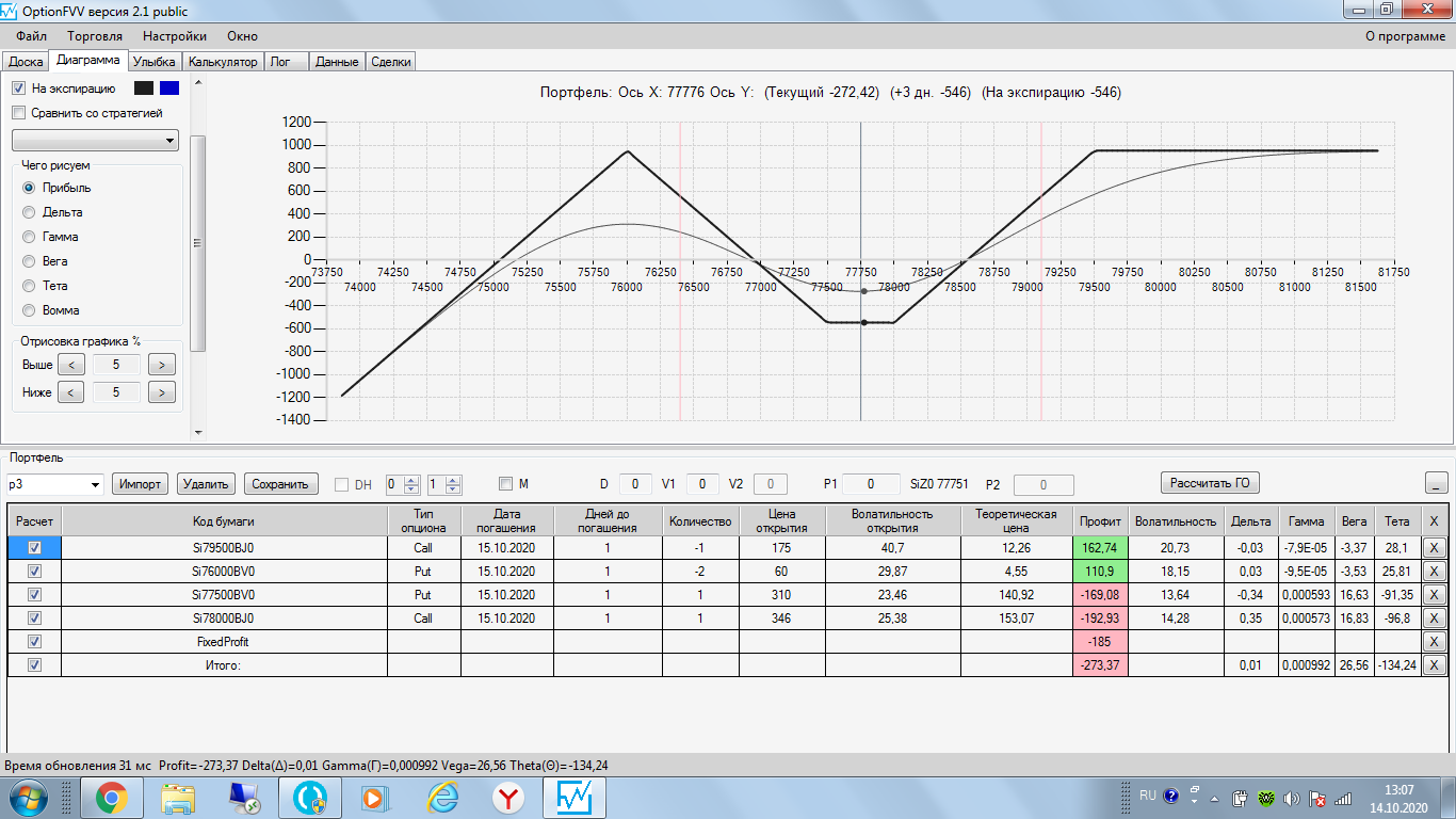 Вот такая реальная конструкция, которую я выставил на прошлой неделе в реале. Только сначала был куплен CALL 78500 по 405р., затем при движении цены вниз продан по 220 р. и взамен куплен CALL 78000. Пока несу убытки. Надеюсь все-таки, что за сегодня-завтра цена выйдет из убыточного коридора.