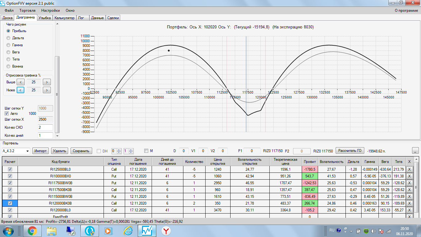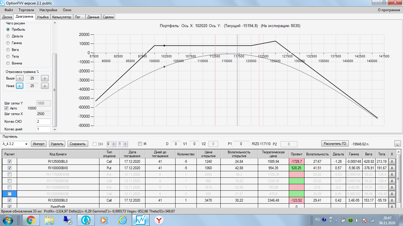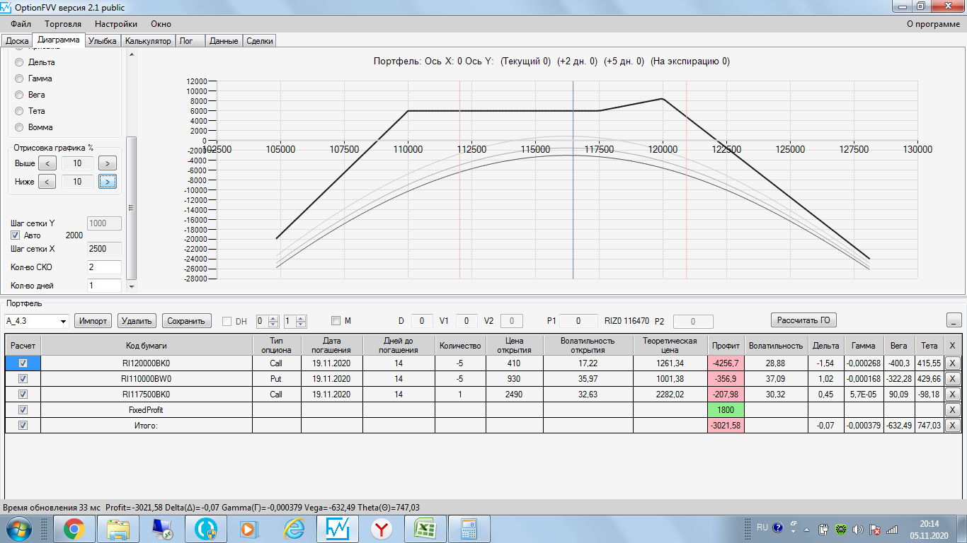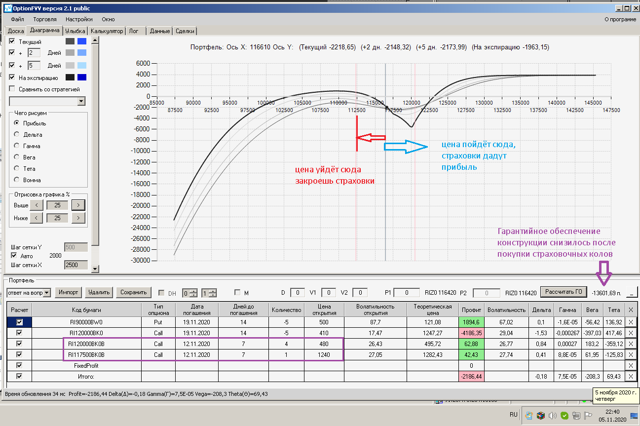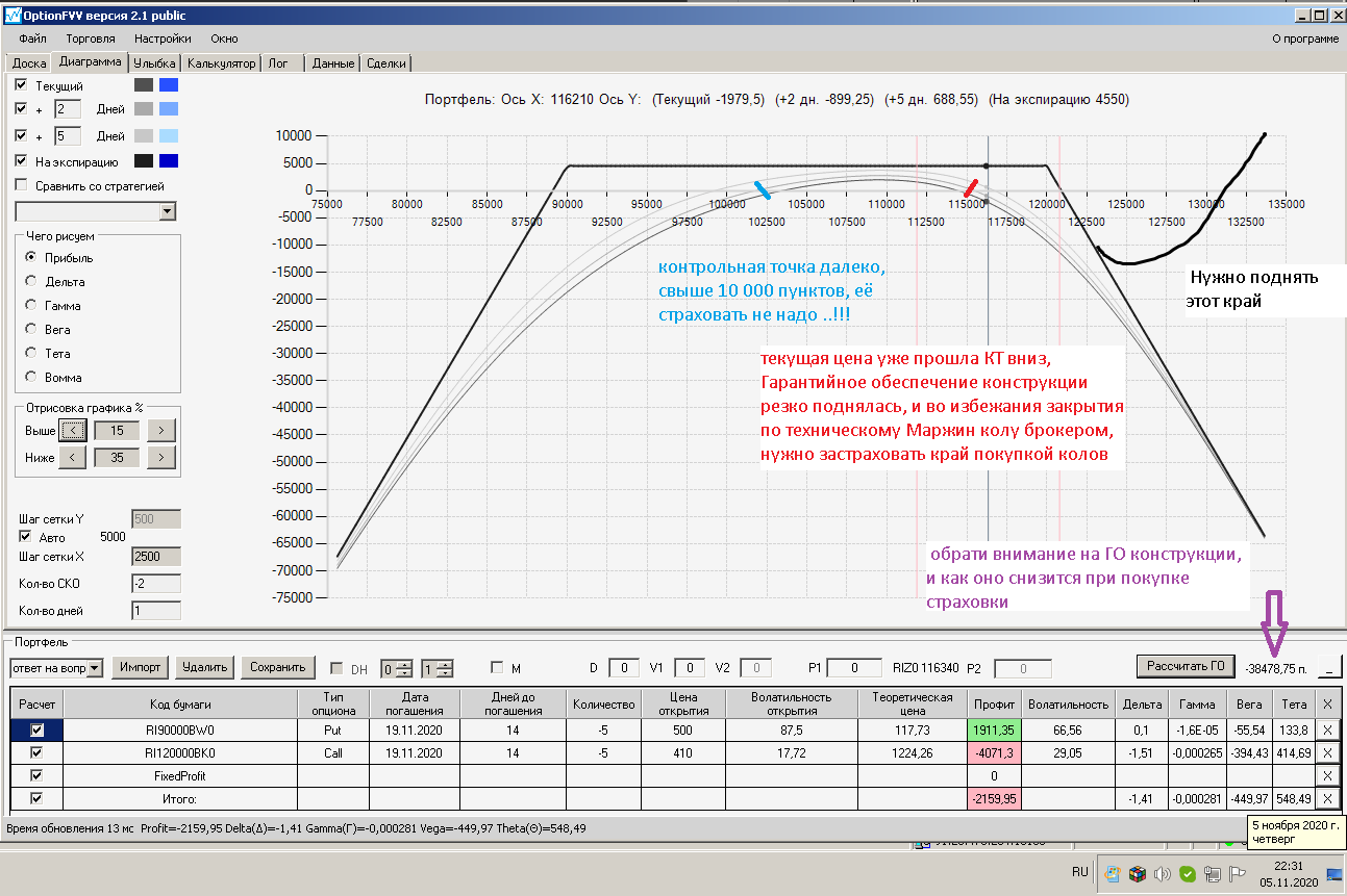 Относительно длинного перевернутого стренгла тоже вижу, что накосячил (после повторного просмотра урока). Прошу прощения. Вот, уж, и вправду - поспешишь, людей насмешишь... Руки чешутся, хочется в бой, кажется, что все просто, ясно и понятно))... Однако!... Для интереса старую конструкцию (экспирация 19.11) сохранил, но сделал новую, в полном соответствии с заданием. Экспирация 17.12, цена 1 опциона не менее 1000 пп. Ближе к ночеру застрахую края до понедельника недельными опционами.