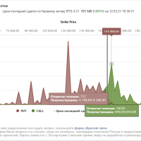 Т.е. сейчас получается, что в данный момент времени цена вошла в один из страйков сборки ОК, и её нужно разбирать. Прибыль без учёта отбивки фьючерсом составляет 2000 пунктов (Х 1,4 = 2800 рублей) при ГО 7740 пунктов, примерно 25% от ГО за 1,5 месяца.