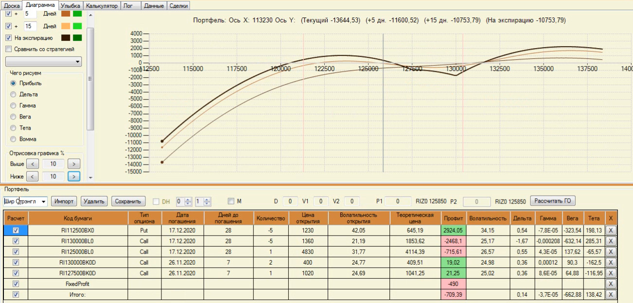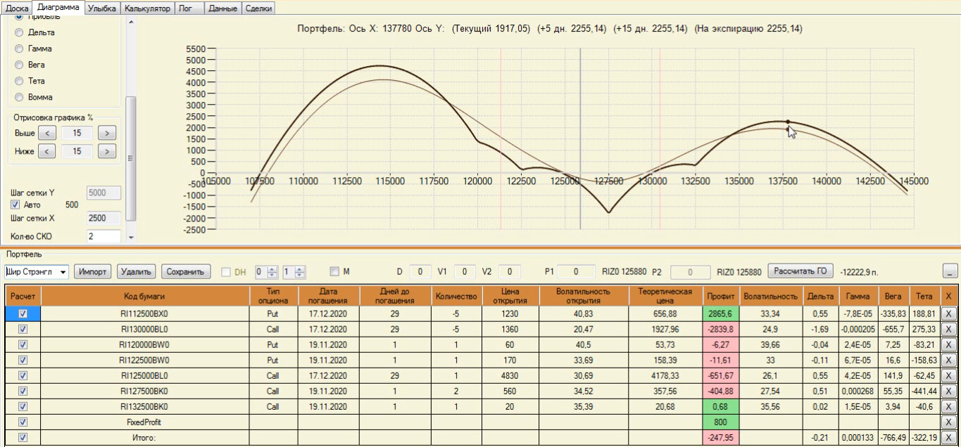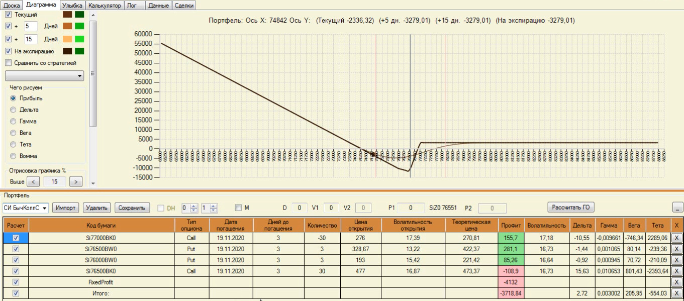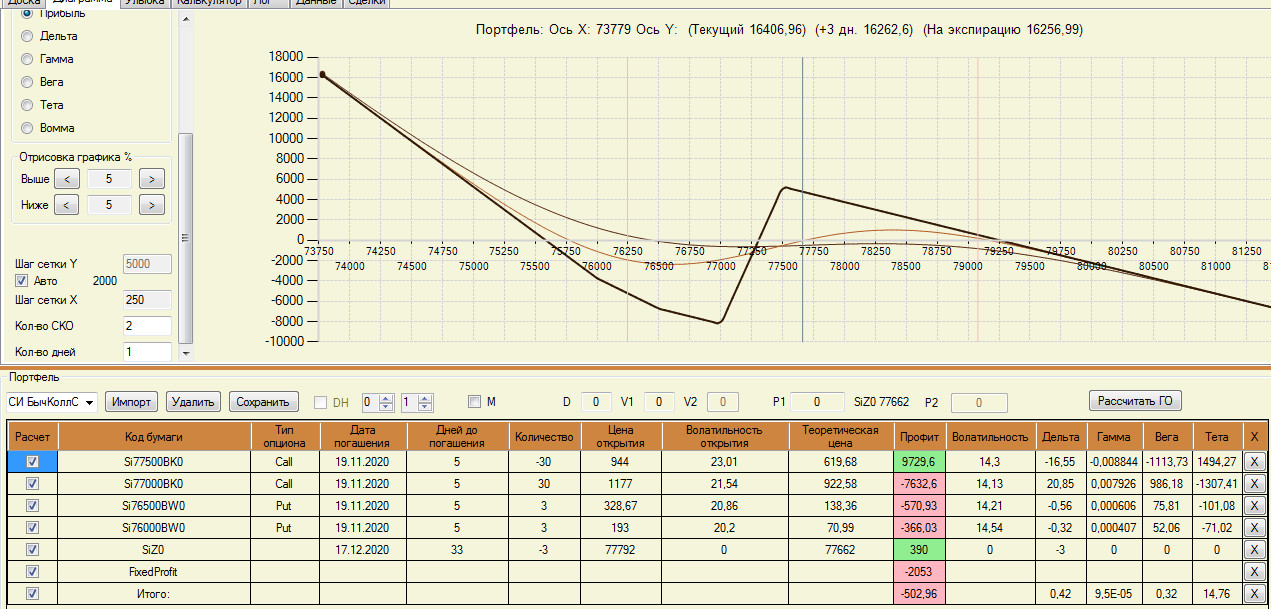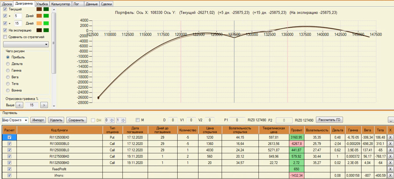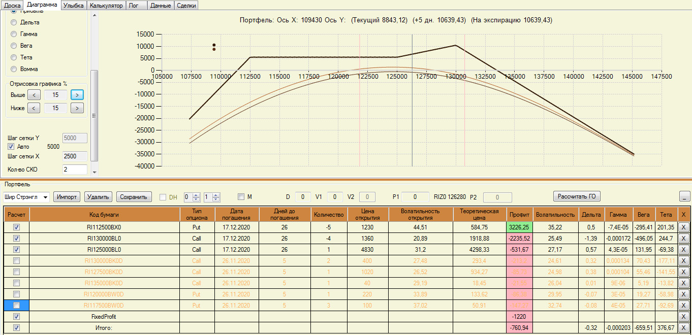 Вообще,.. 2 числа, перед выборами и перед выходным, я страховку сделать к сожалению не успел. Страховочным опционам, на тот момент, оставалось жить ещё 3 дня... И пришлось мне "быстренько" делать страховки (конечно виртуально, в Аналитике) на закрытом ещё рынке утром 5 числа , что было не совсем корректно по ценам опционов, волатильности и т.д., но лучше поздно чем никогда. Здесь грешен, - признАюсь! Впредь постараюсь не допустить, тем более на реальных сделках. Геннадий, жутковатый вид конструкция приобрела утром 5 числа после выборов в США, выходного в РФ, и это НЕ по вине "высыхающих страховых опционов", а по причине сильно "вздувшейся" волатильности на страхах толпы после выборов и перед открытием рынка ФОРТС. Таким образом у проданного стрэнгла временная линия профиля сильно "нырнула" вниз, в минус, опустив и линию страховочных опционов - поэтому и получился жутковатый вид у конструкции.