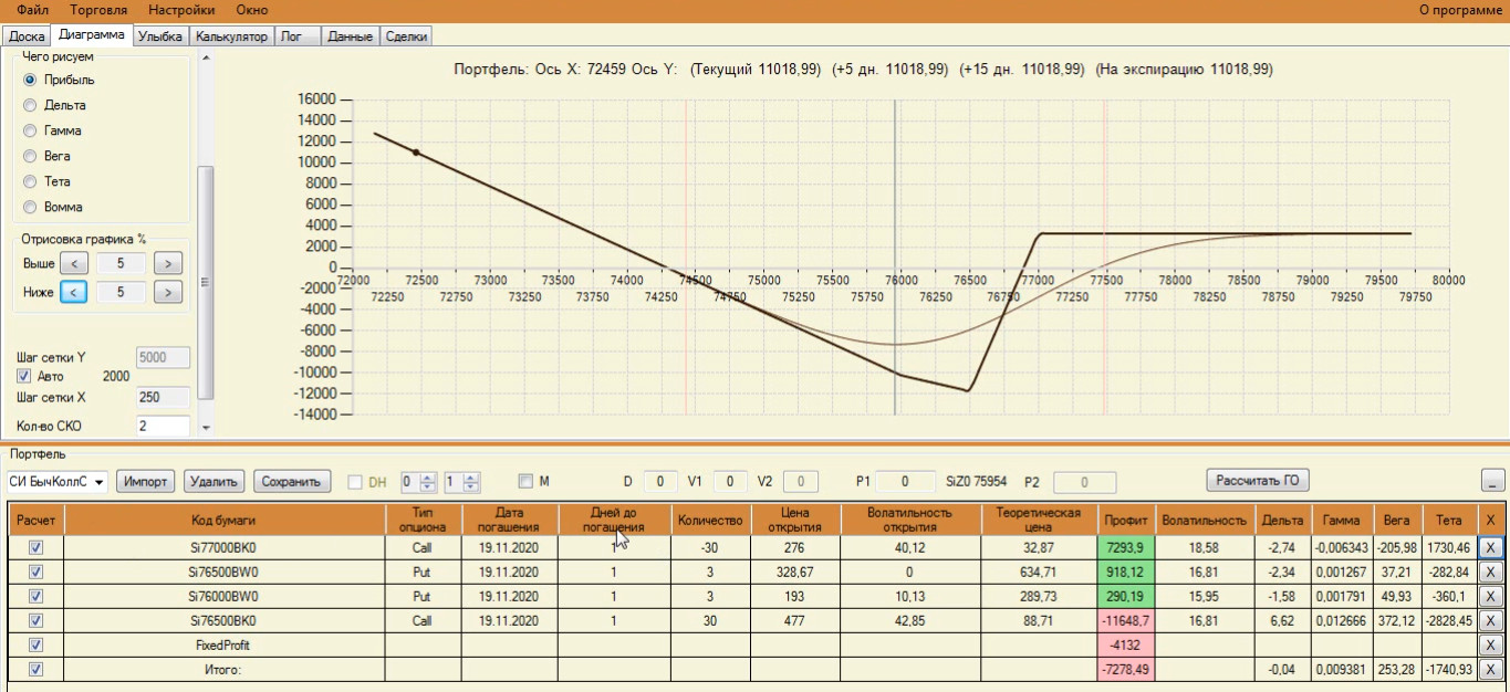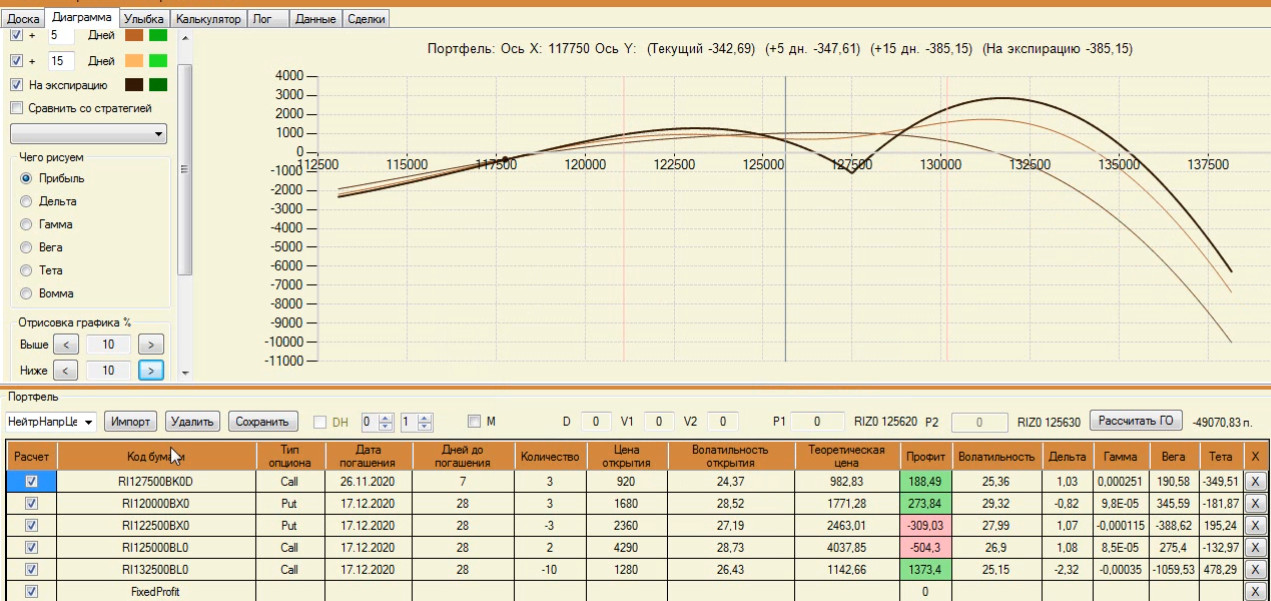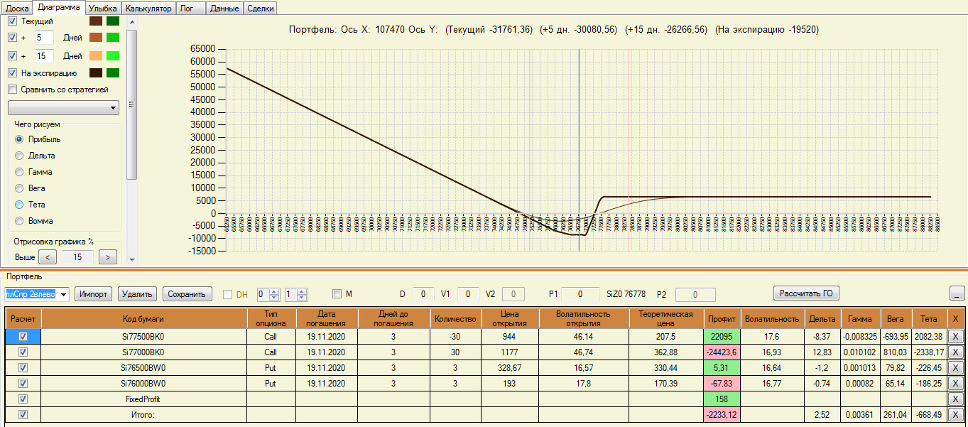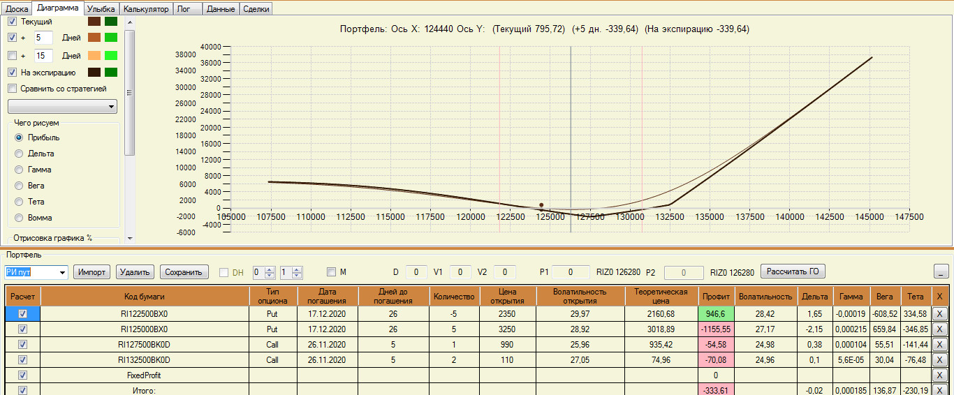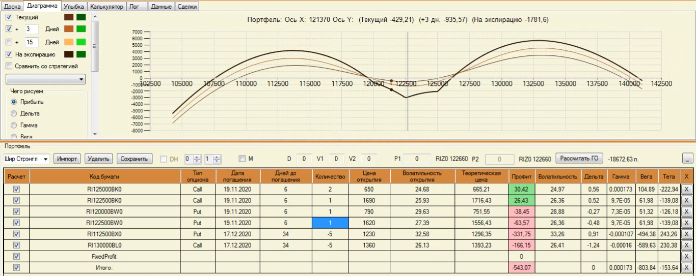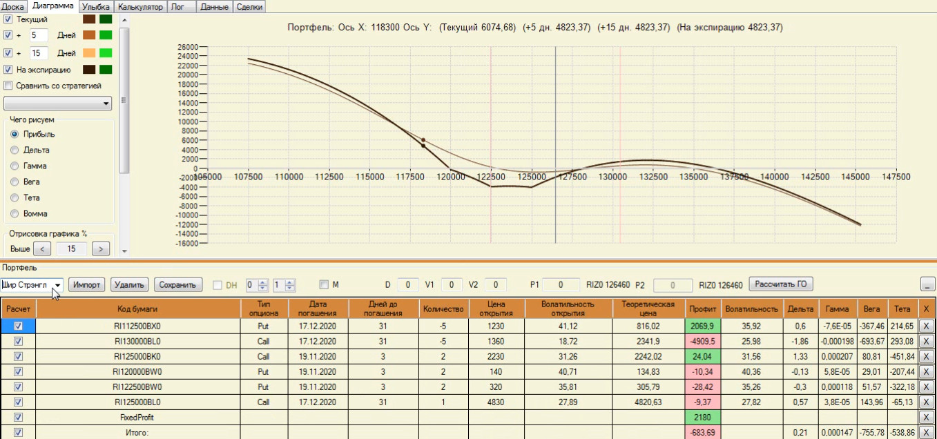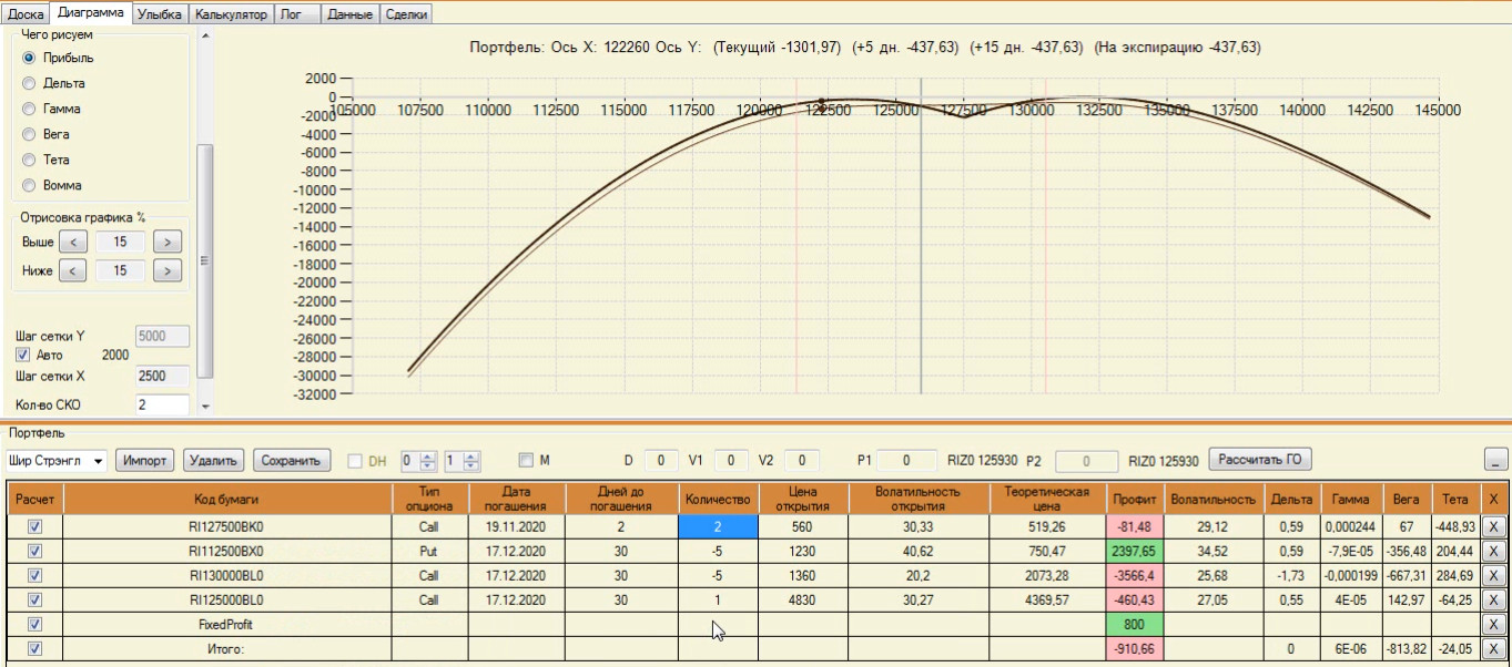 Вообще,.. 2 числа, перед выборами и перед выходным, я страховку сделать к сожалению не успел. Страховочным опционам, на тот момент, оставалось жить ещё 3 дня... И пришлось мне "быстренько" делать страховки (конечно виртуально, в Аналитике) на закрытом ещё рынке утром 5 числа , что было не совсем корректно по ценам опционов, волатильности и т.д., но лучше поздно чем никогда. Здесь грешен, - признАюсь! Впредь постараюсь не допустить, тем более на реальных сделках. Геннадий, жутковатый вид конструкция приобрела утром 5 числа после выборов в США, выходного в РФ, и это НЕ по вине "высыхающих страховых опционов", а по причине сильно "вздувшейся" волатильности на страхах толпы после выборов и перед открытием рынка ФОРТС. Таким образом у проданного стрэнгла временная линия профиля сильно "нырнула" вниз, в минус, опустив и линию страховочных опционов - поэтому и получился жутковатый вид у конструкции.