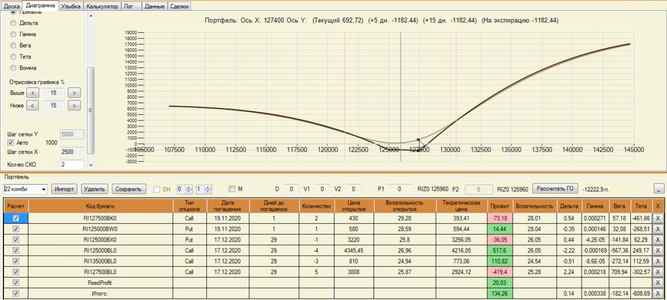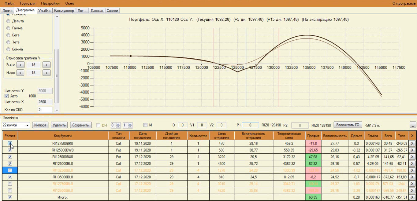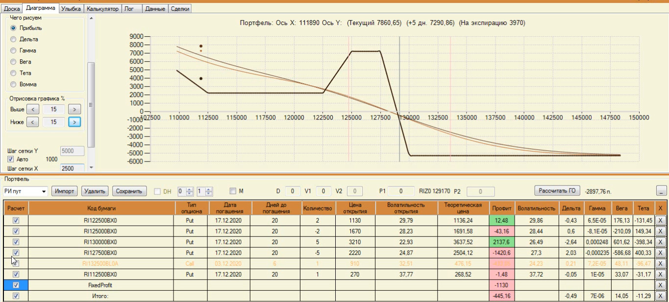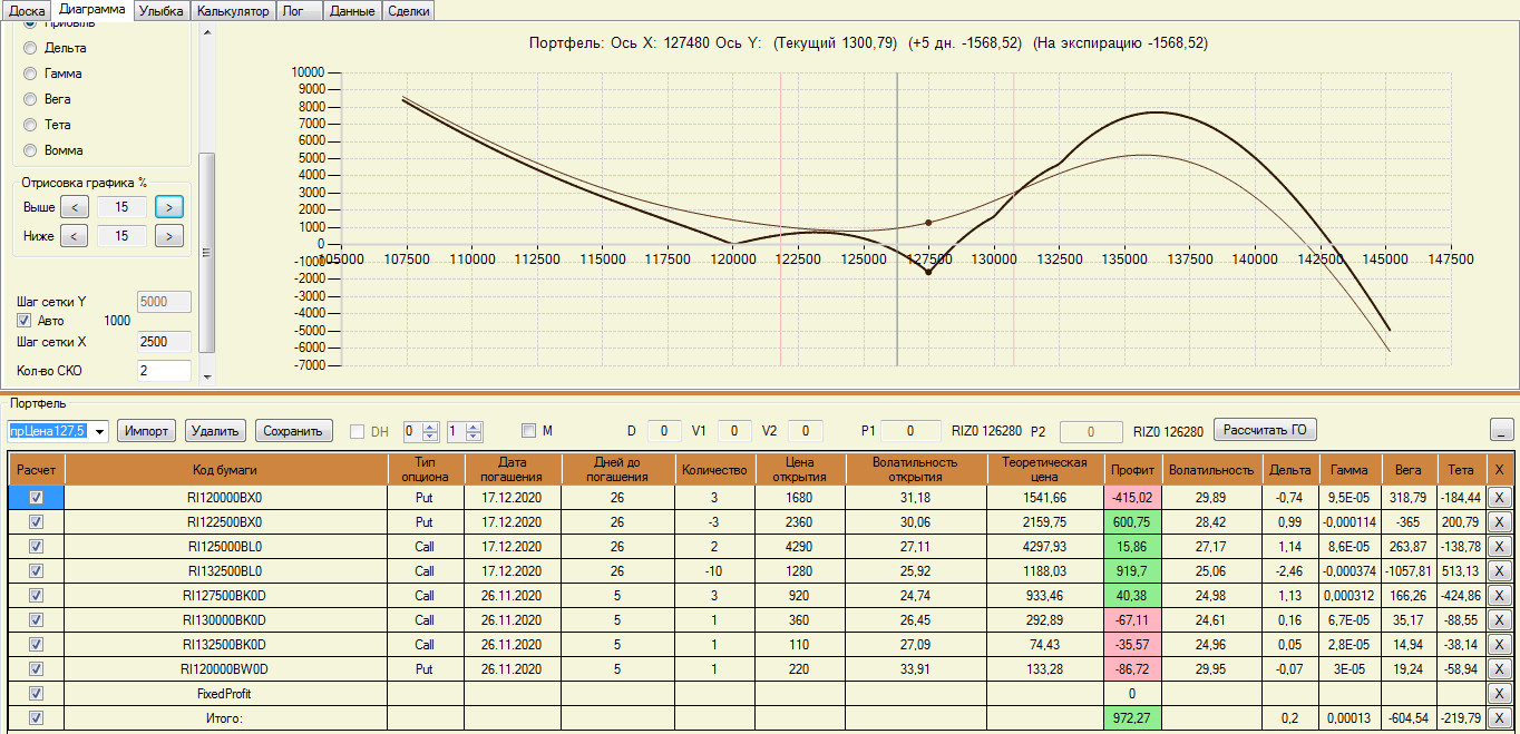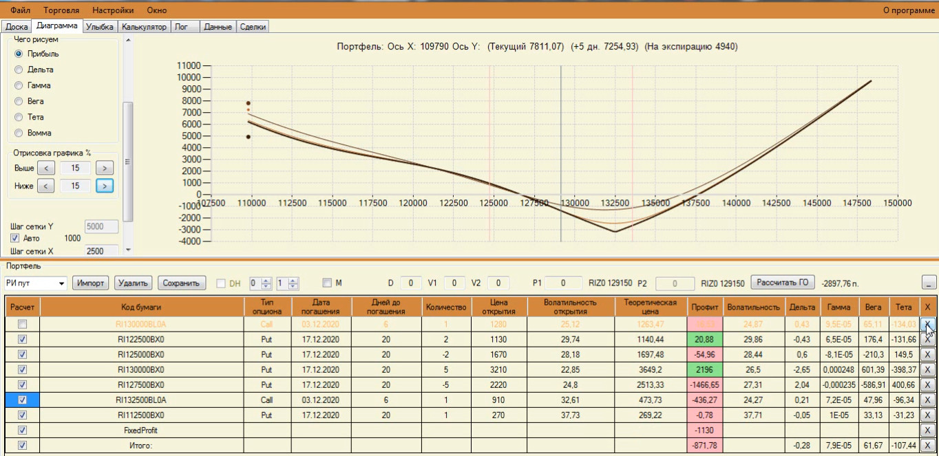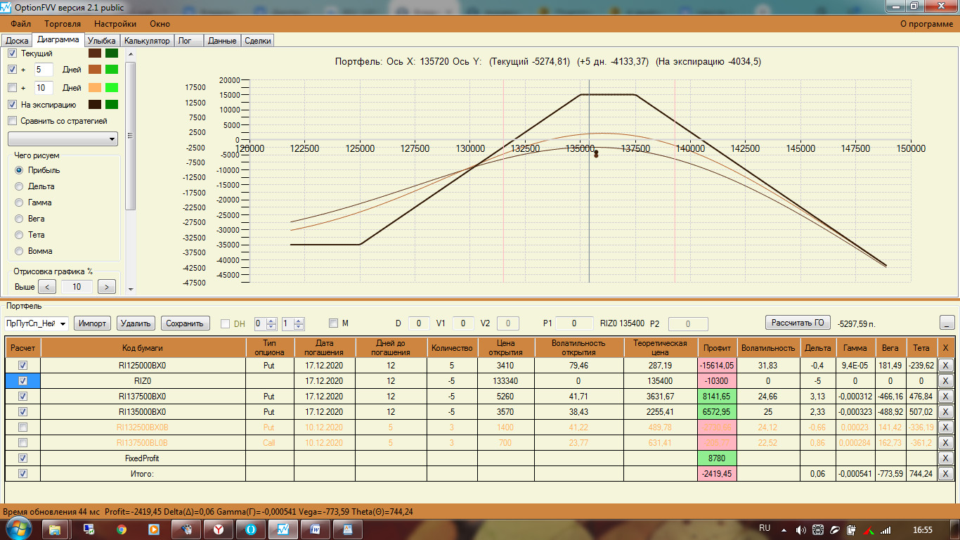 Вообще,.. 2 числа, перед выборами и перед выходным, я страховку сделать к сожалению не успел. Страховочным опционам, на тот момент, оставалось жить ещё 3 дня... И пришлось мне "быстренько" делать страховки (конечно виртуально, в Аналитике) на закрытом ещё рынке утром 5 числа , что было не совсем корректно по ценам опционов, волатильности и т.д., но лучше поздно чем никогда. Здесь грешен, - признАюсь! Впредь постараюсь не допустить, тем более на реальных сделках. Геннадий, жутковатый вид конструкция приобрела утром 5 числа после выборов в США, выходного в РФ, и это НЕ по вине "высыхающих страховых опционов", а по причине сильно "вздувшейся" волатильности на страхах толпы после выборов и перед открытием рынка ФОРТС. Таким образом у проданного стрэнгла временная линия профиля сильно "нырнула" вниз, в минус, опустив и линию страховочных опционов - поэтому и получился жутковатый вид у конструкции.