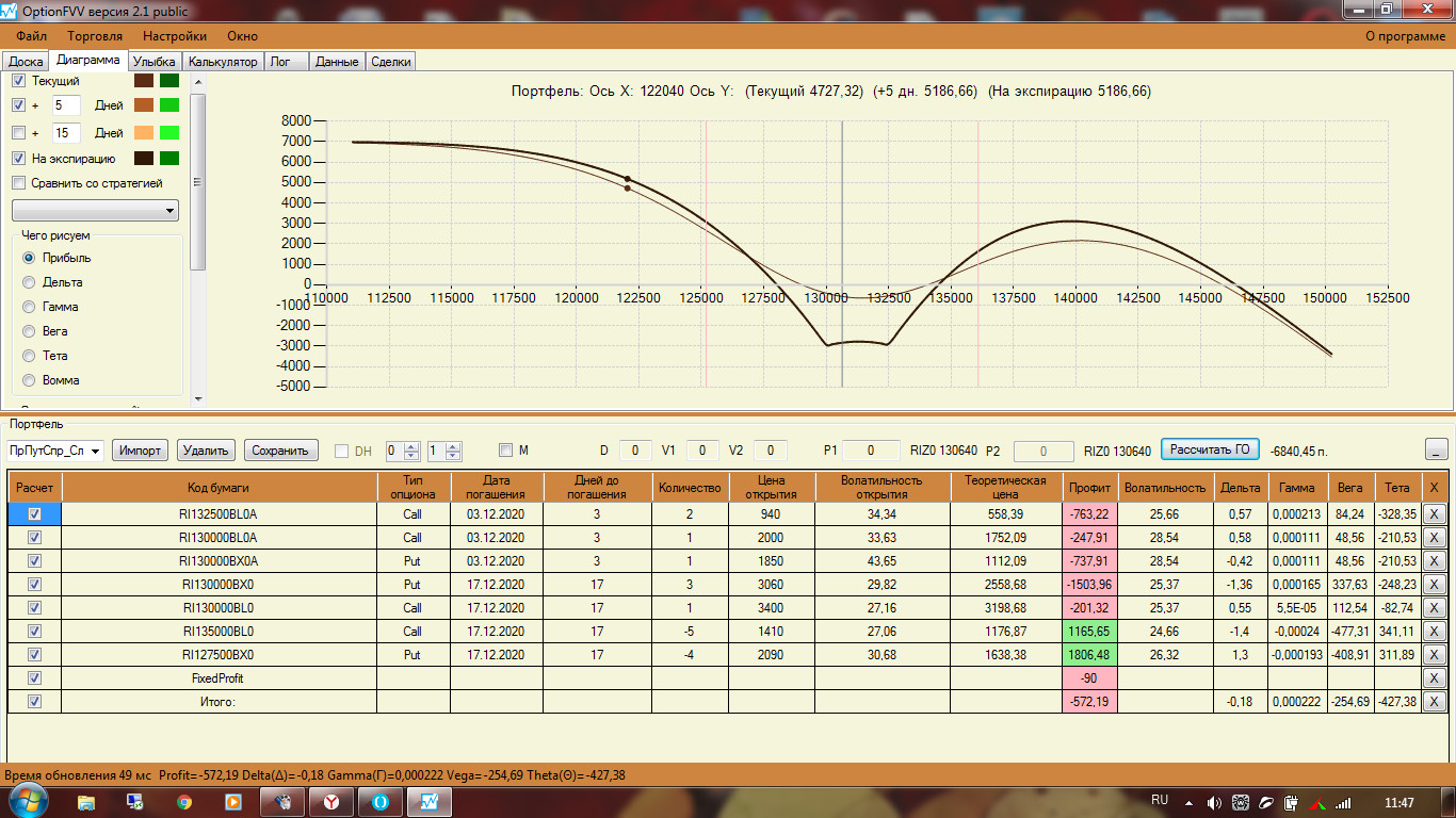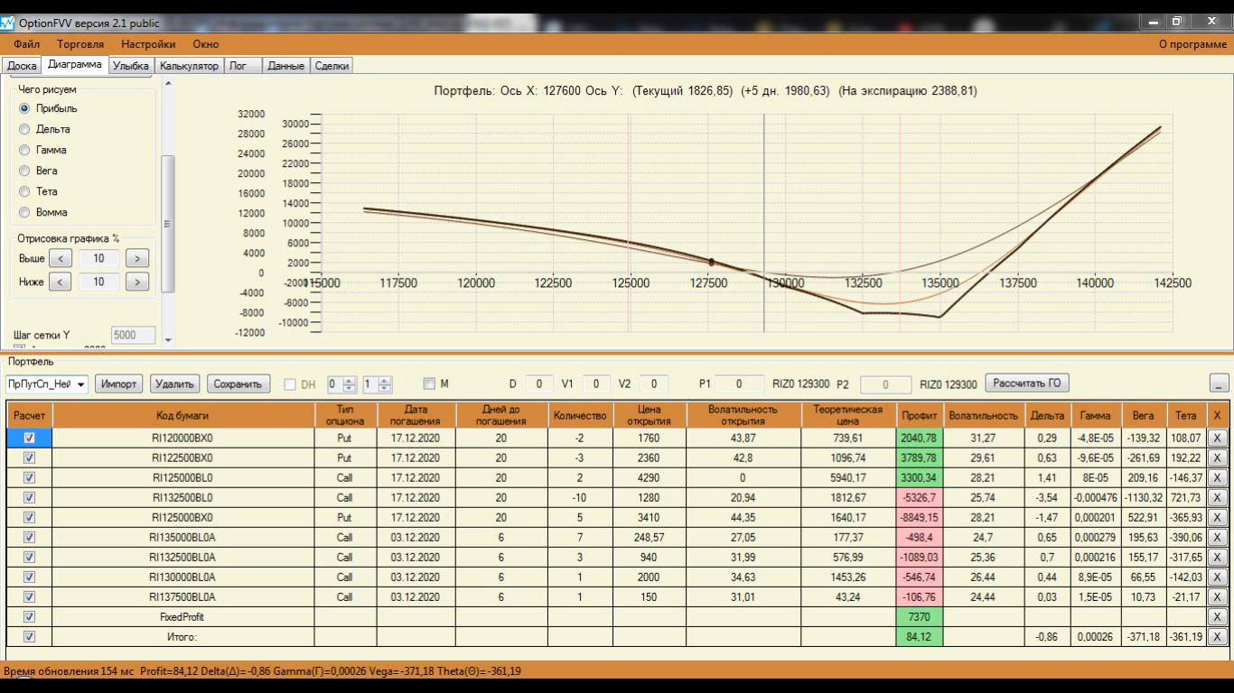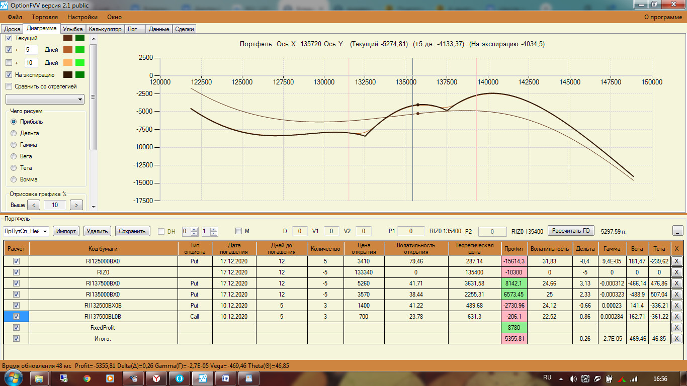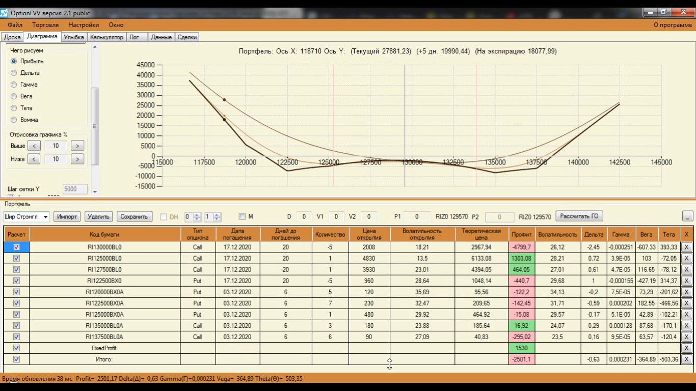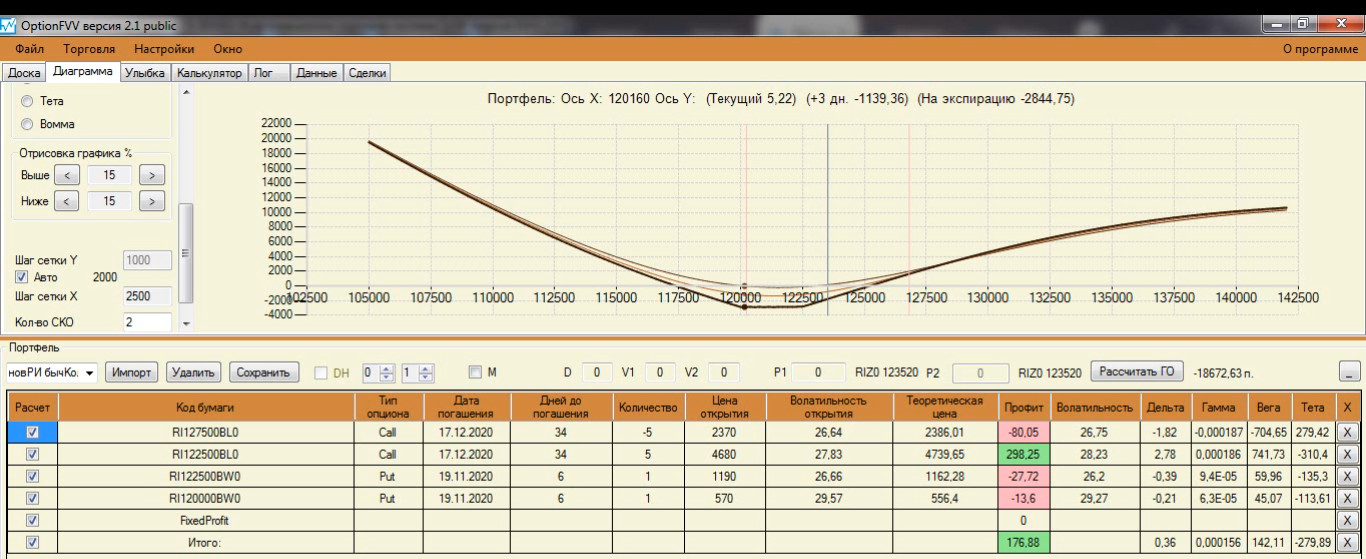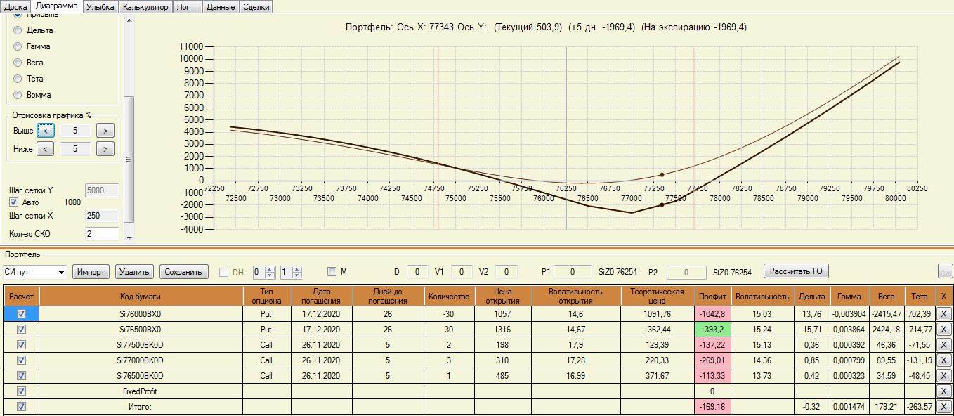 Вообще,.. 2 числа, перед выборами и перед выходным, я страховку сделать к сожалению не успел. Страховочным опционам, на тот момент, оставалось жить ещё 3 дня... И пришлось мне "быстренько" делать страховки (конечно виртуально, в Аналитике) на закрытом ещё рынке утром 5 числа , что было не совсем корректно по ценам опционов, волатильности и т.д., но лучше поздно чем никогда. Здесь грешен, - признАюсь! Впредь постараюсь не допустить, тем более на реальных сделках. Геннадий, жутковатый вид конструкция приобрела утром 5 числа после выборов в США, выходного в РФ, и это НЕ по вине "высыхающих страховых опционов", а по причине сильно "вздувшейся" волатильности на страхах толпы после выборов и перед открытием рынка ФОРТС. Таким образом у проданного стрэнгла временная линия профиля сильно "нырнула" вниз, в минус, опустив и линию страховочных опционов - поэтому и получился жутковатый вид у конструкции.