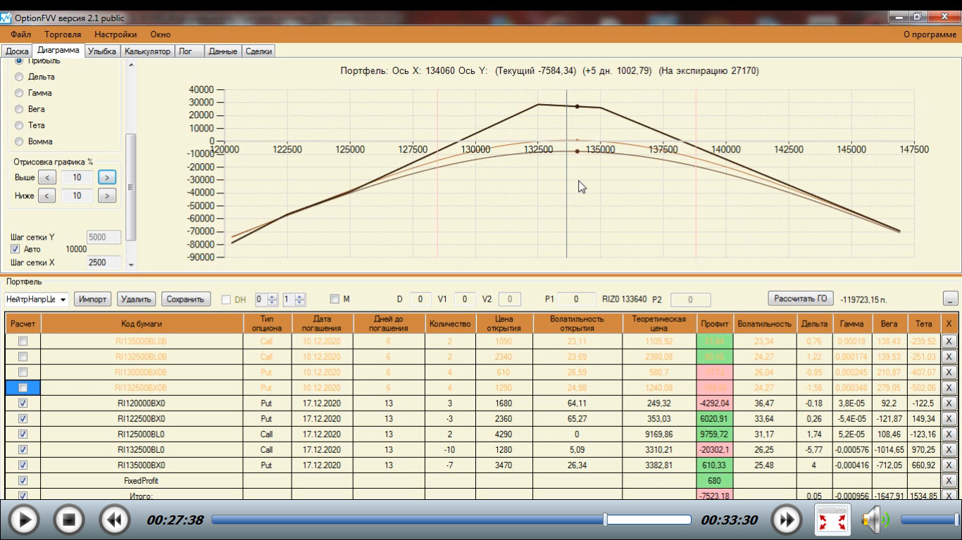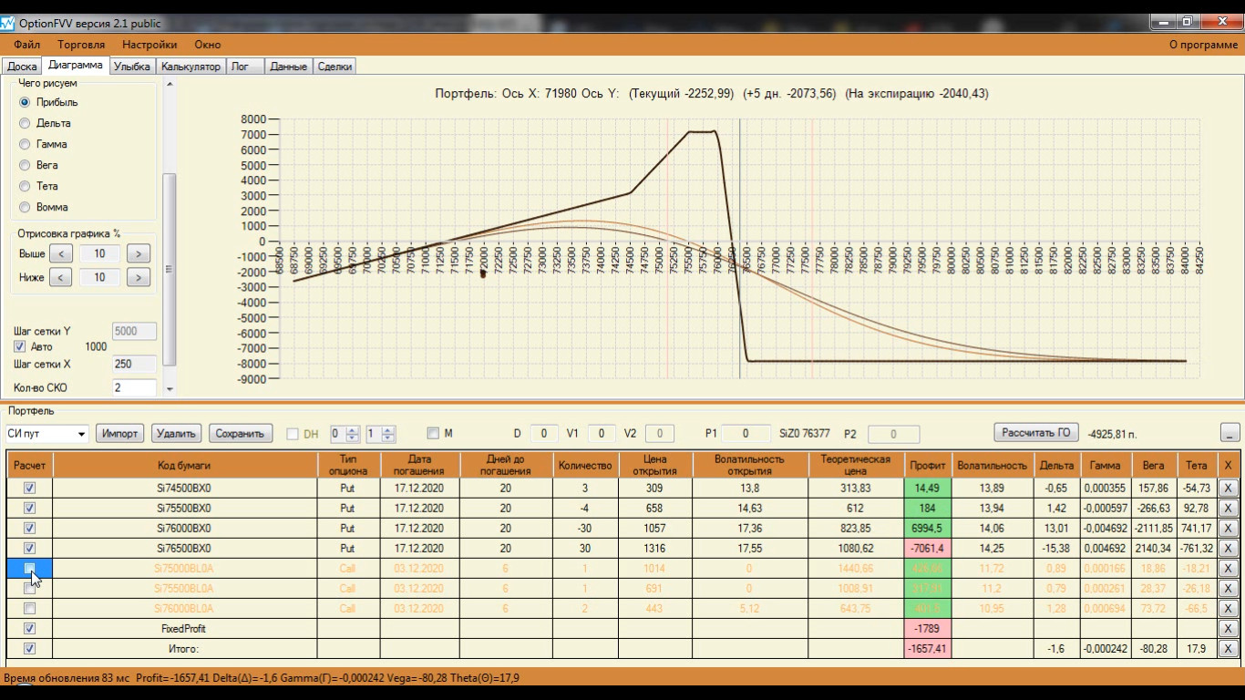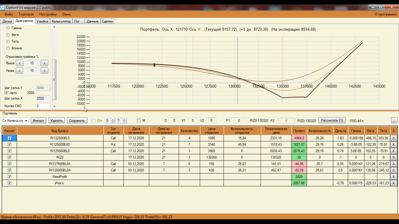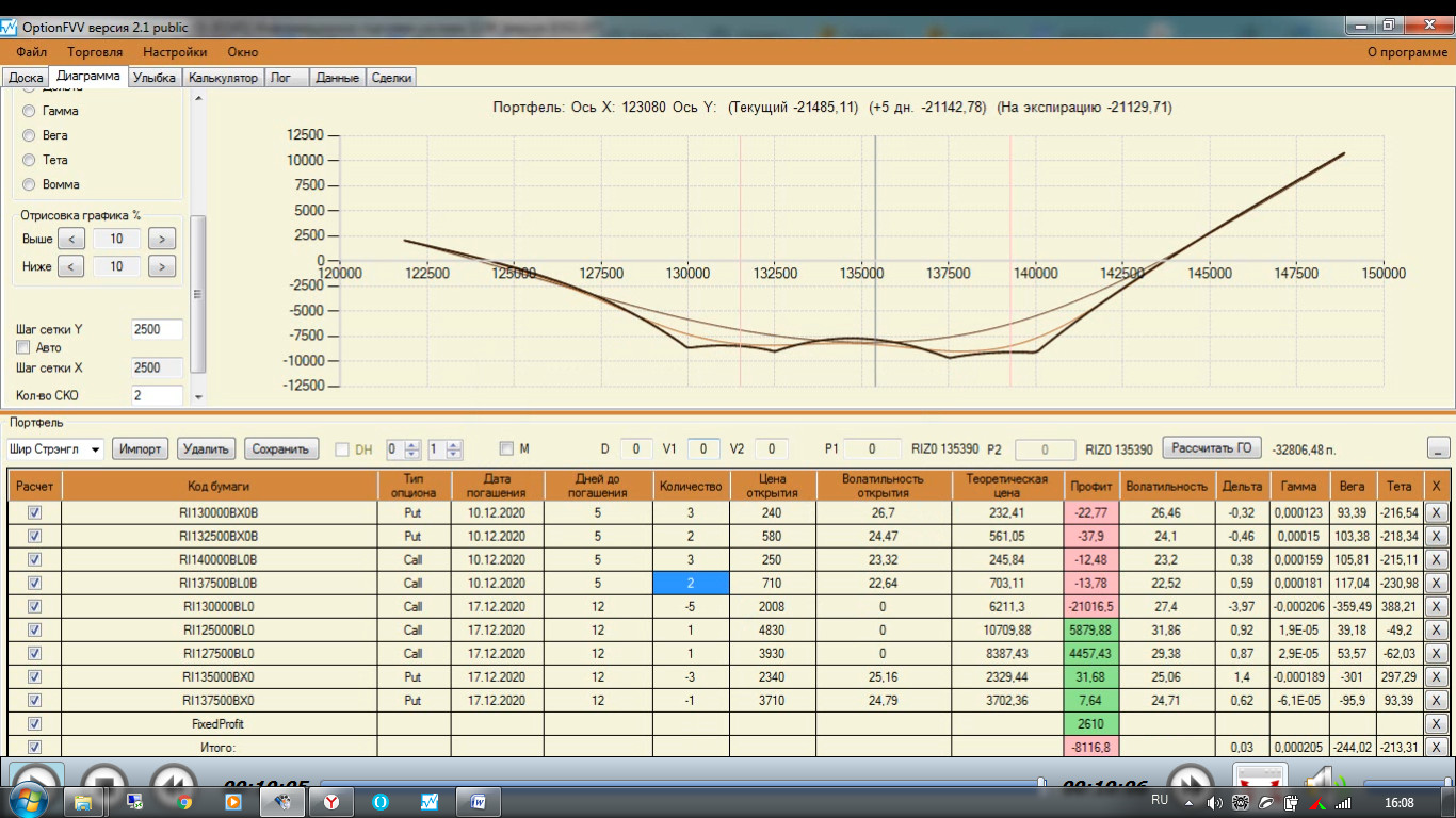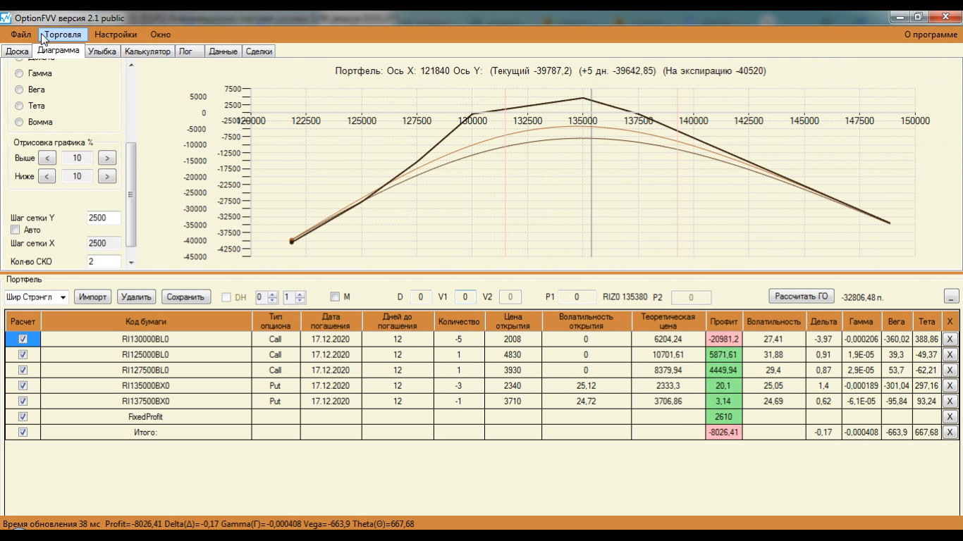 Вообще,.. 2 числа, перед выборами и перед выходным, я страховку сделать к сожалению не успел. Страховочным опционам, на тот момент, оставалось жить ещё 3 дня... И пришлось мне "быстренько" делать страховки (конечно виртуально, в Аналитике) на закрытом ещё рынке утром 5 числа , что было не совсем корректно по ценам опционов, волатильности и т.д., но лучше поздно чем никогда. Здесь грешен, - признАюсь! Впредь постараюсь не допустить, тем более на реальных сделках. Геннадий, жутковатый вид конструкция приобрела утром 5 числа после выборов в США, выходного в РФ, и это НЕ по вине "высыхающих страховых опционов", а по причине сильно "вздувшейся" волатильности на страхах толпы после выборов и перед открытием рынка ФОРТС. Таким образом у проданного стрэнгла временная линия профиля сильно "нырнула" вниз, в минус, опустив и линию страховочных опционов - поэтому и получился жутковатый вид у конструкции.