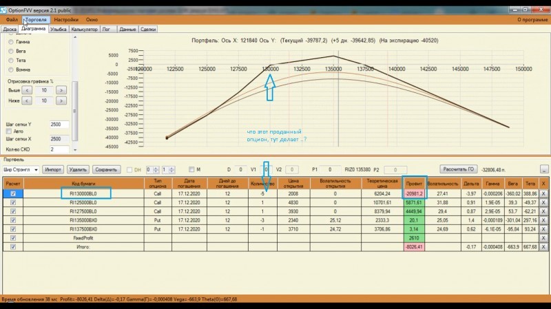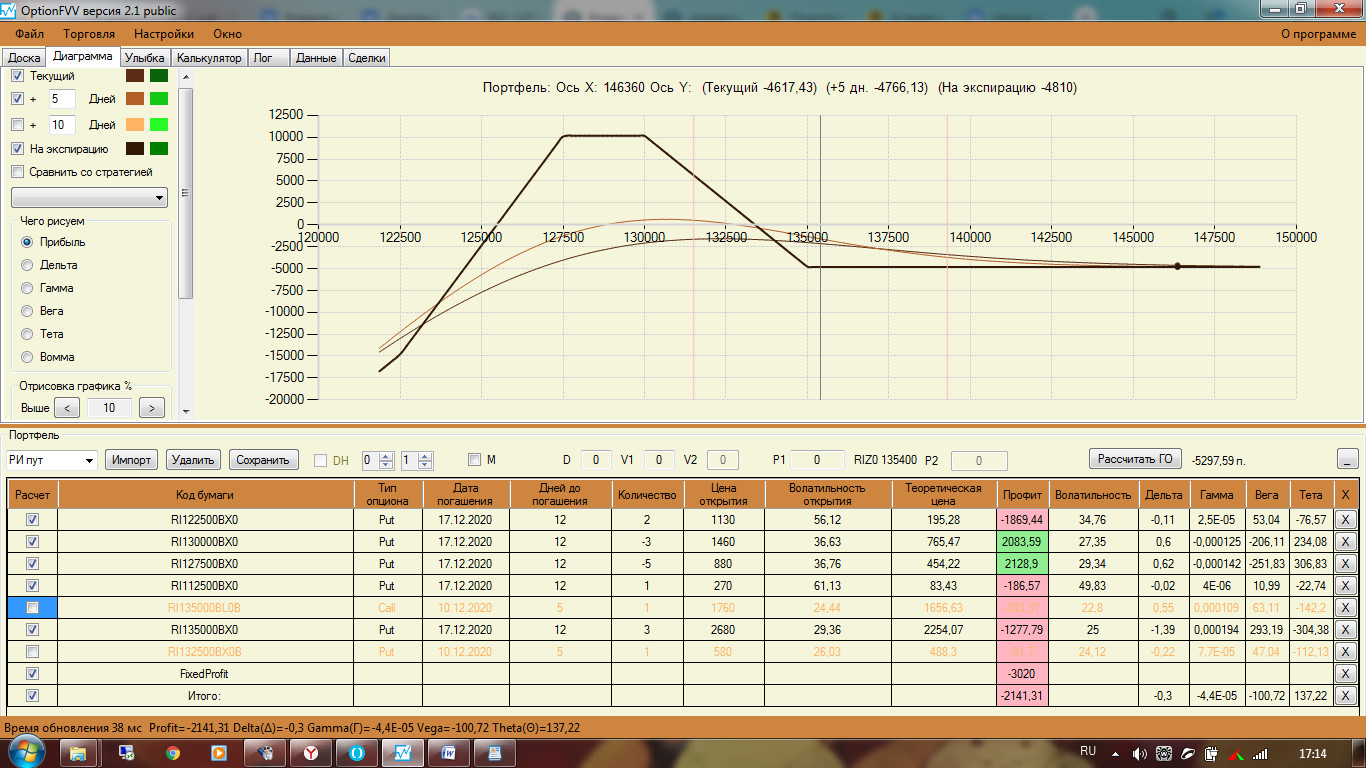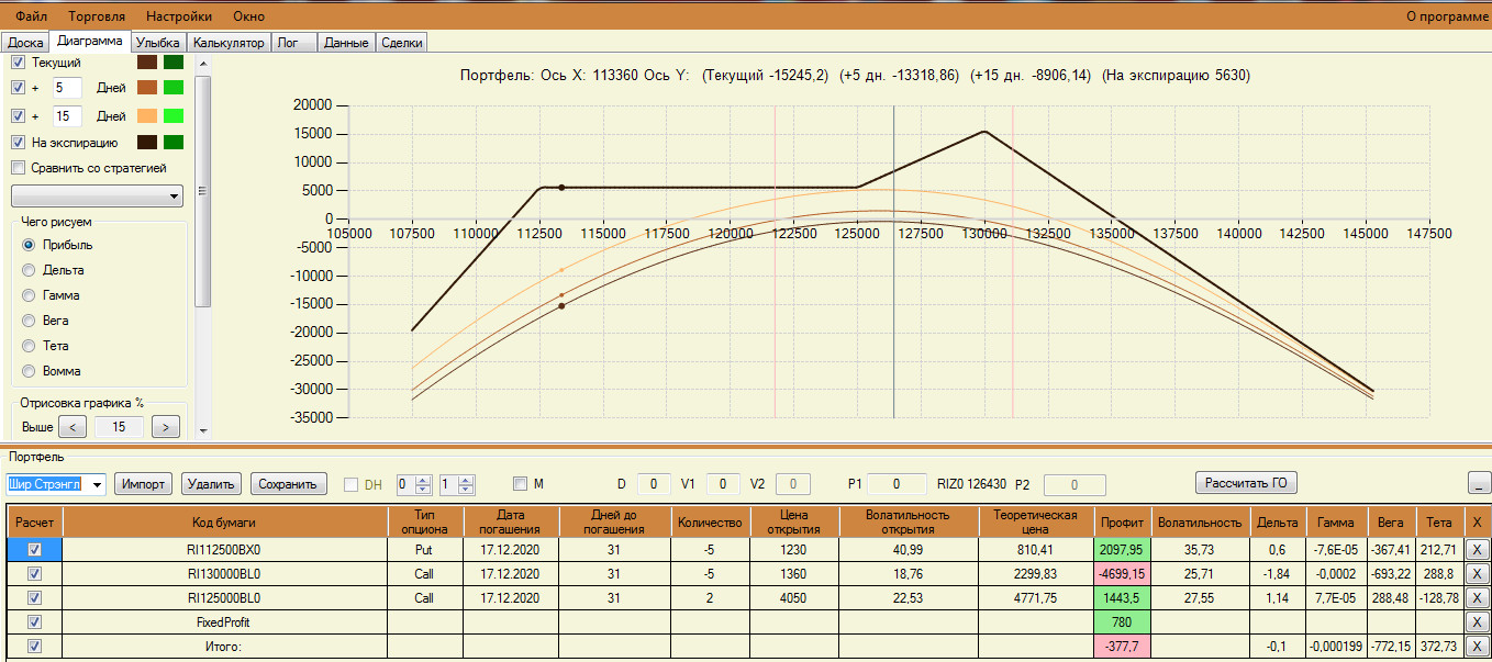 3) Широкий Стрэнгл (17.12) - продолжаю управлять, и он показывает - 2501 п. (худший результат) - никак не хочет "плюсовать", жду что РИ сменит тренд на нисходящий, и тому есть основания (сигнал на ключевом уровне 130700 ) и цена наконец снова зайдёт внутрь конструкции от опасного правого края 130.