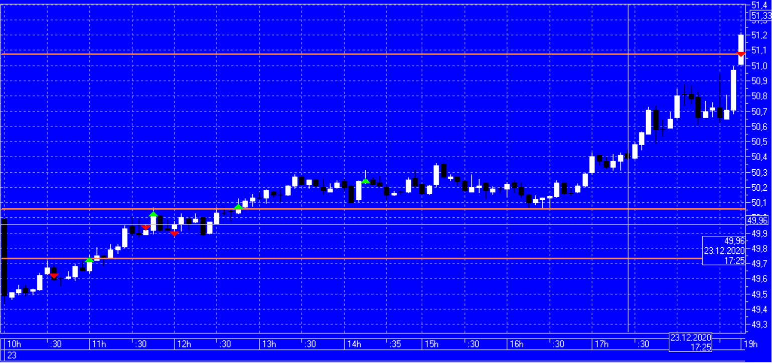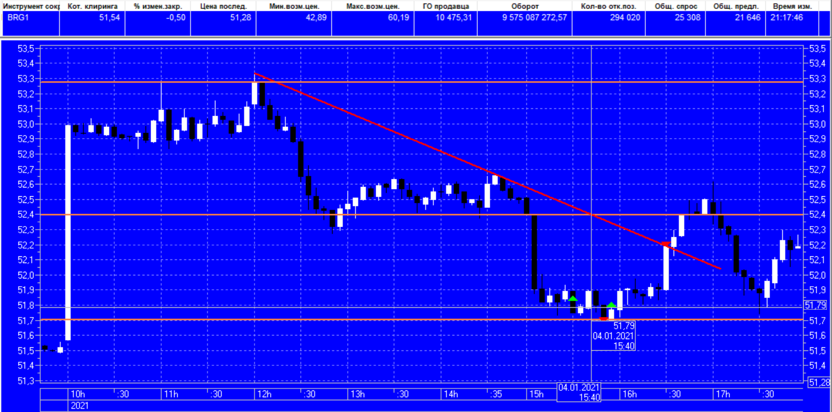 Потом, когда цена дошла до следующего уровня и начала отбиваться, купил 1 фьючерс по 51,93 против своей позиции. Фьчерс до цели не дошел и при возобновлении движения начал приносить мне убыток (надо было его закрыть по безубытку, протупил).