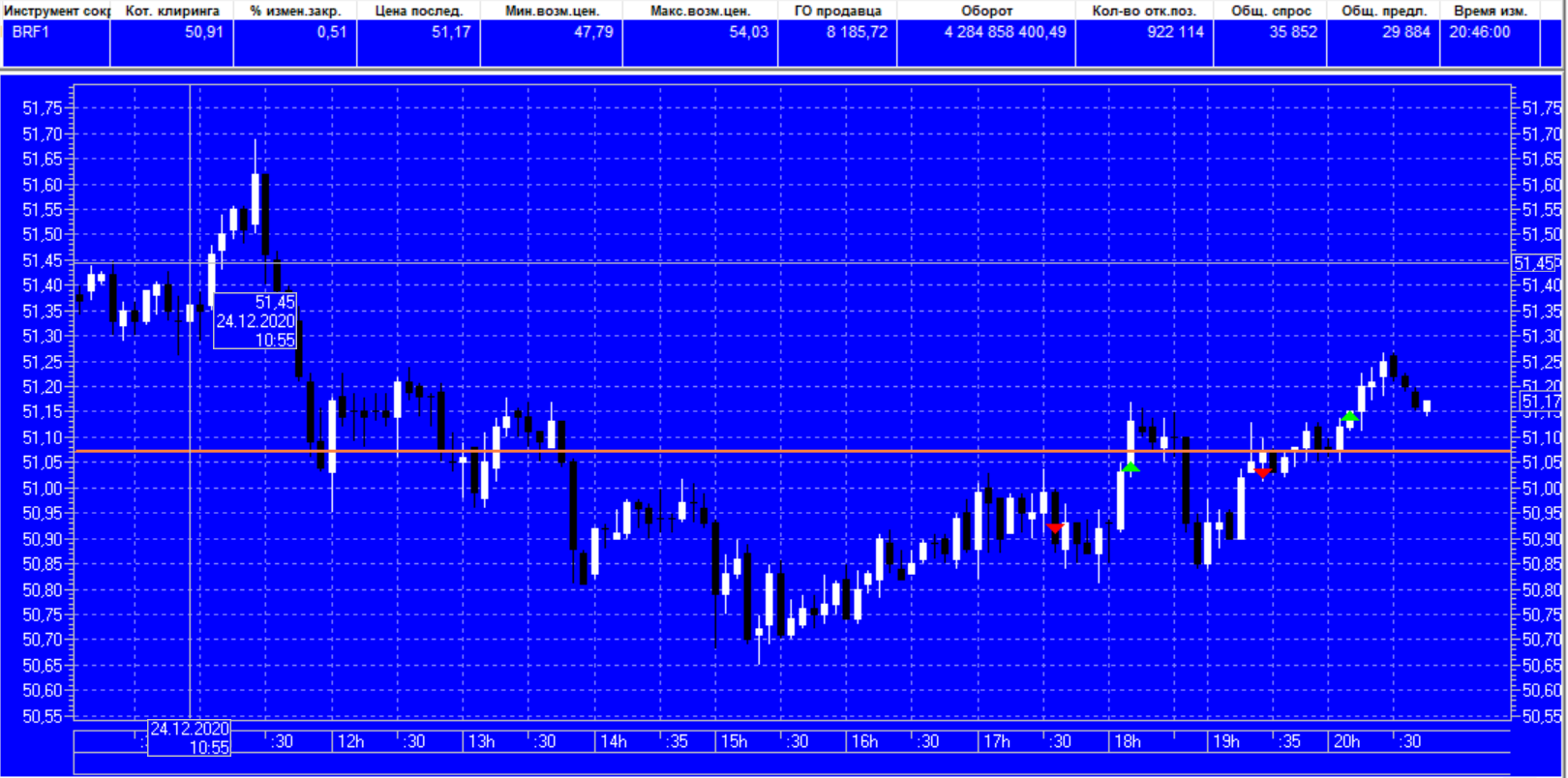 Закрыл 3 пута по цели по 0,86. Еще два решил оставить. В итоге, видя, что фьючерс приносит убыток, но при этом хорошо отскочил, и оставшиеся путы в приличной прибыли, решил все закрыть. Путы закрыл по 1,10, фьючерс с убытком по 51.41.
