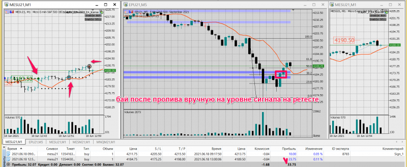 06/07/21 идея- выкуп после пролива тп-+1000 микро. До сих пор затруднение с определением точки входа в лонг, проще говоря, закончен пролив или нет. Объемы смотрю, тайминг тоже, но рано пытаюсь зайти, Не могу поймать для себя эту совокупность, чтобы и не проворонить разворот, и рано не зайти.